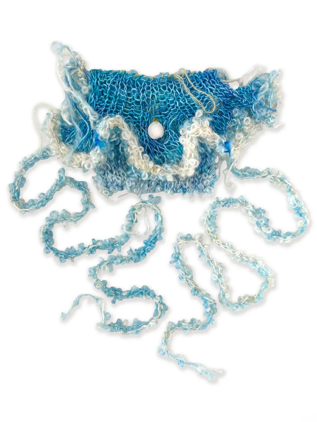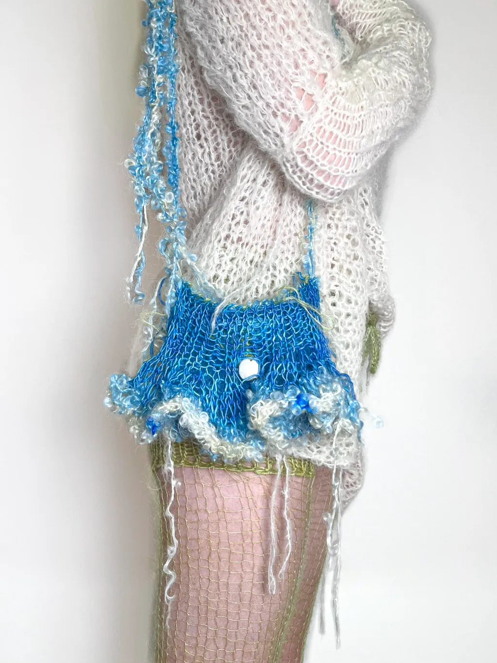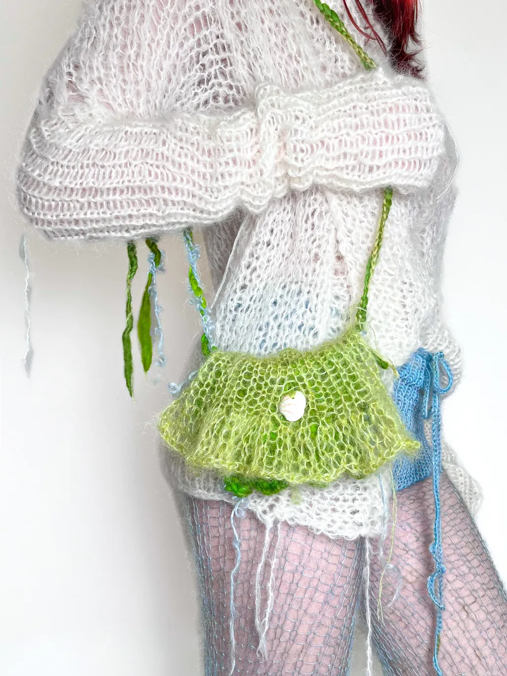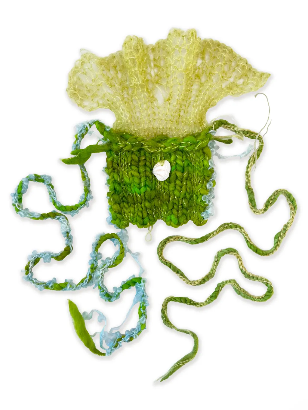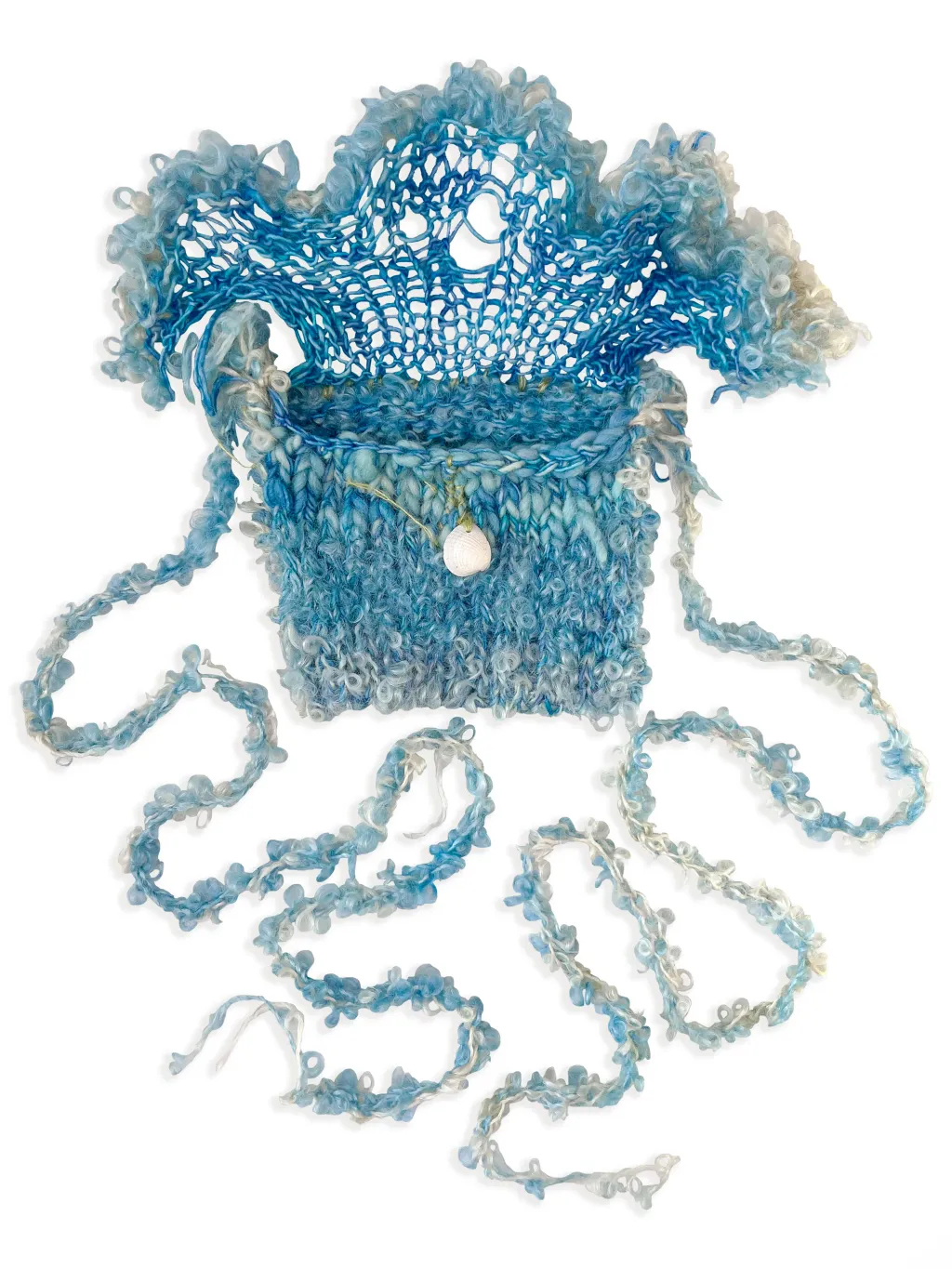 Hand-knit bag with ruffled flap and long handles. The bag is finished with a tiger lucine shell, used as a button closure.