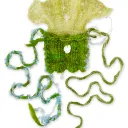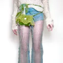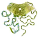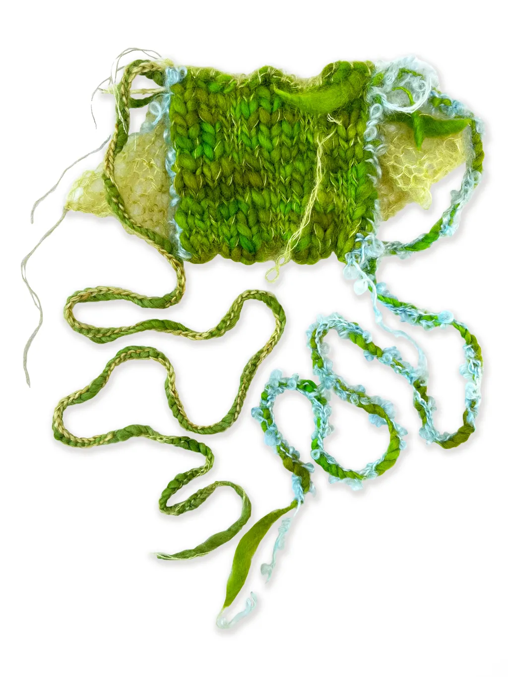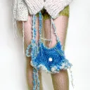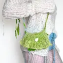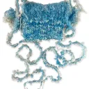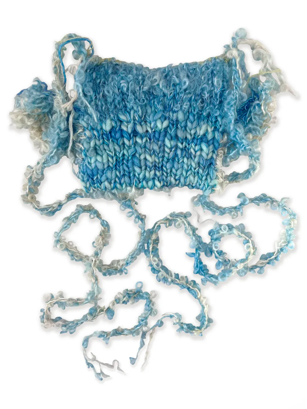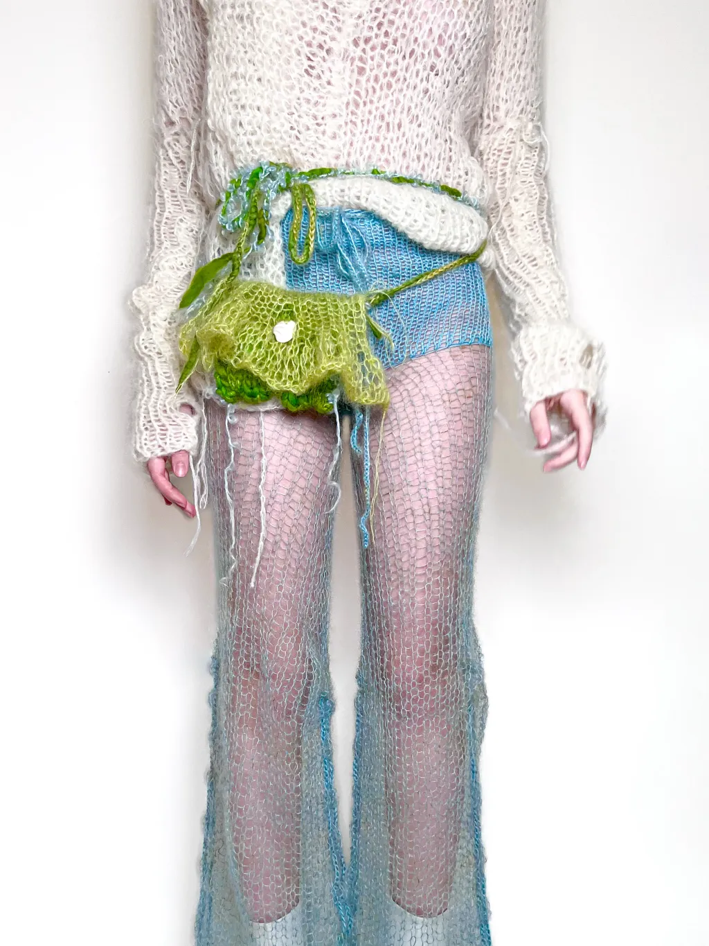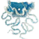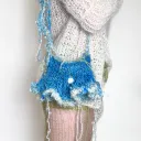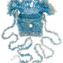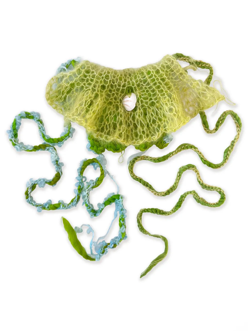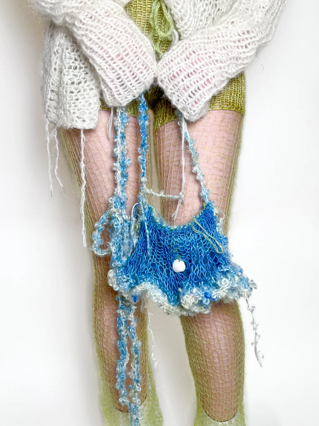 Hand-knit bag with ruffled flap and long handles. The bag is finished with a tiger lucine shell, used as a button closure.