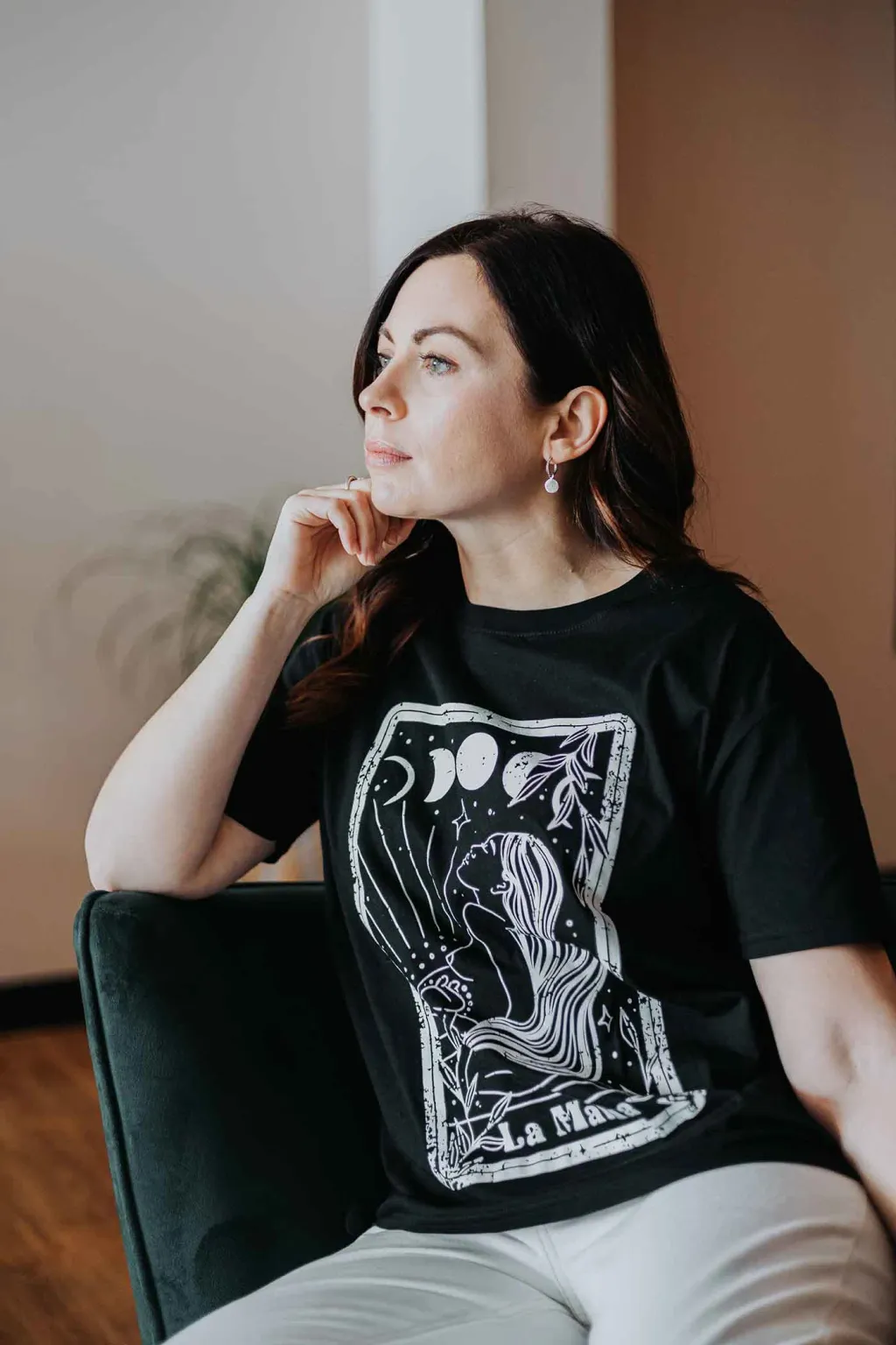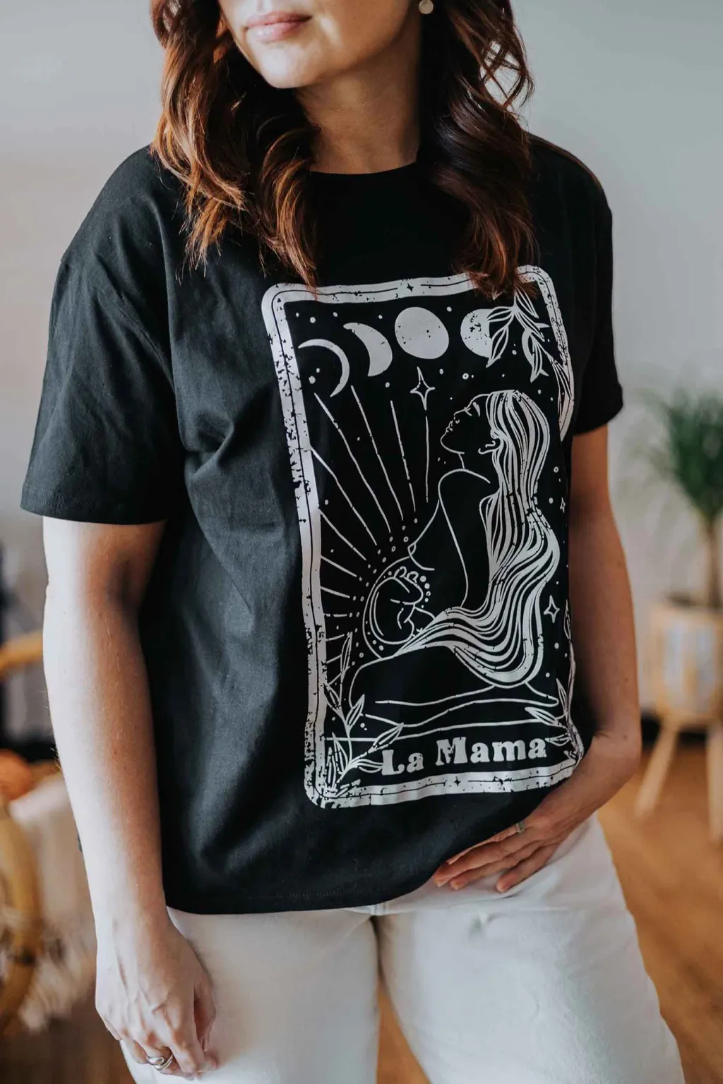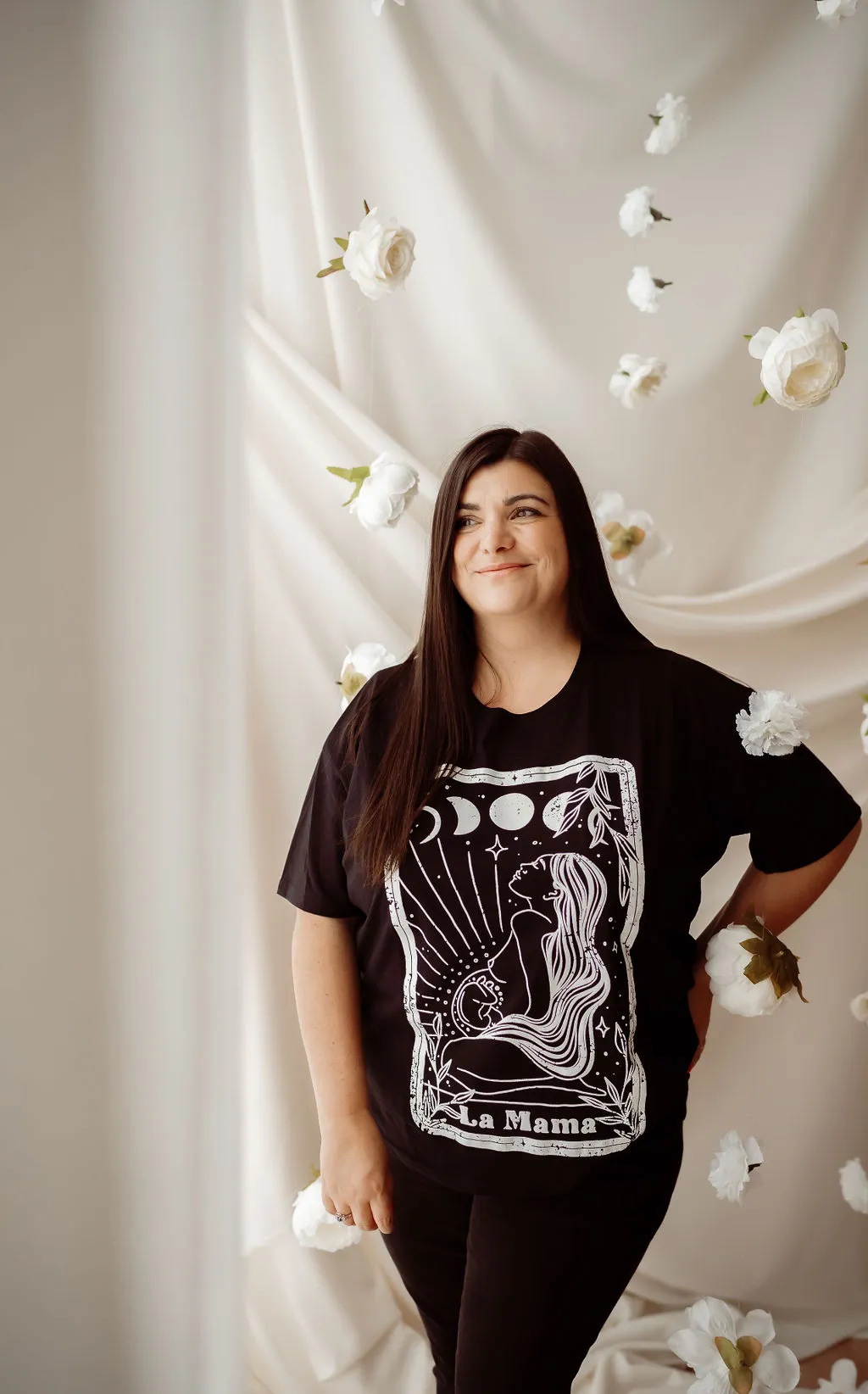 La Mama is our signature T-shirt. It embodies our vision of femininity, motherhood and quite simply, life. Its bohemian touch represents our unique style and its cut is loose so you can wear it when you want and how you want!