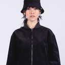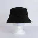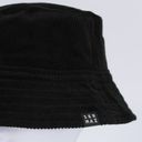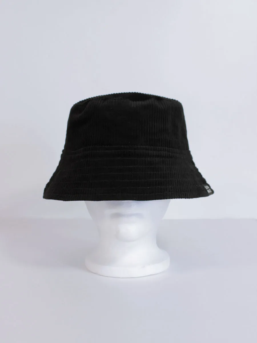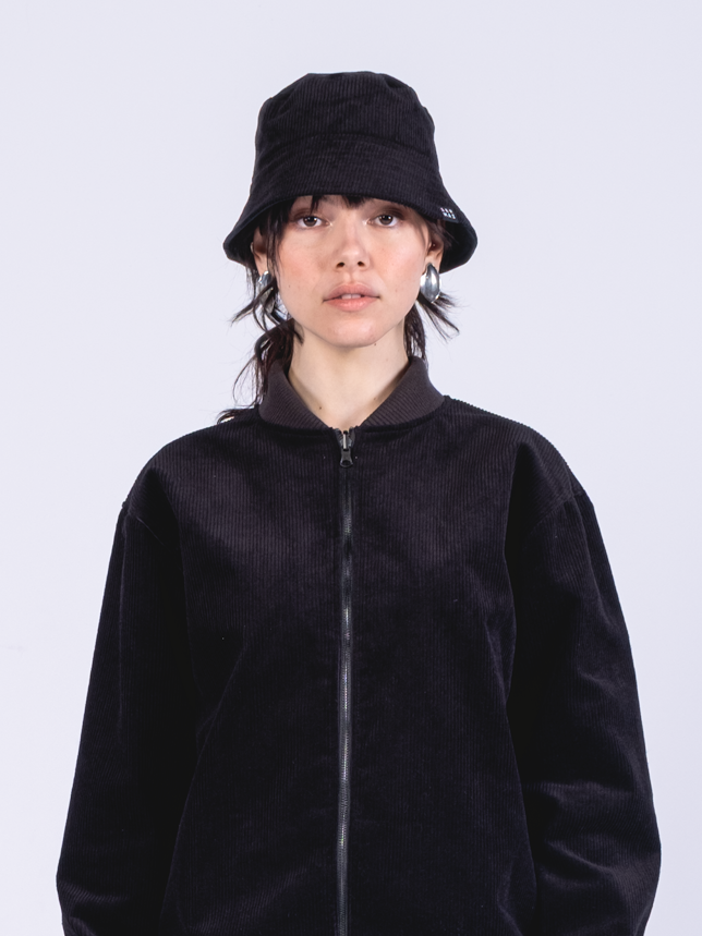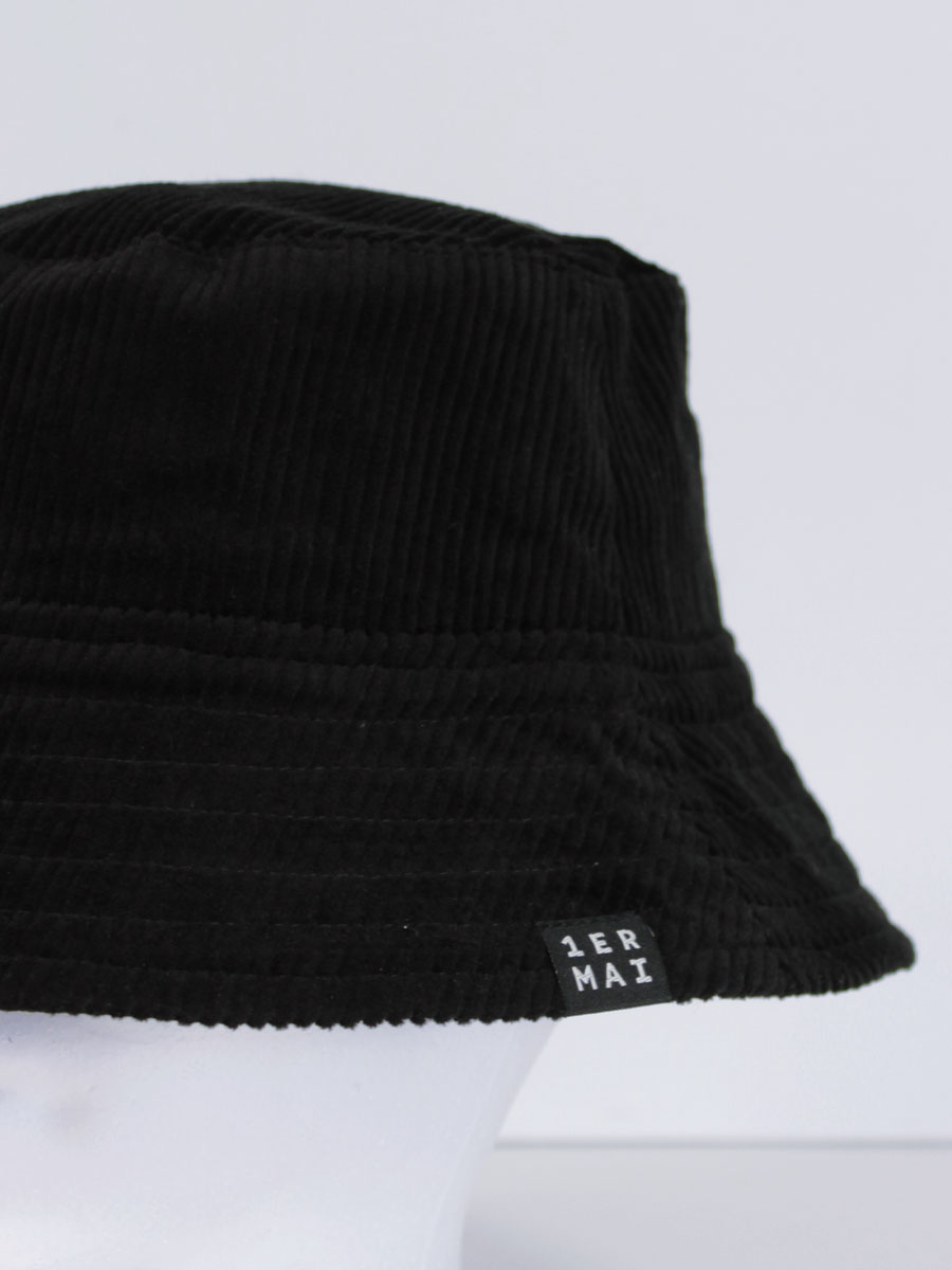 This bucket hat is made in black corduroy (upcycled). This medium to heavy weight corduroy is soft to the touch and comfortable, yet sturdy. Its distinctive ribbed structure reflects the light in different degrees, varying from jet black to polished charcoal, creating a luxurious texture.