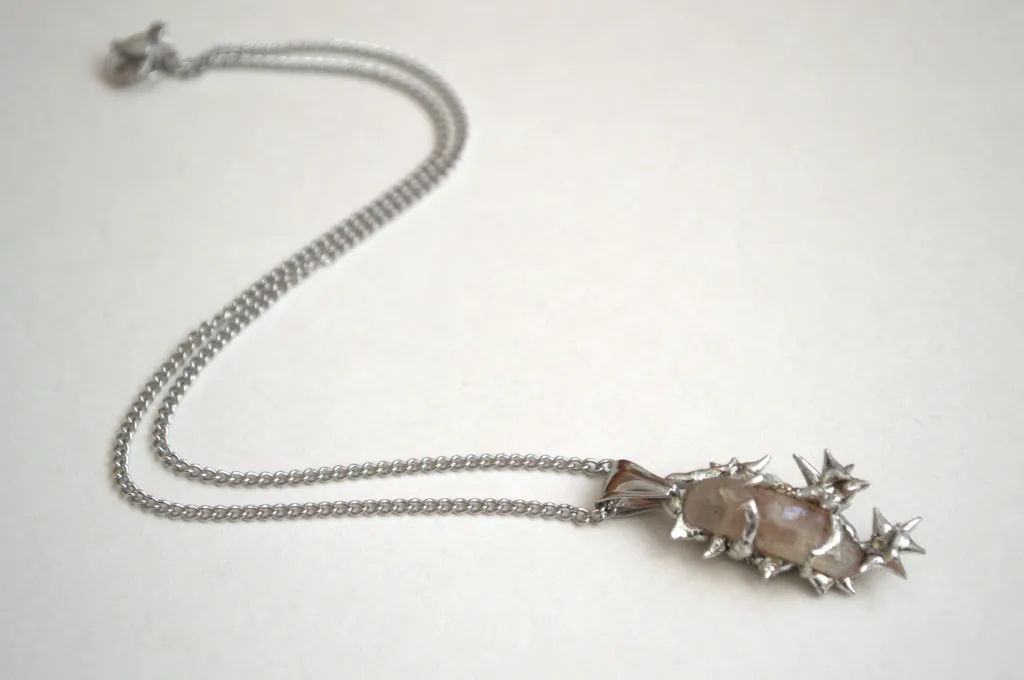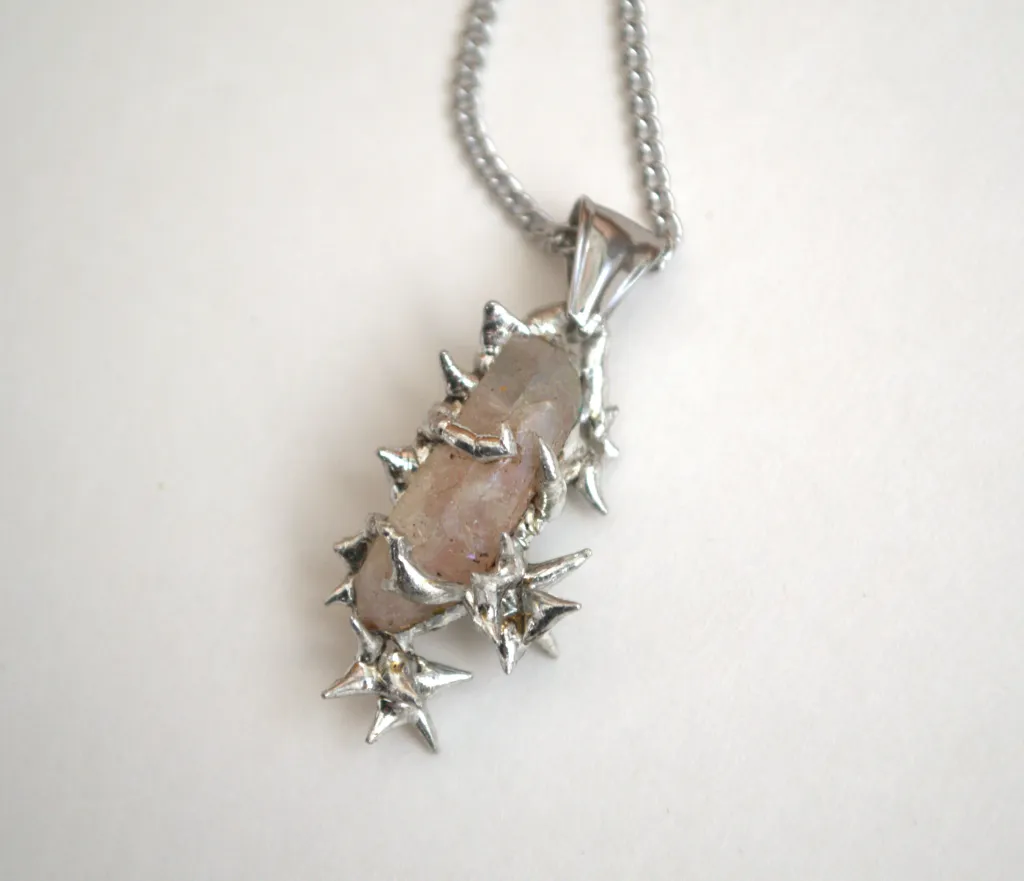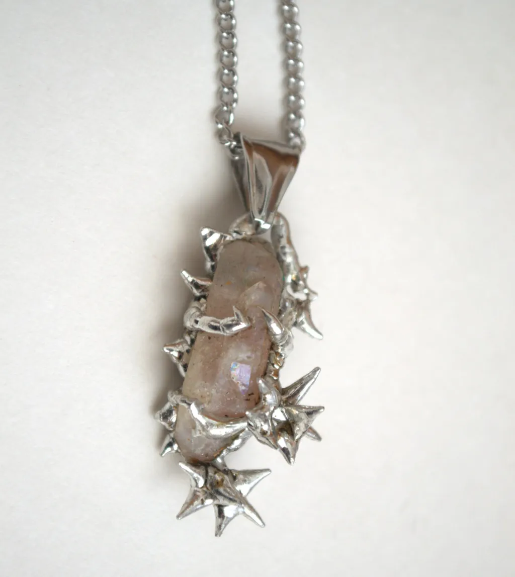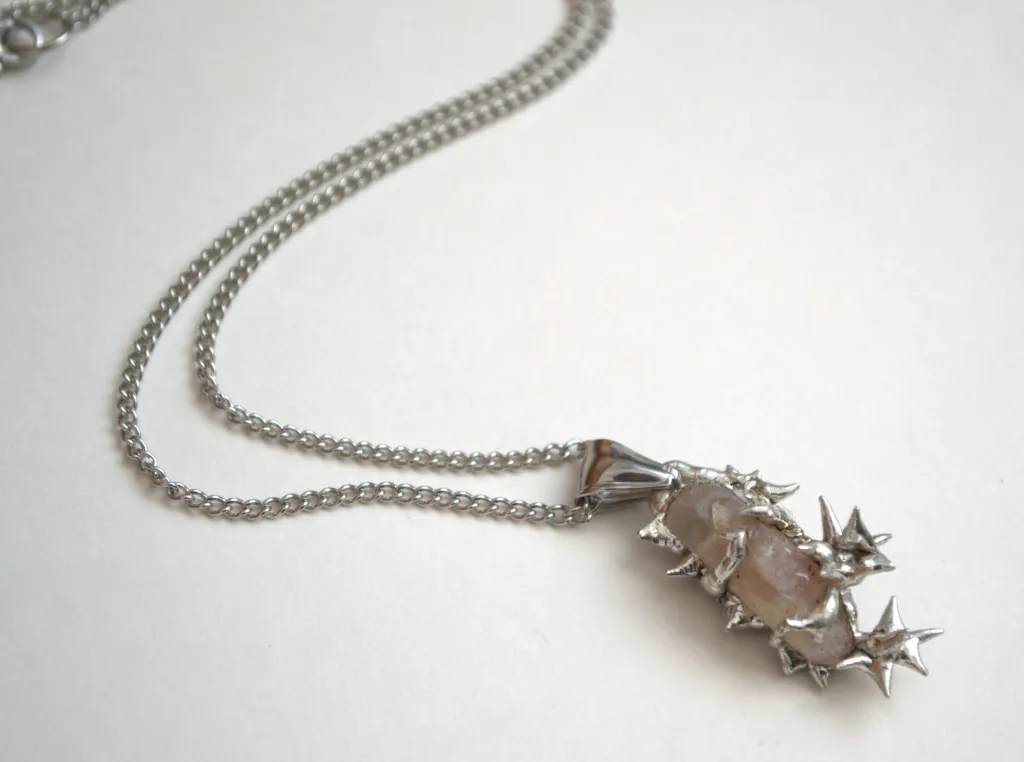 One of one handmade necklace with a crystal pendant covered by metal thorns and roses.