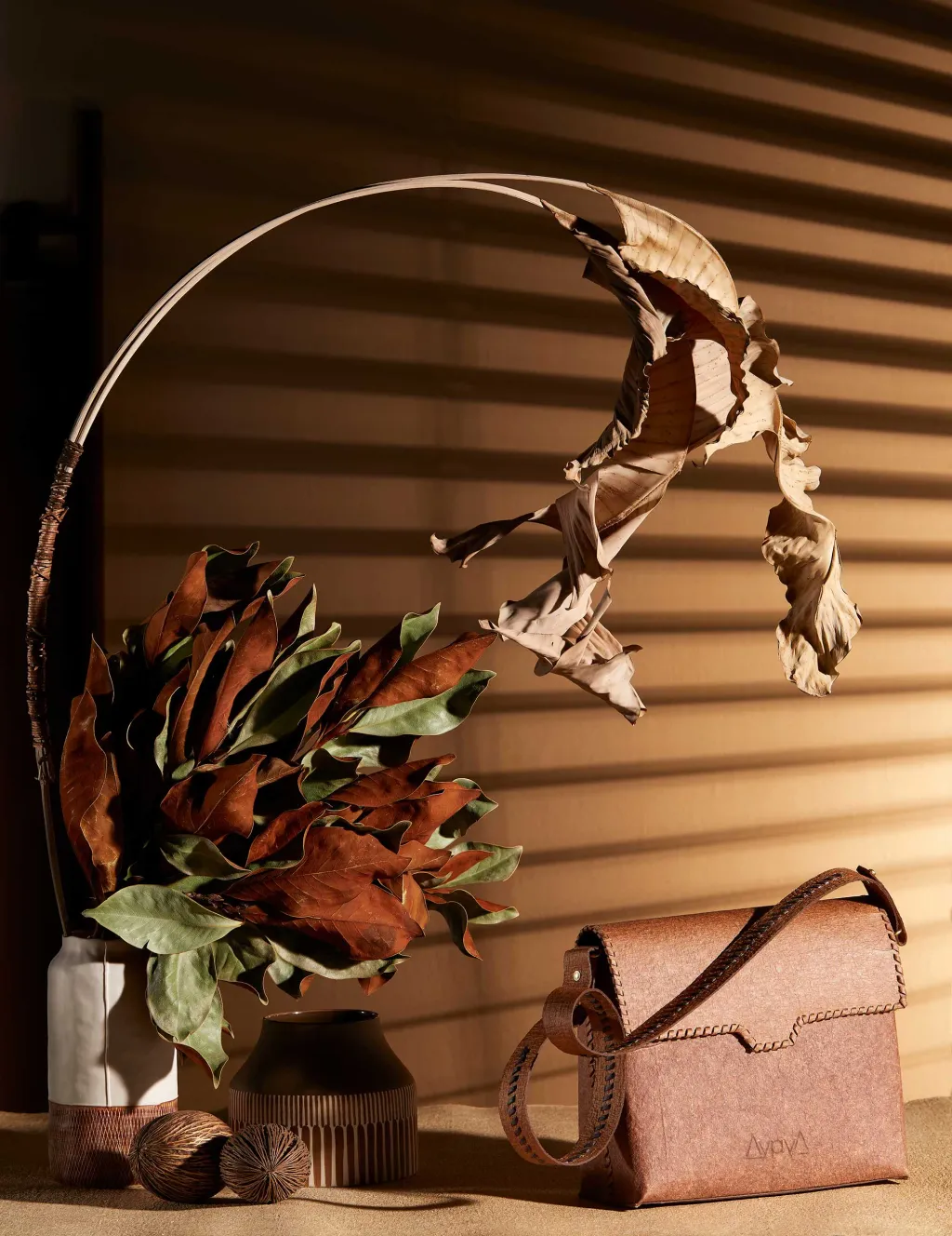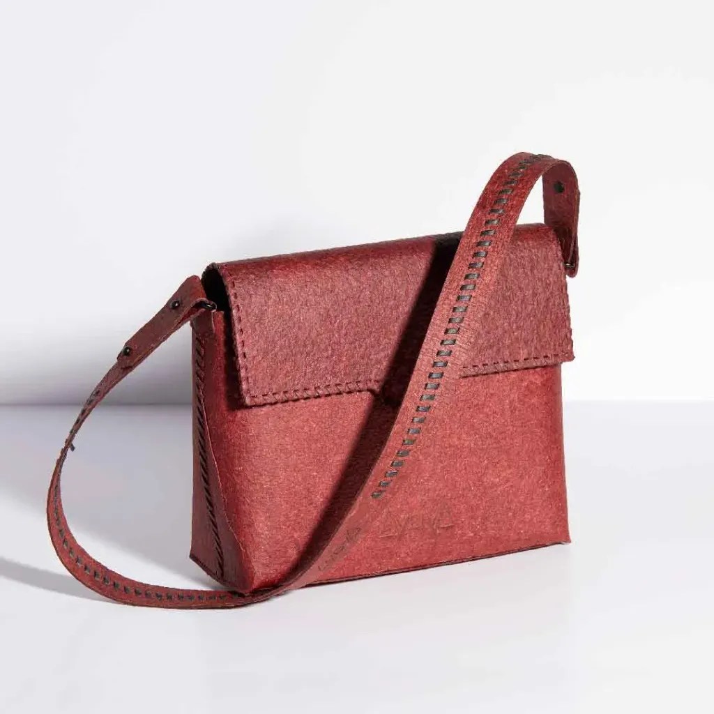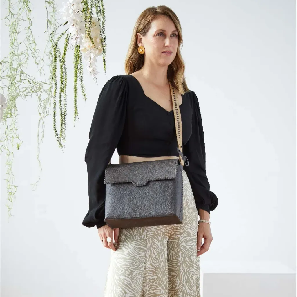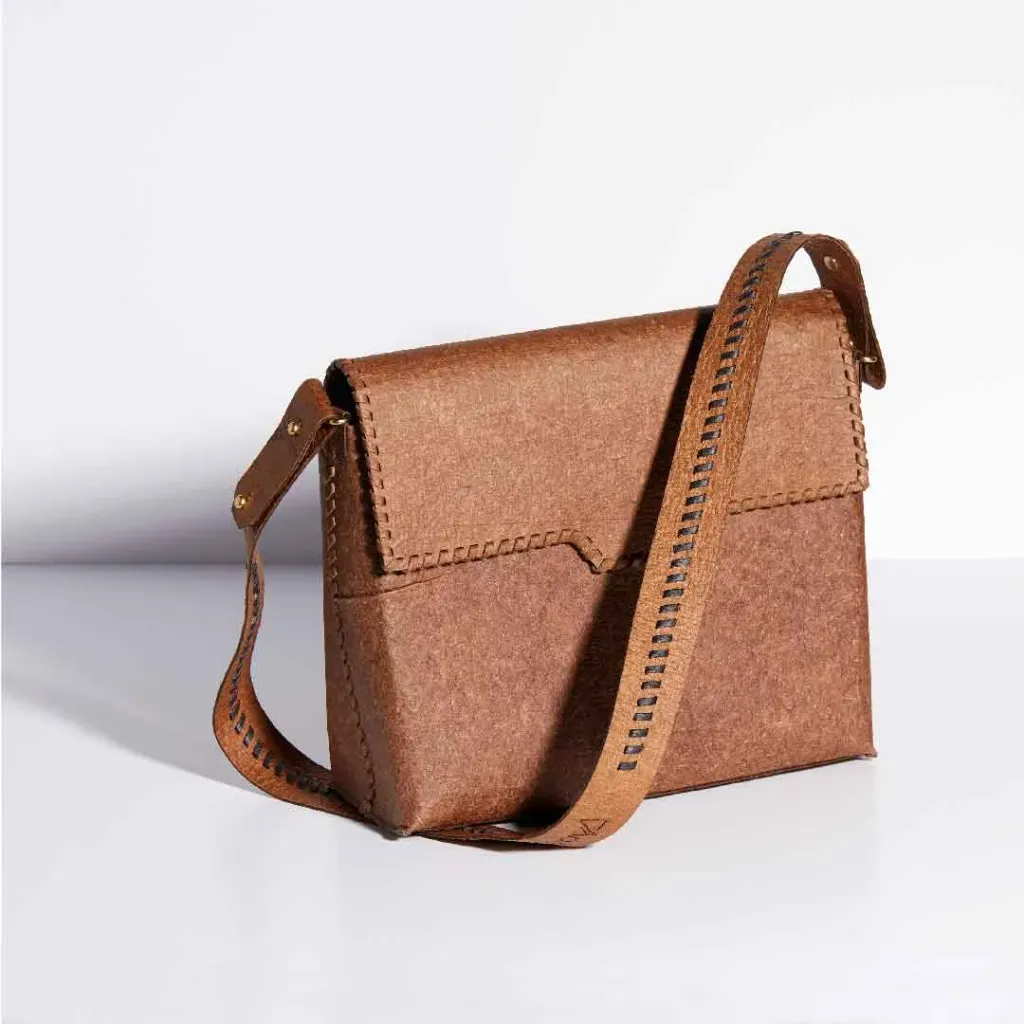 Crossbody satchel purse with an open compartment, an inside pocket and our signature hand lacing along the flap and side seams. Paired with our signature two-toned, hand laced KARIBA strap.