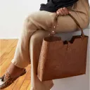 A wide tote with a spacious interior to hold a 17” laptop and plenty of room for all other necessities. Our signature hand lacing along the edges lies flush against the side seam creating a color blocked effect. Finished with our two toned, short NILE handle making it easy to grab and go.