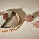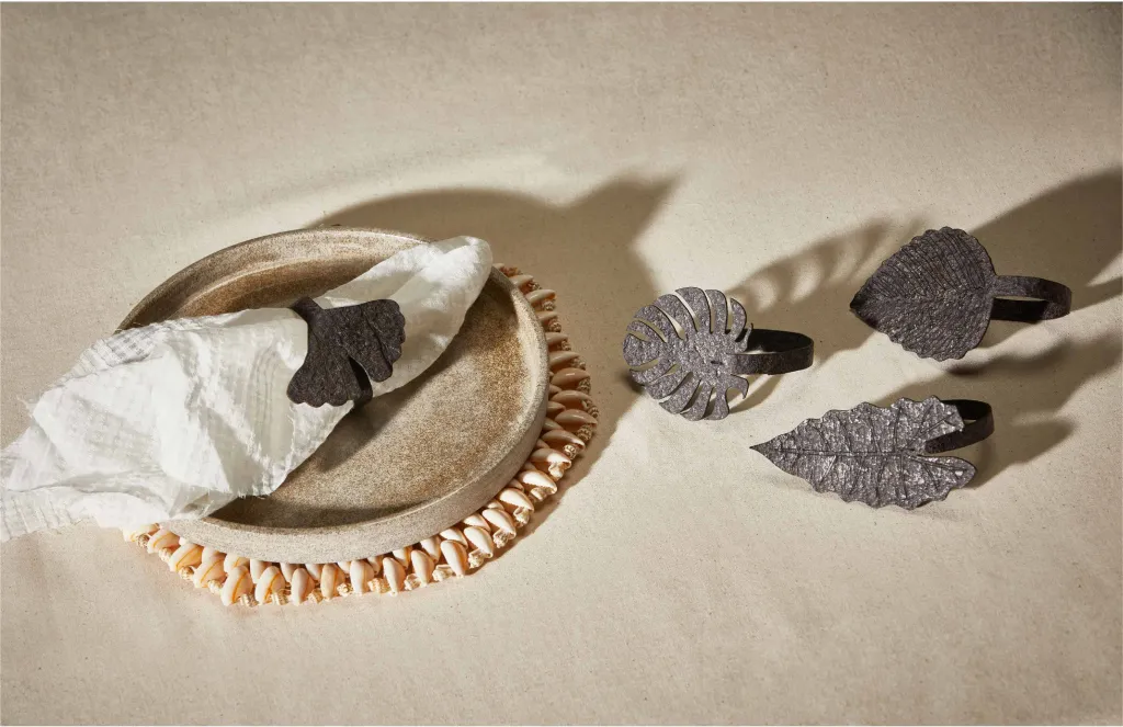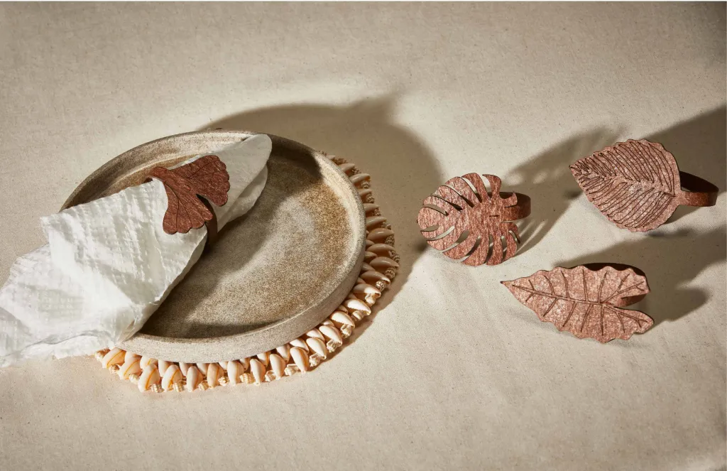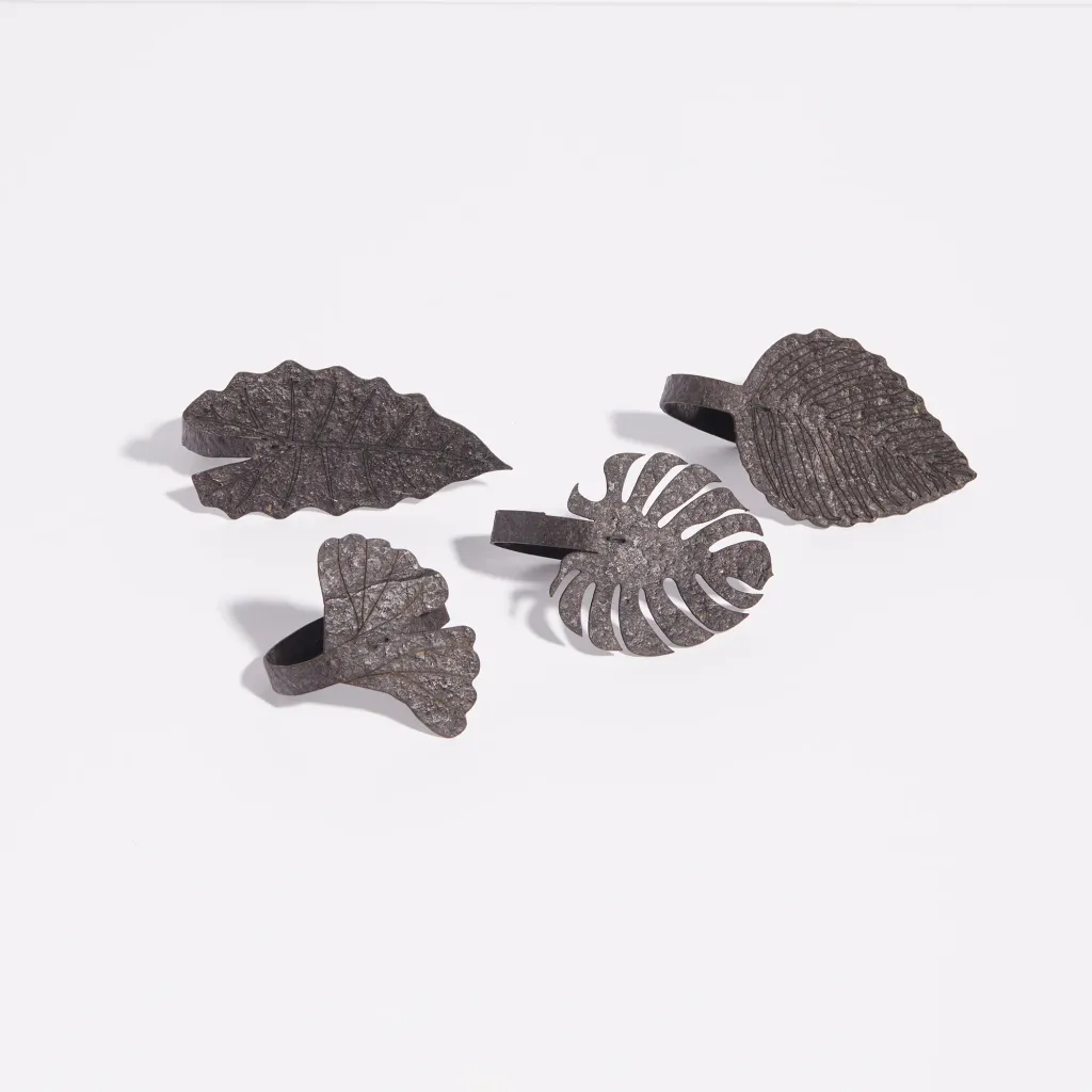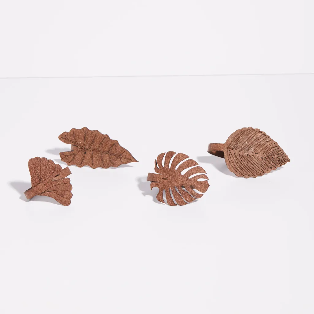 Leaf cut out napkin rings in a set of 4 features different distinctive shapes of philodendron, ash, monstera and ginkgo leaves. Handstitched together by leather artists.