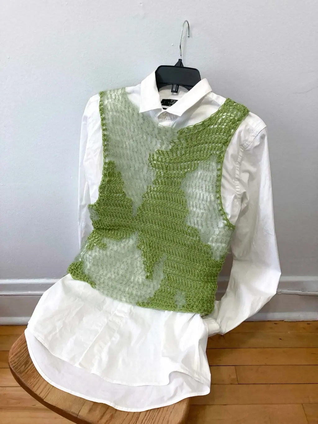 1 of 1 piece. Handmade using two types of yarn creating a unique see-through texture