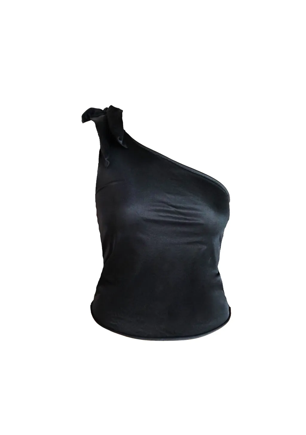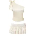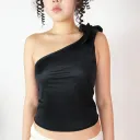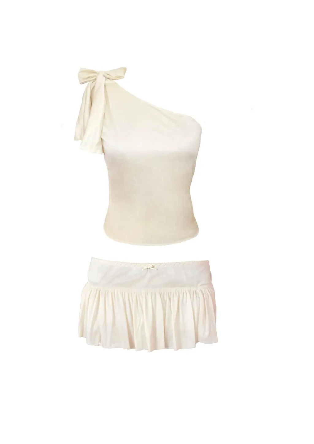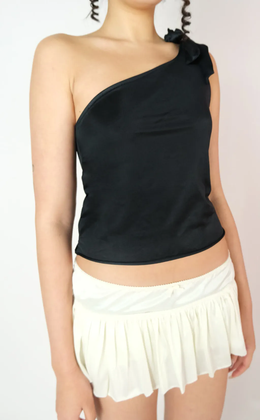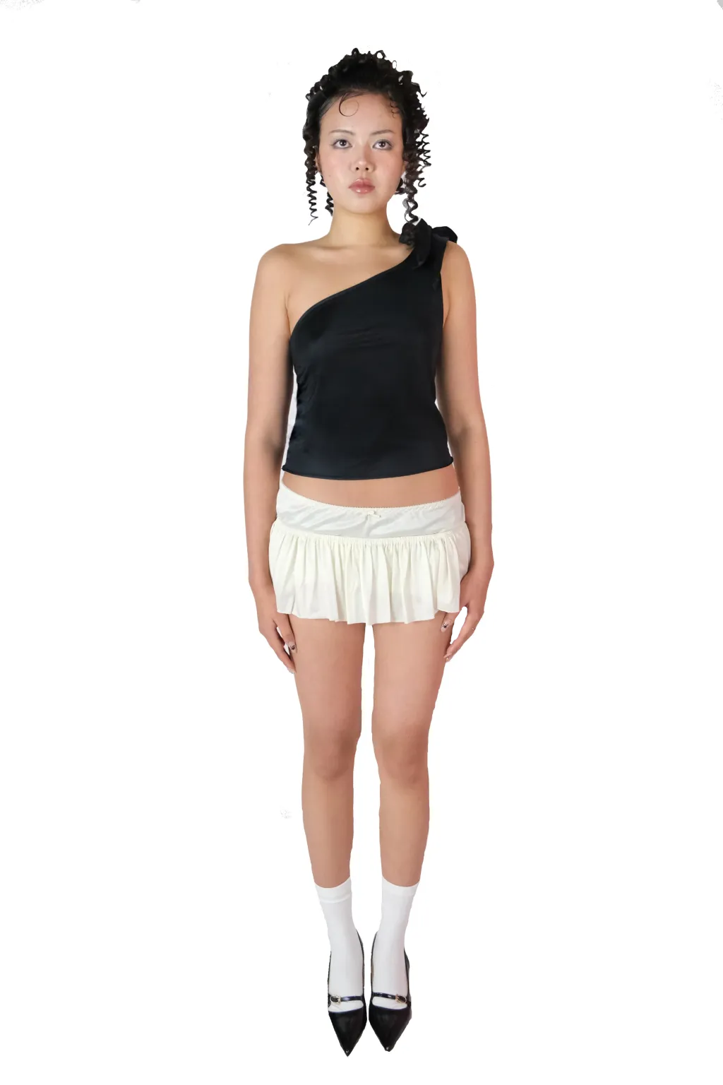 Upcycled satin tank top with asymmetrical neckline & large adjustable bow + satin ruched mini skirt.