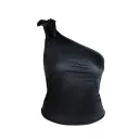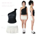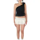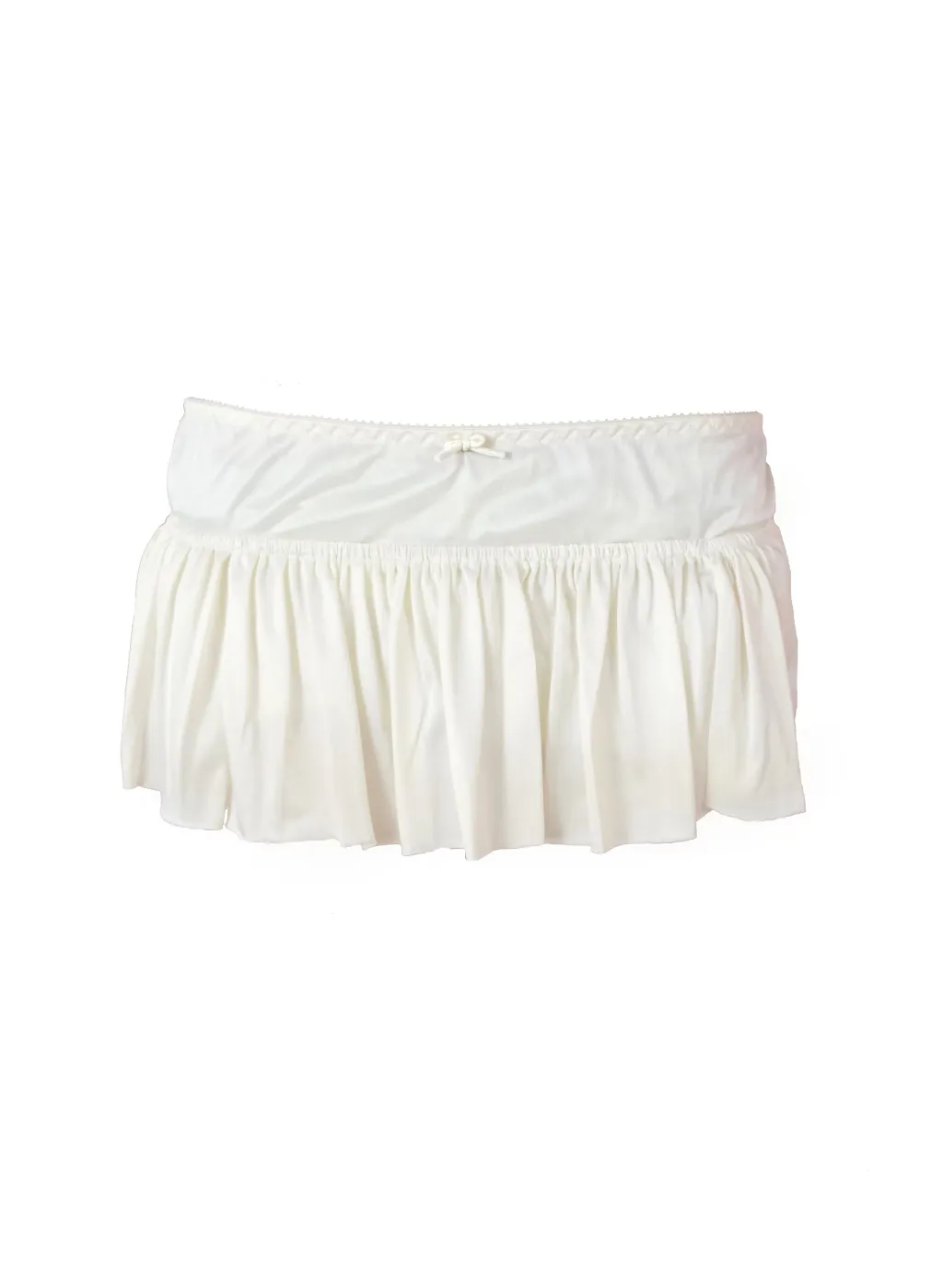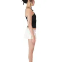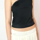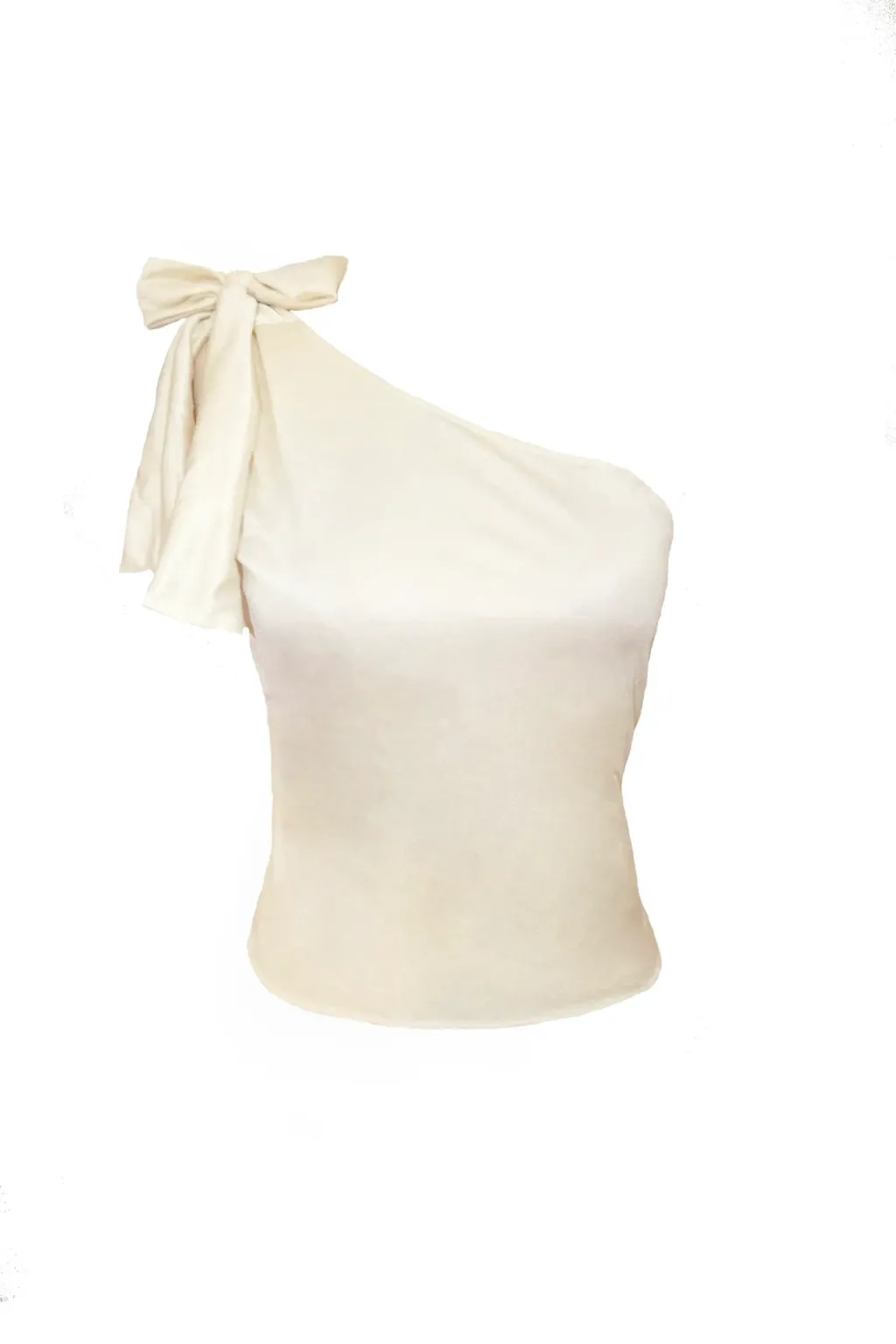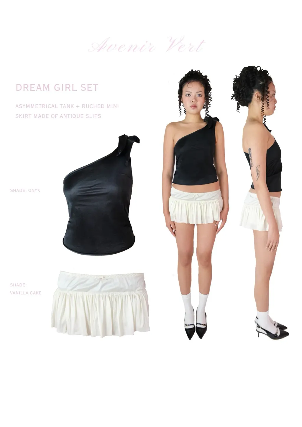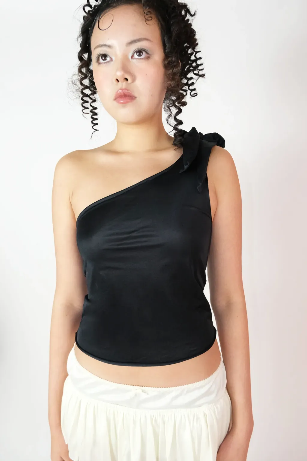 Upcycled satin tank top with asymmetrical neckline & large adjustable bow + satin ruched mini skirt.