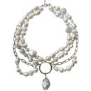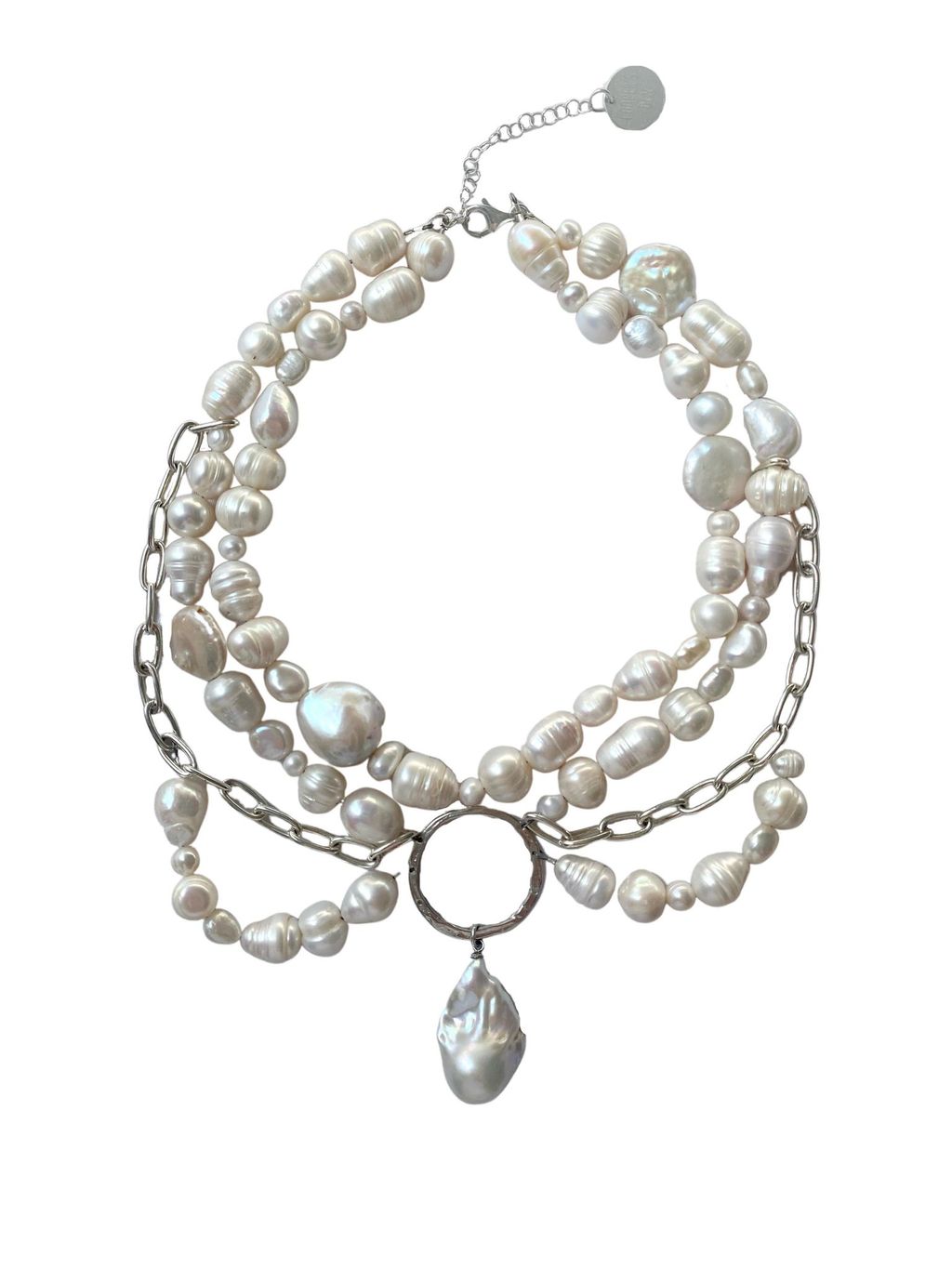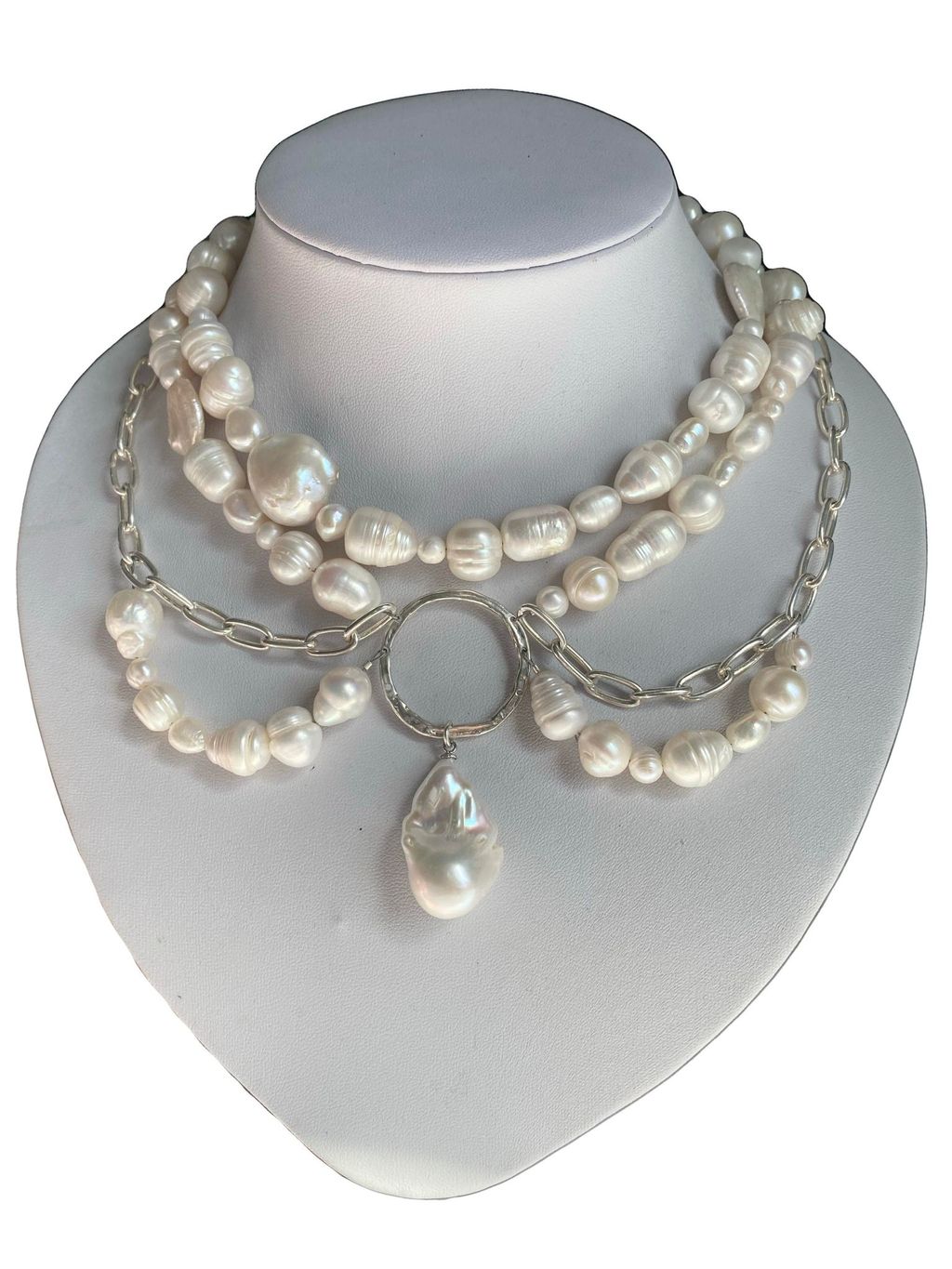 A pearl necklace out of the ordinary made by hand. With layers of freshwater pearls and chains, this necklace is a statement piece.