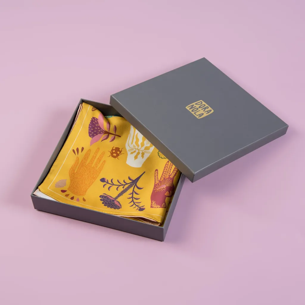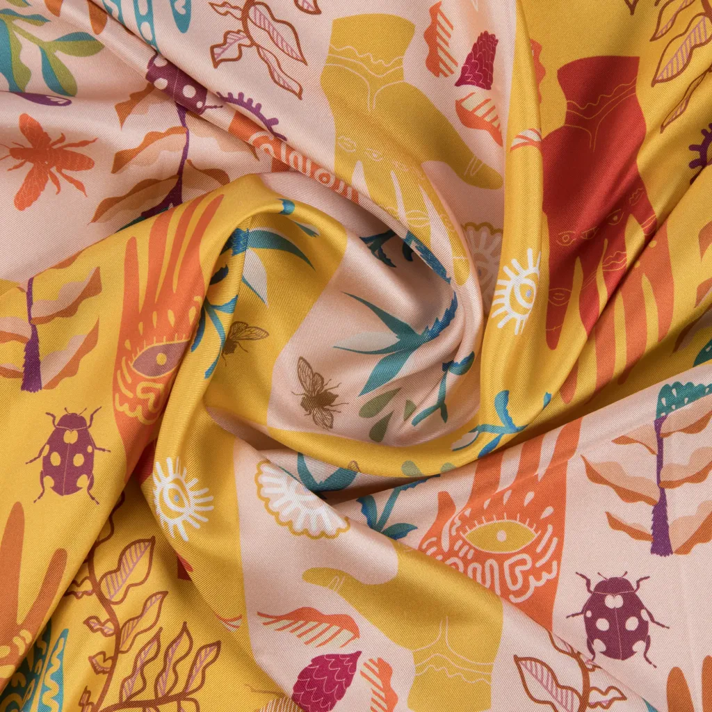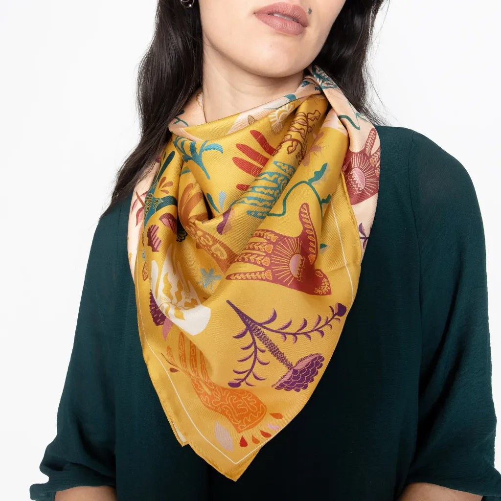 Like a cabinet of curiosities, the Guardian motif is full of intricacies and surprises to discover. This silk carré can be worn to showcase either the yellow or the peach colour with a simple fold. Versatile and luxurious, crafted in 100% silk twill.