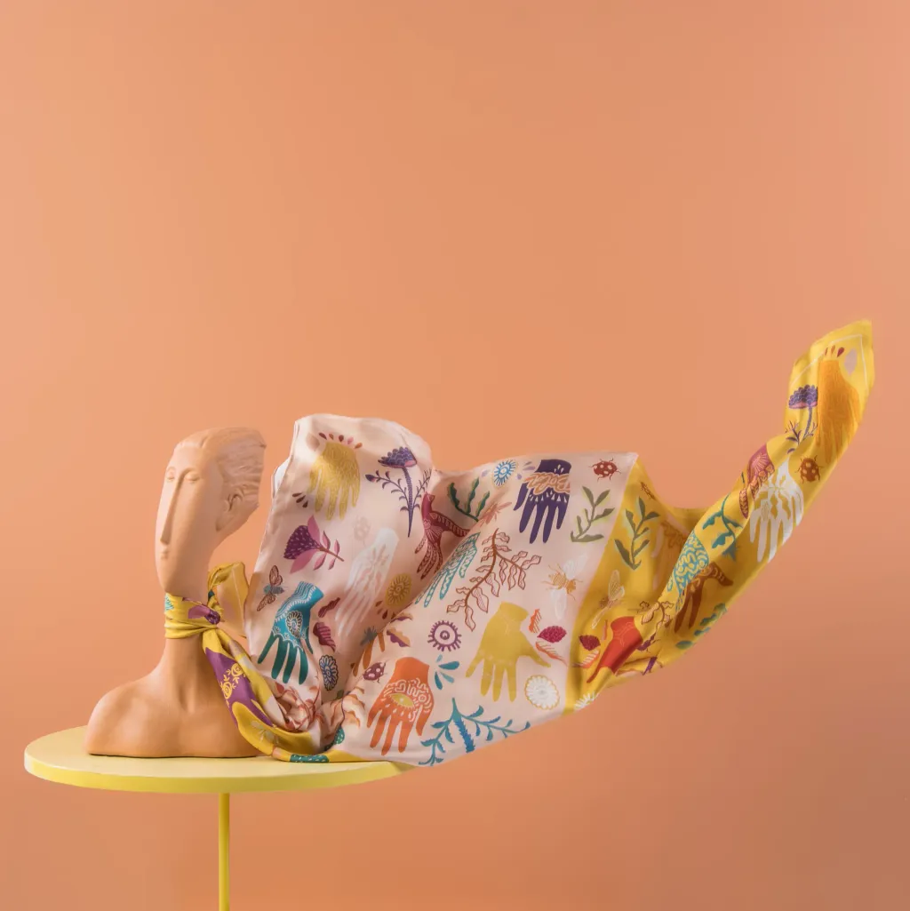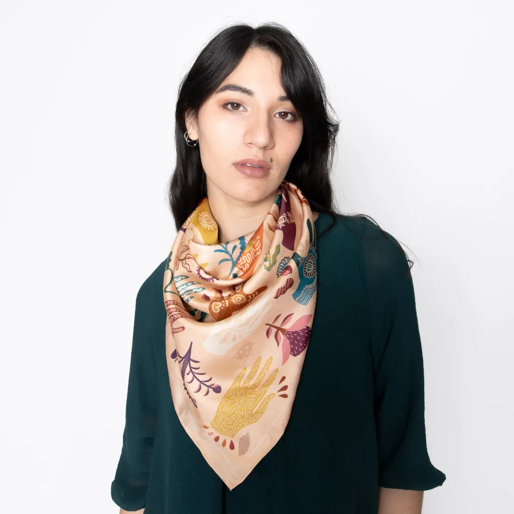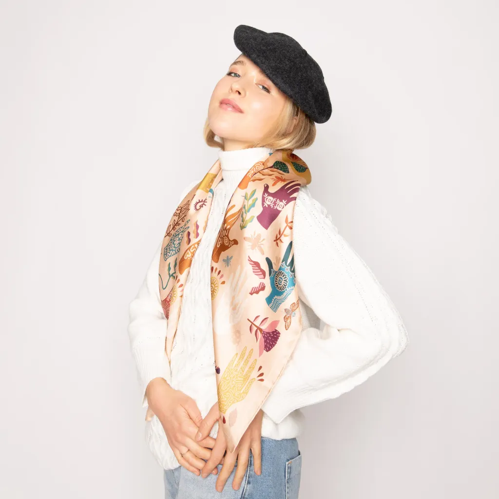 Like a cabinet of curiosities, the Guardian motif is full of intricacies and surprises to discover. This silk carré can be worn to showcase either the yellow or the peach colour with a simple fold. Versatile and luxurious, crafted in 100% silk twill.