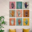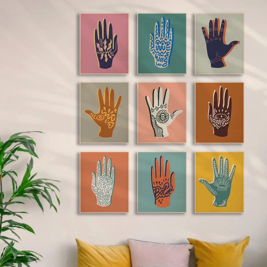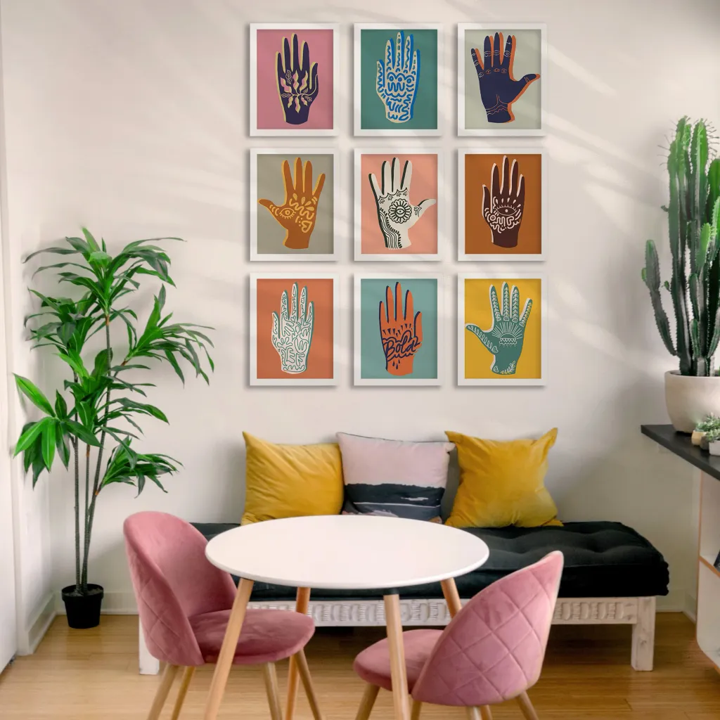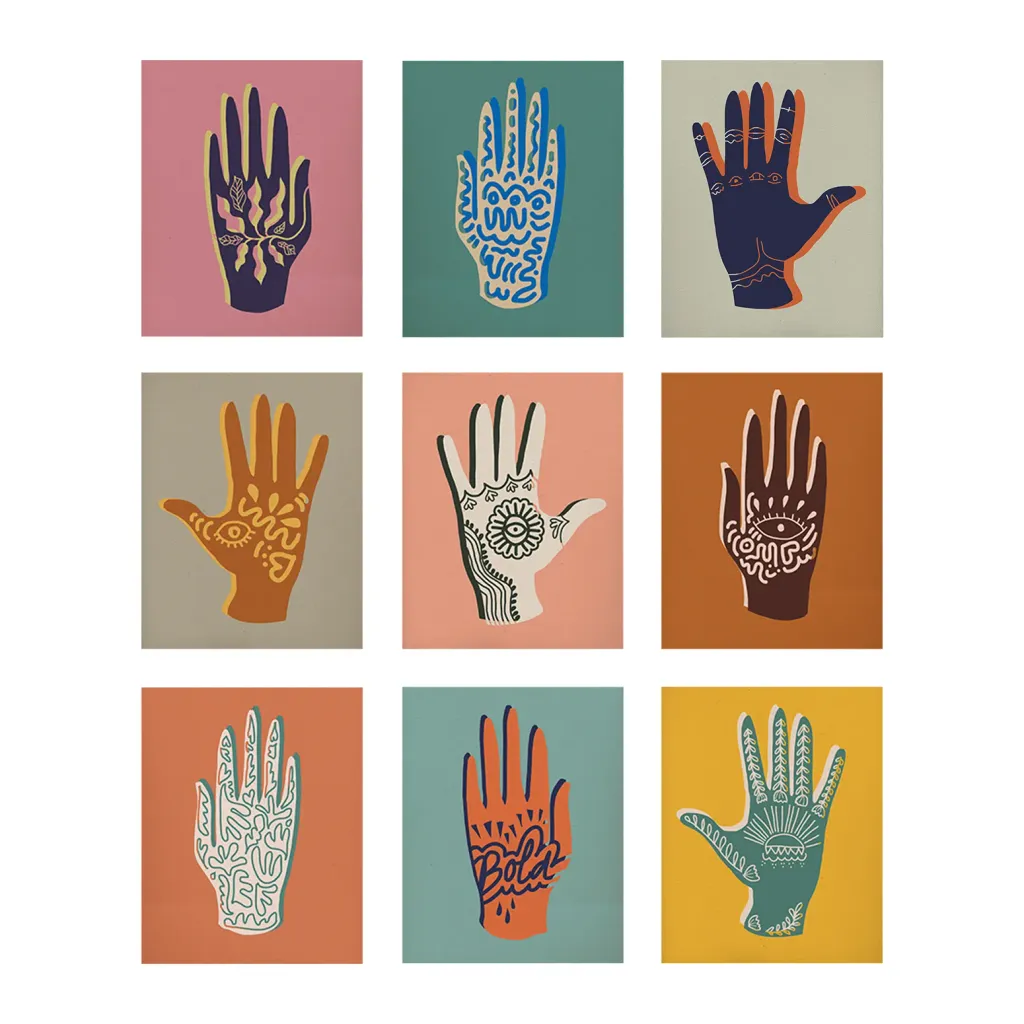 Archival quality art prints of original Dora Nola artwork. The complete series of 9 prints depicting interpretations of the hand of Fatima meant to bring you acceptance, good vibes and positive energy.