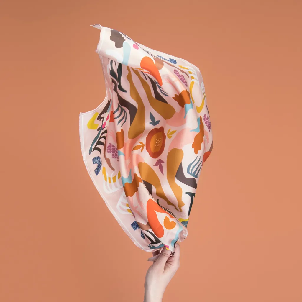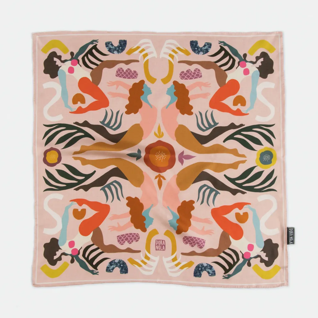 Crafted from 100% silk twill with hand rolled edges, this neckerchief is an essential in all wardrobes. This otomi inspired artwork features the beautiful silhouettes of natural, free women. This Dora Nola original marks the beginning of an amazing journey that you can be a part of!