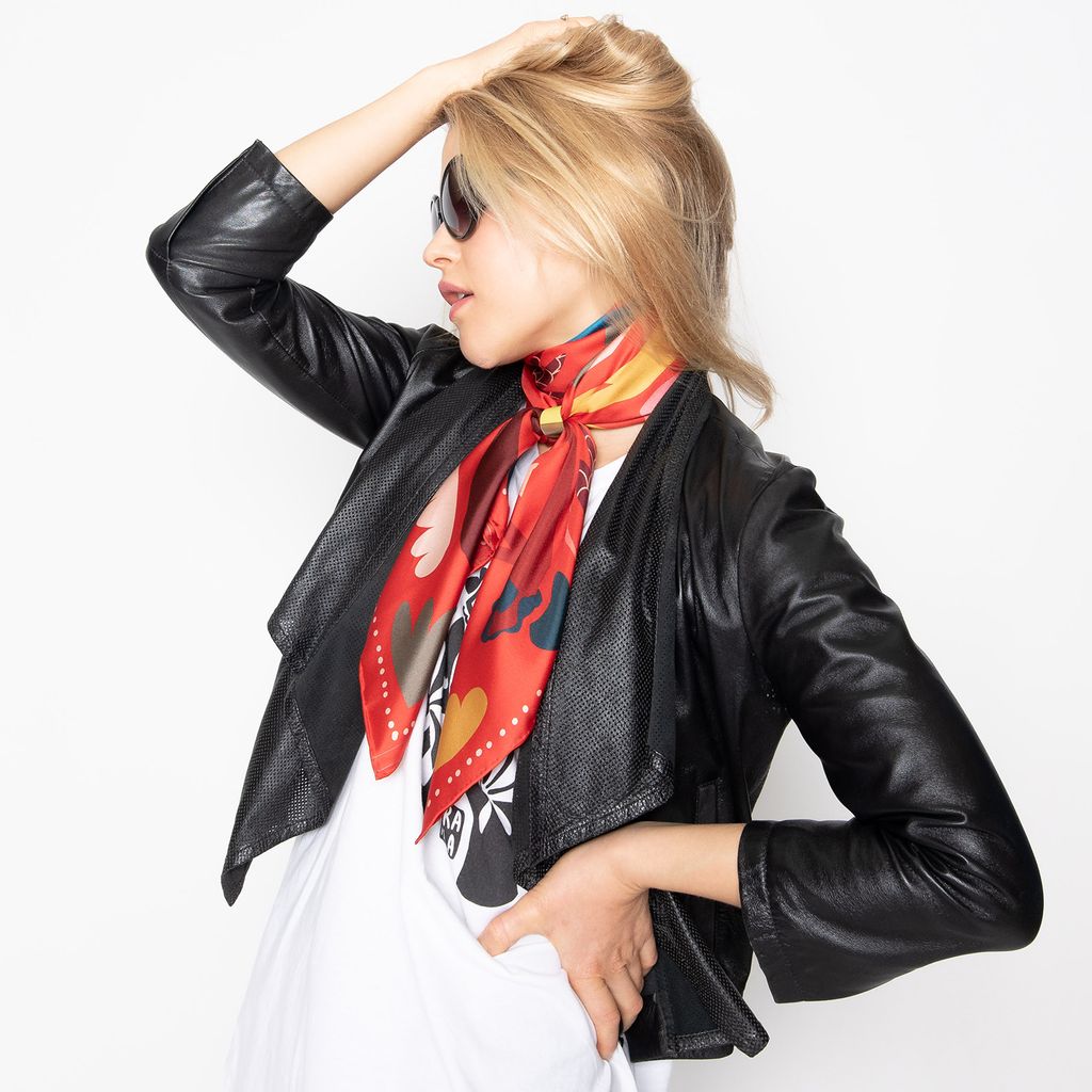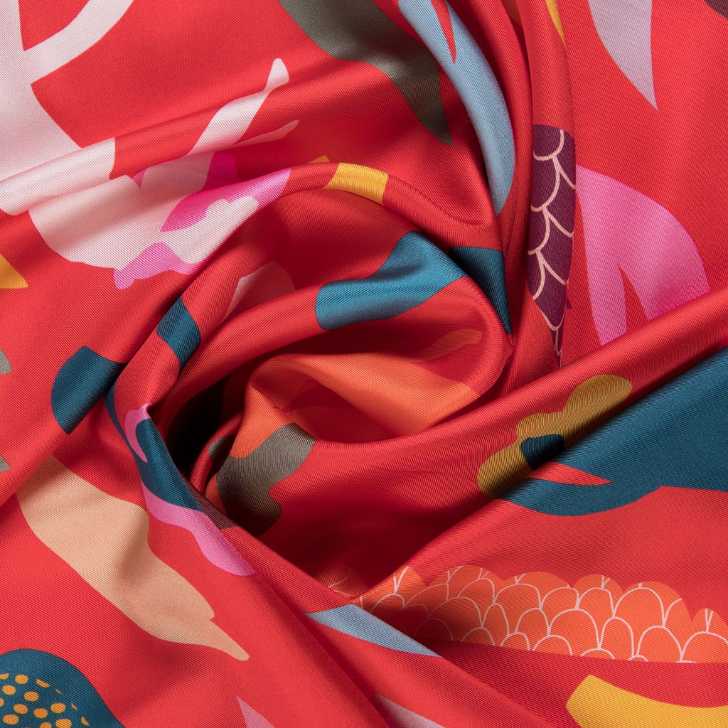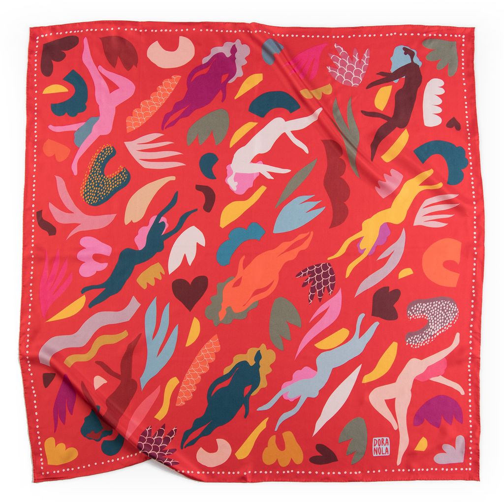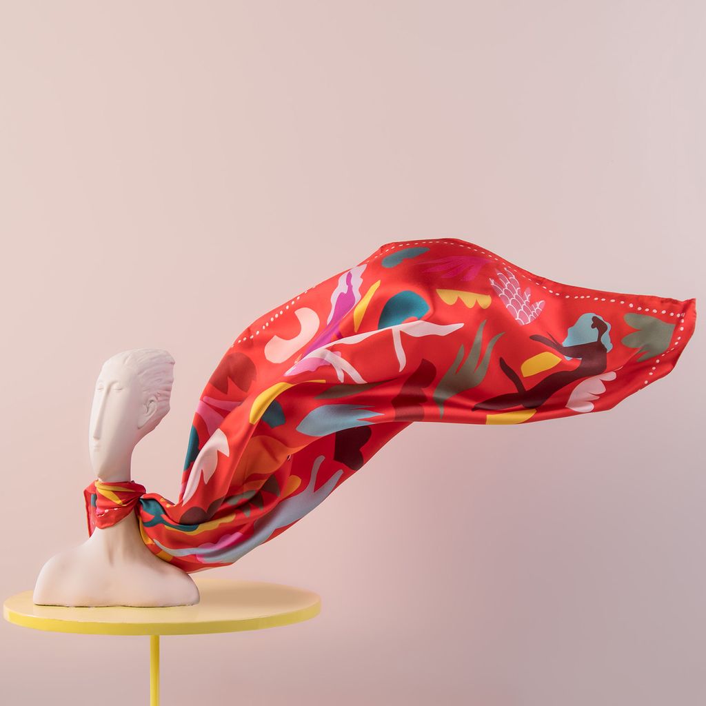 This scarf is crafted from 100% silk twill with hand rolled hem. Featuring original artwork of silhouettes floating in an eclectic mélange of shapes and hearts. This luscious red number will surely add some pop to any outfit.