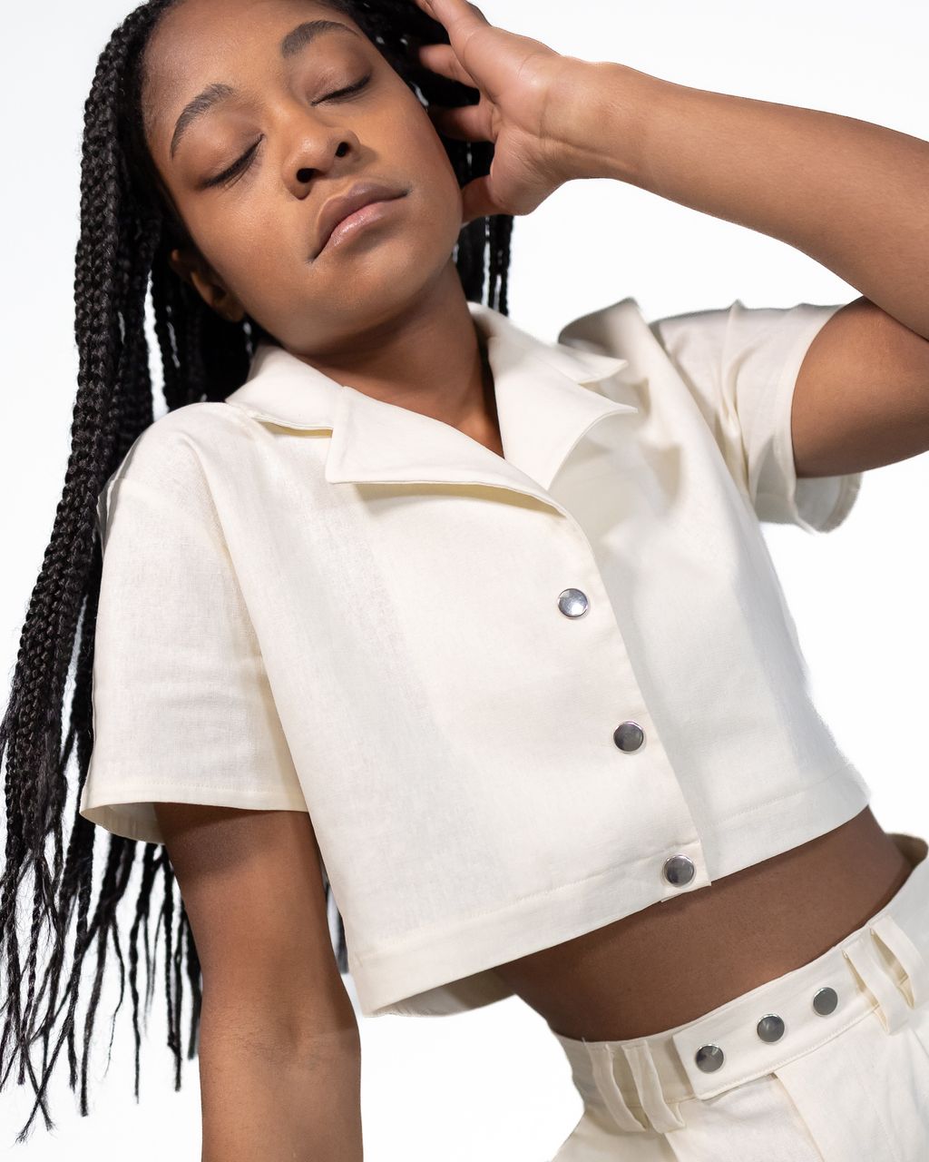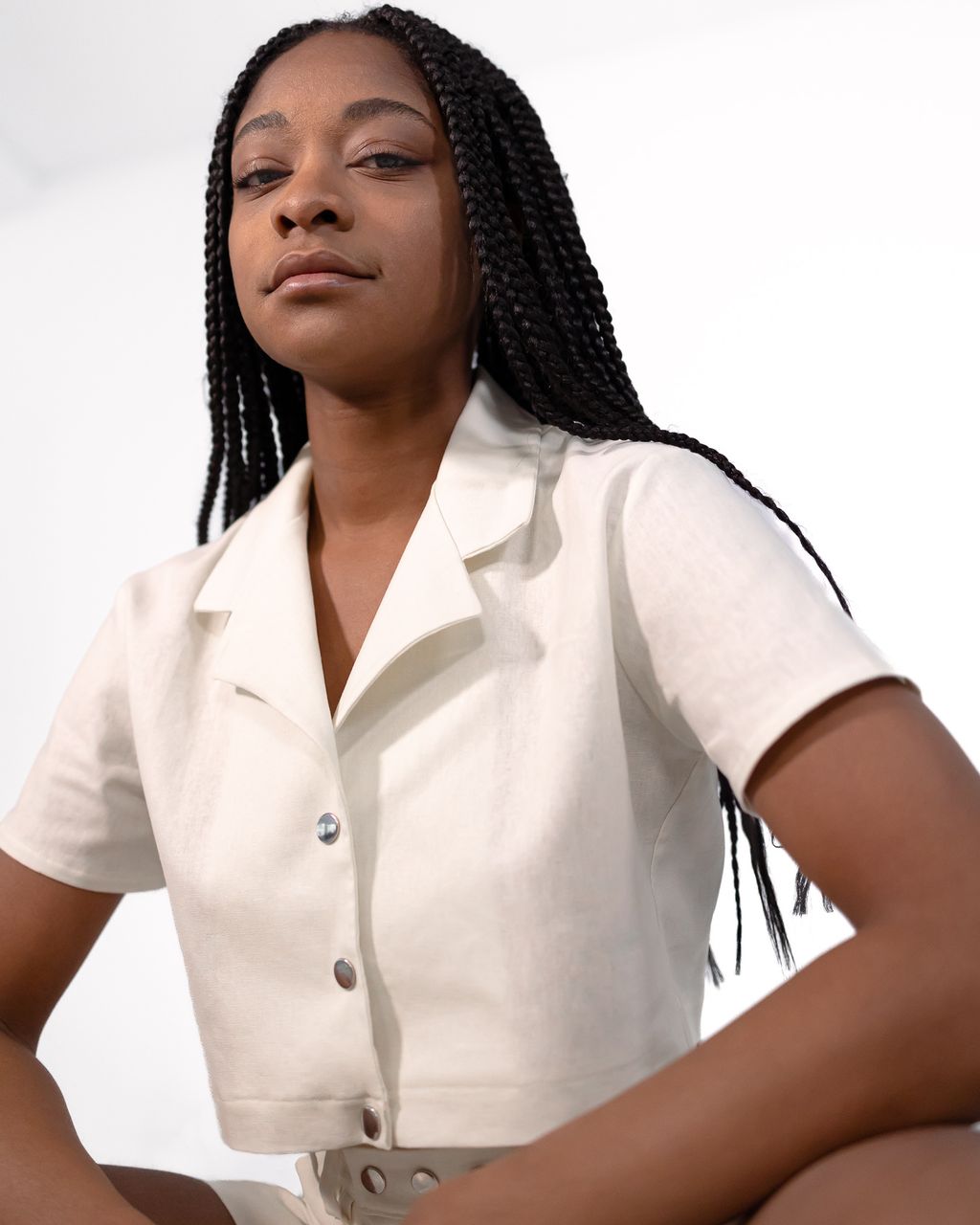 The Junho short-sleeved shirt is made from structured and breathable linen. We love the details it is featuring, such as its notched collar, its loose and cropped fit, as well as the contrast of the silver buttons on the linen.