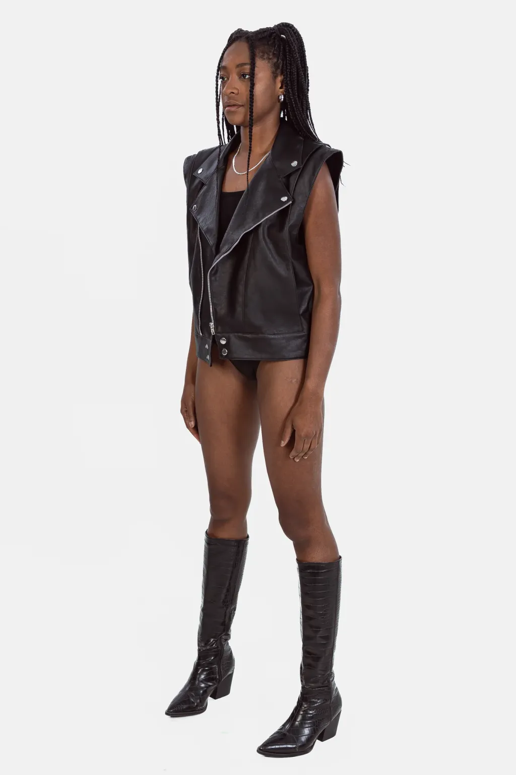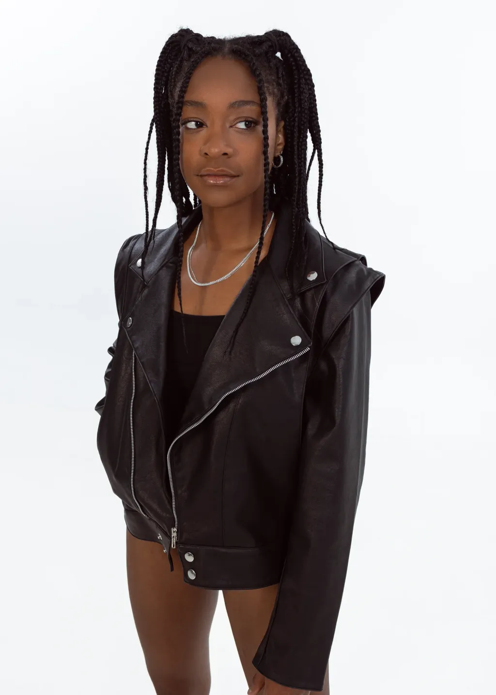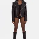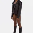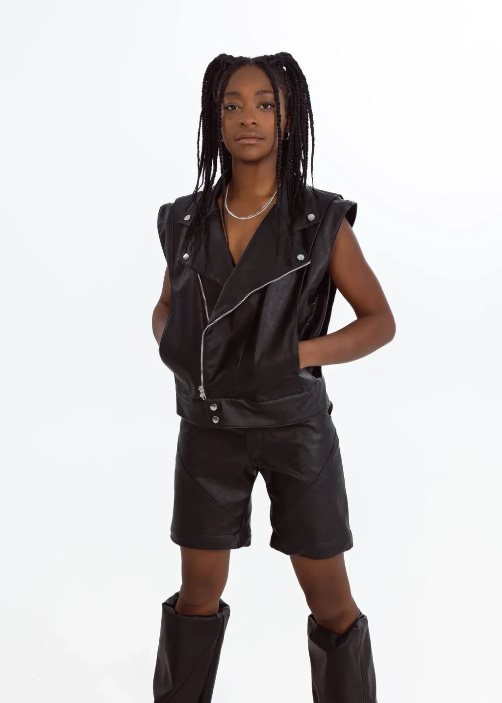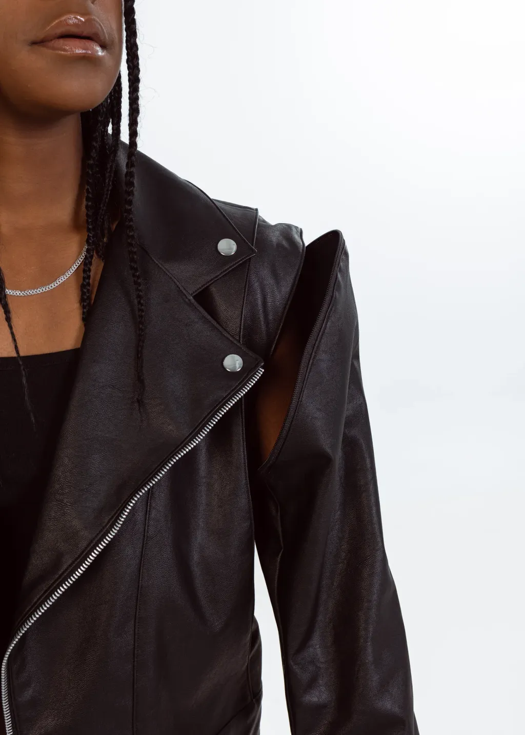 The Vegan Leather Convertible Jacket is our take on a fashion classic. This timeless piece features the elements of the classic biker jacket, with unique details signed EIV, to create the perfect balance between edgy and elegant. This unique piece can be easily transformed into a sleeveless jacket, thanks to its concealed zippers at the shoulders.