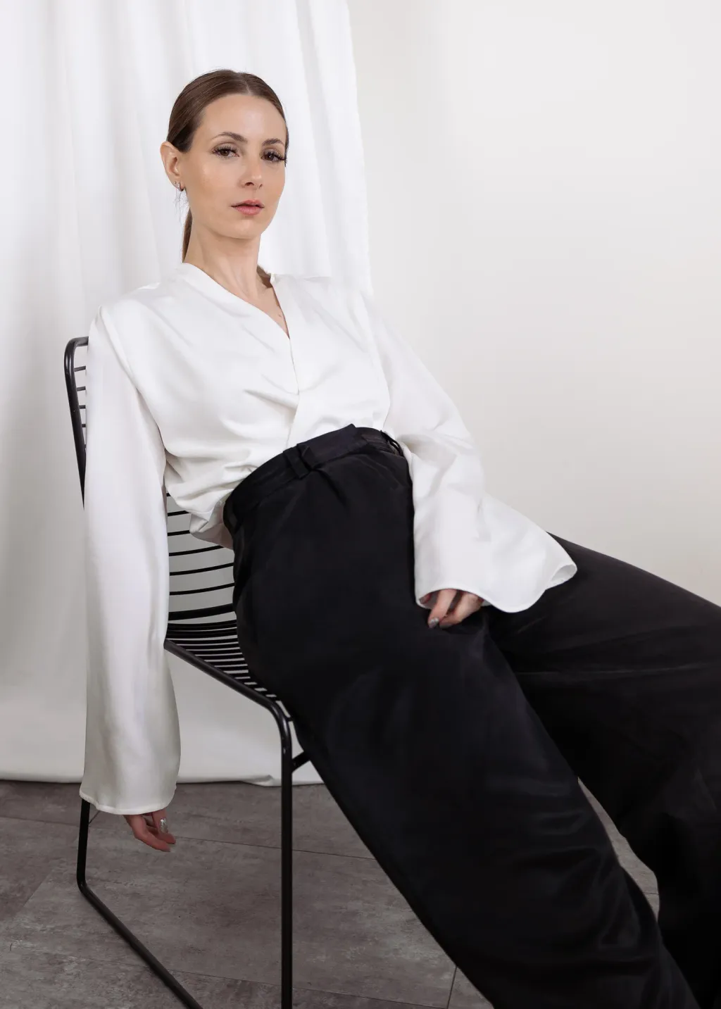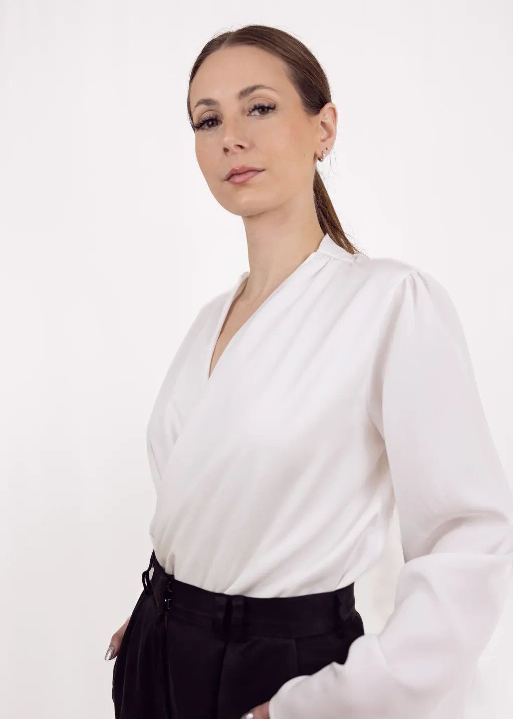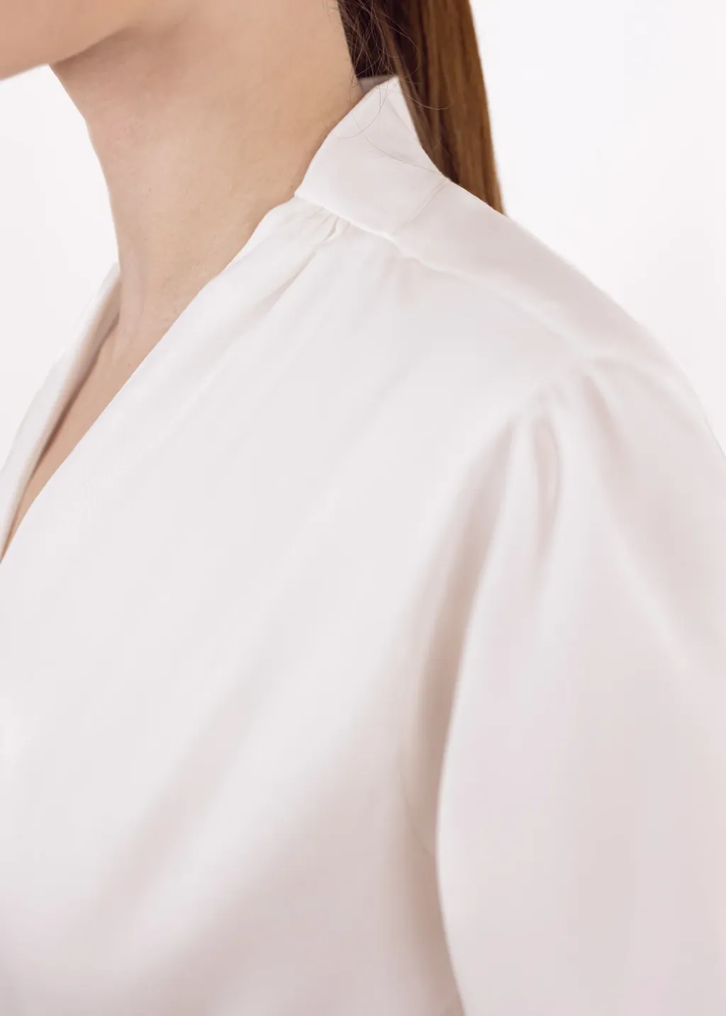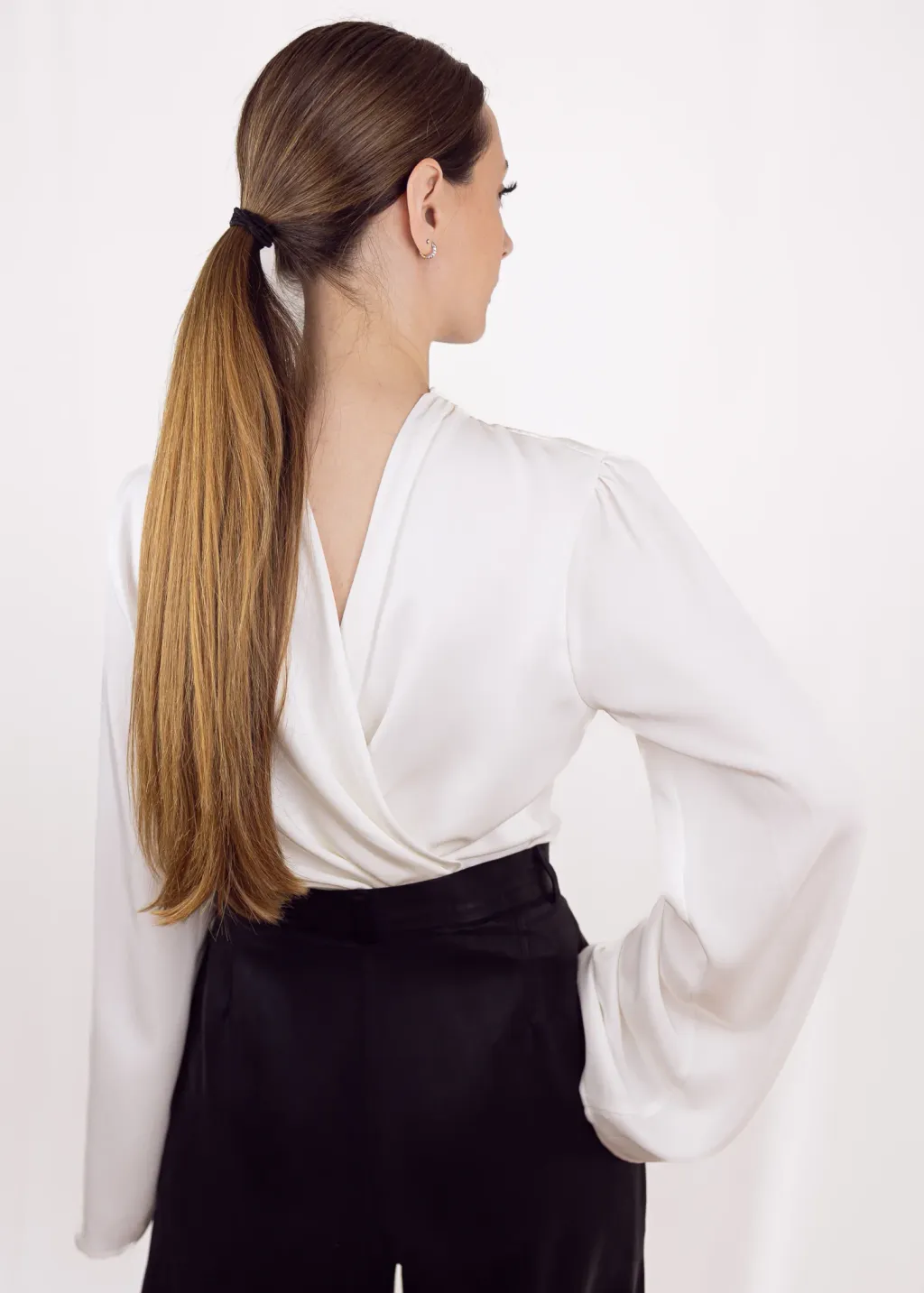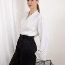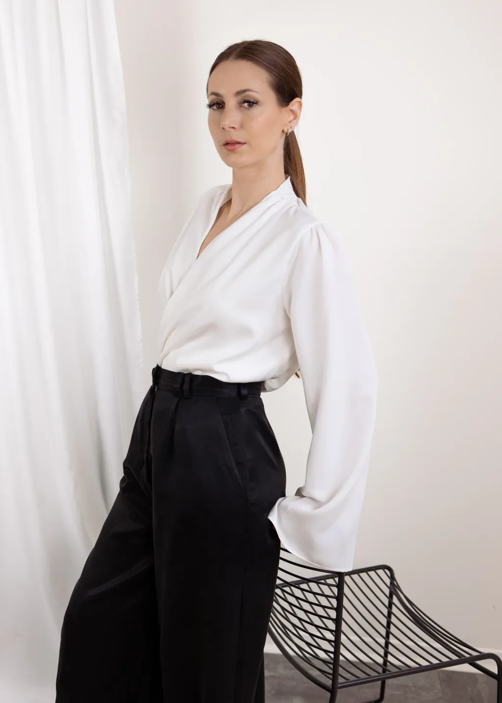 Wallis, our convertible blouse can be transformed according to your needs. On one side, get an elegant and structured look through its stand-up collar and open back. On the other, the wrap-style v-neck gives you a flowing and relaxed style, while maintaining the beautiful elegance of the blouse.
