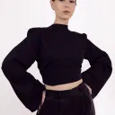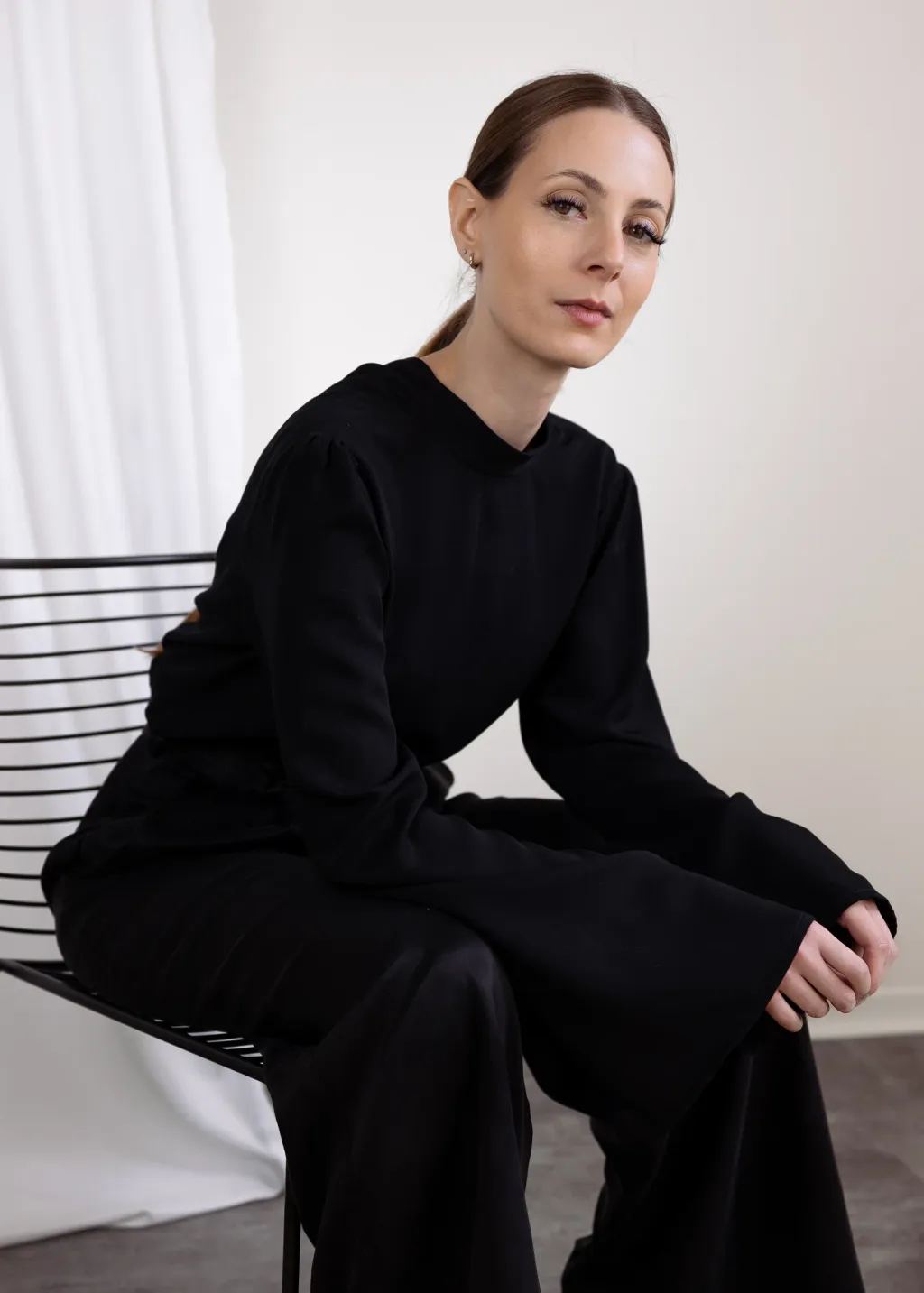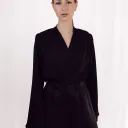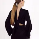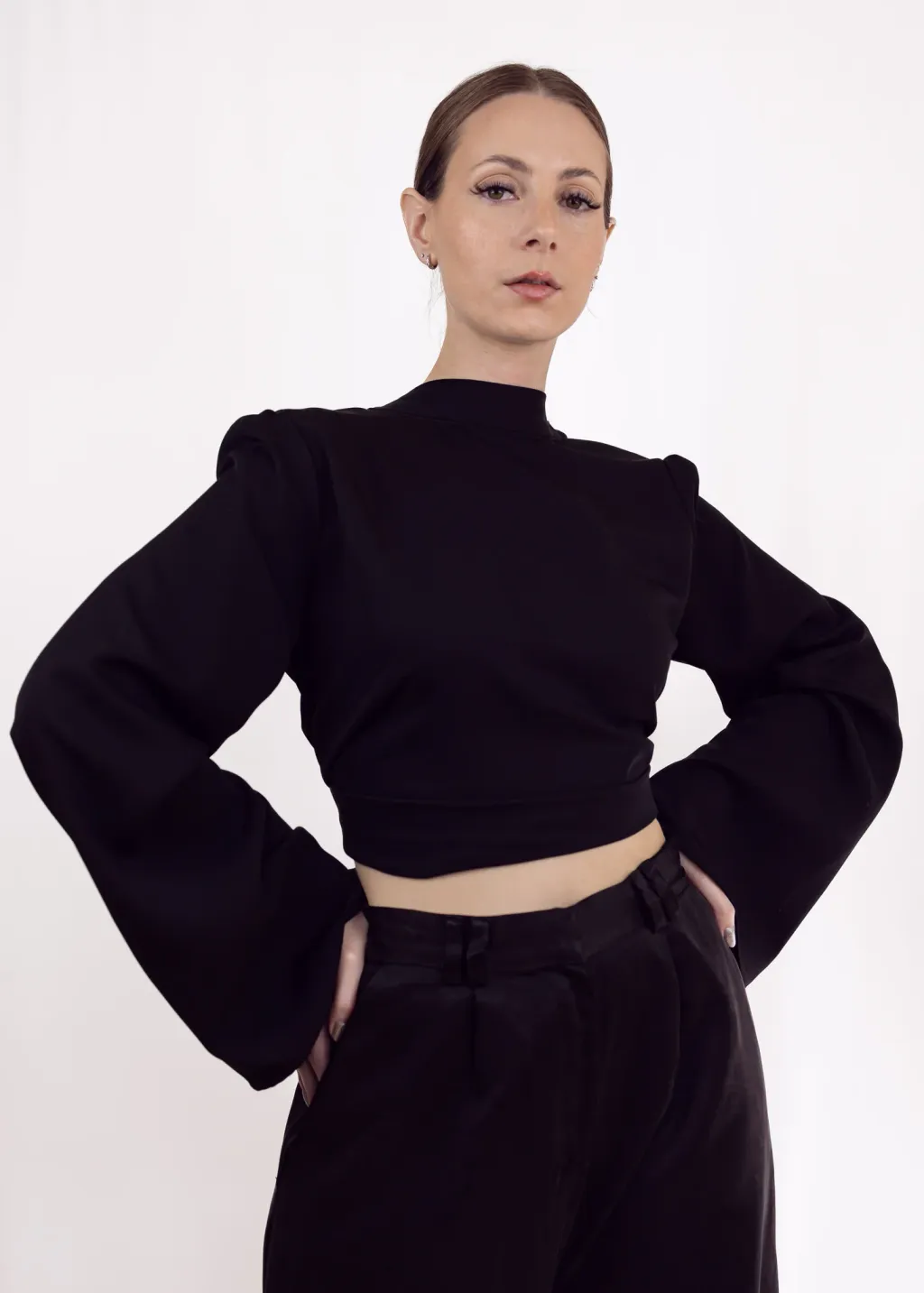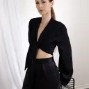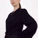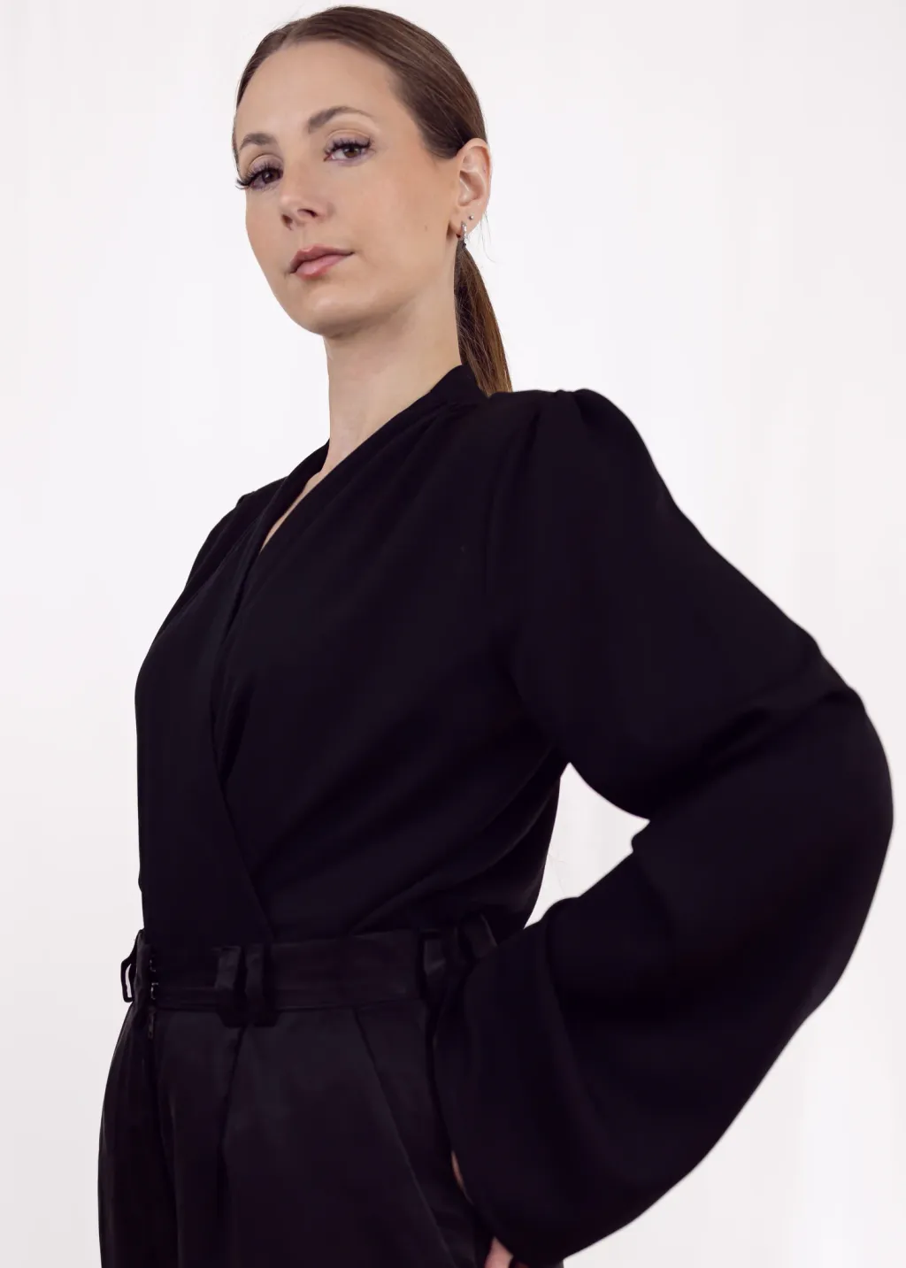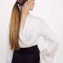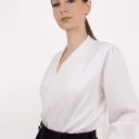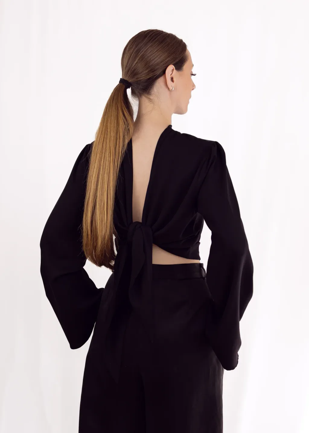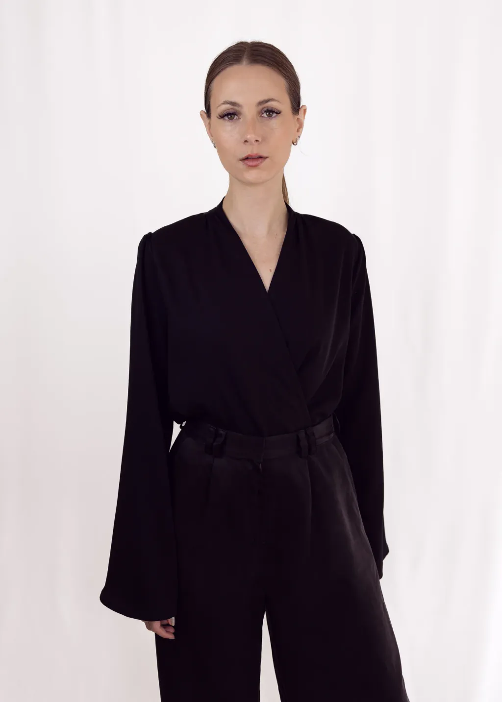 Wallis, our convertible blouse can be transformed according to your needs. On one side, get an elegant and structured look through its stand-up collar and open back. On the other, the wrap-style v-neck gives you a flowing and relaxed style, while maintaining the beautiful elegance of the blouse.