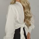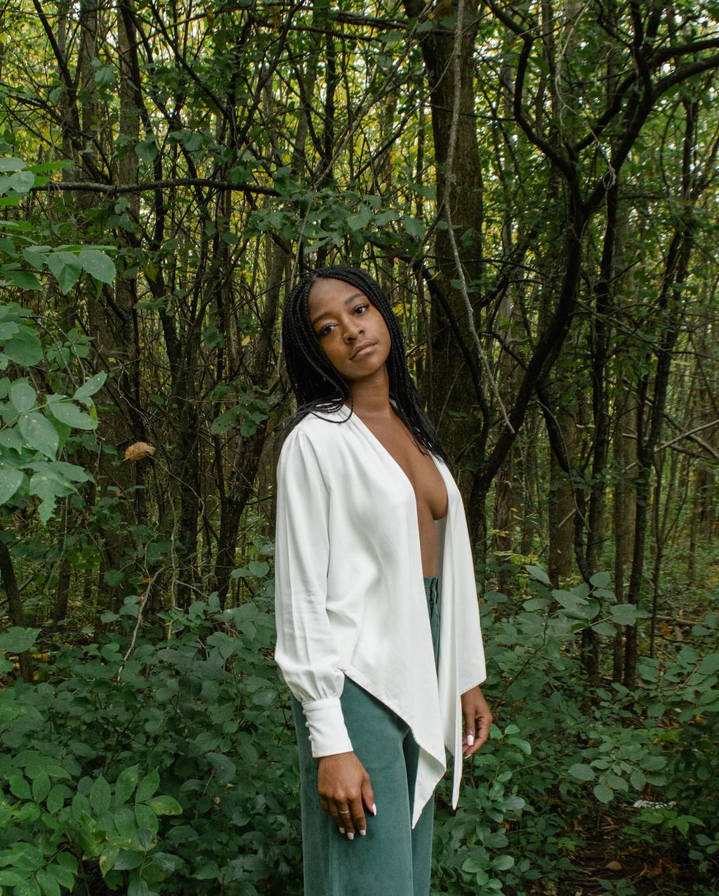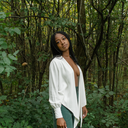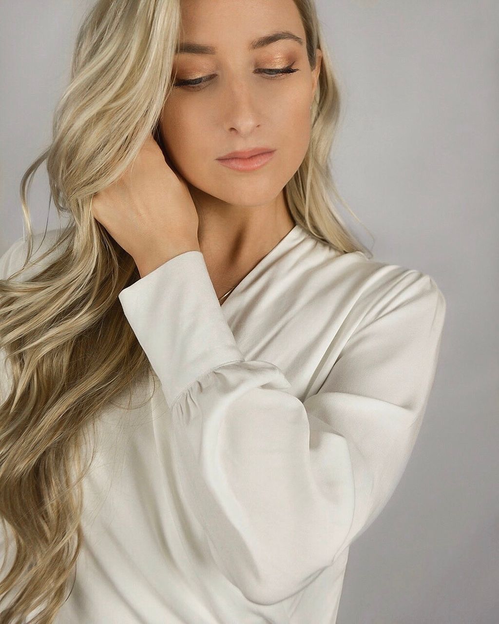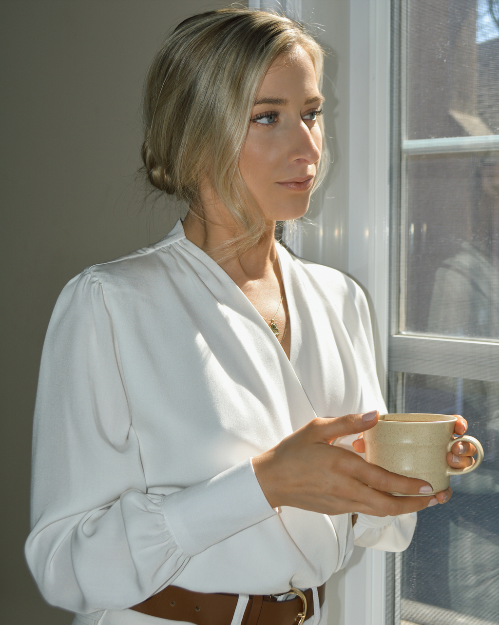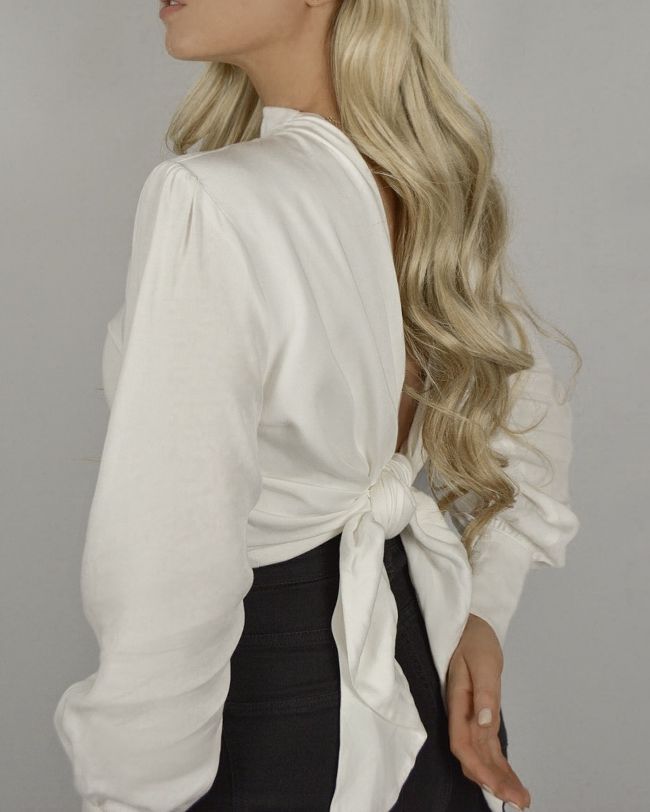 Wallis, our convertible blouse can be transformed to your needs. On the one side, get an elegant and structured look with its high collar and open back. On the other, the wrap-style v-neck gives you a fluid and relaxed style, while keeping the beautiful elegance of the blouse.