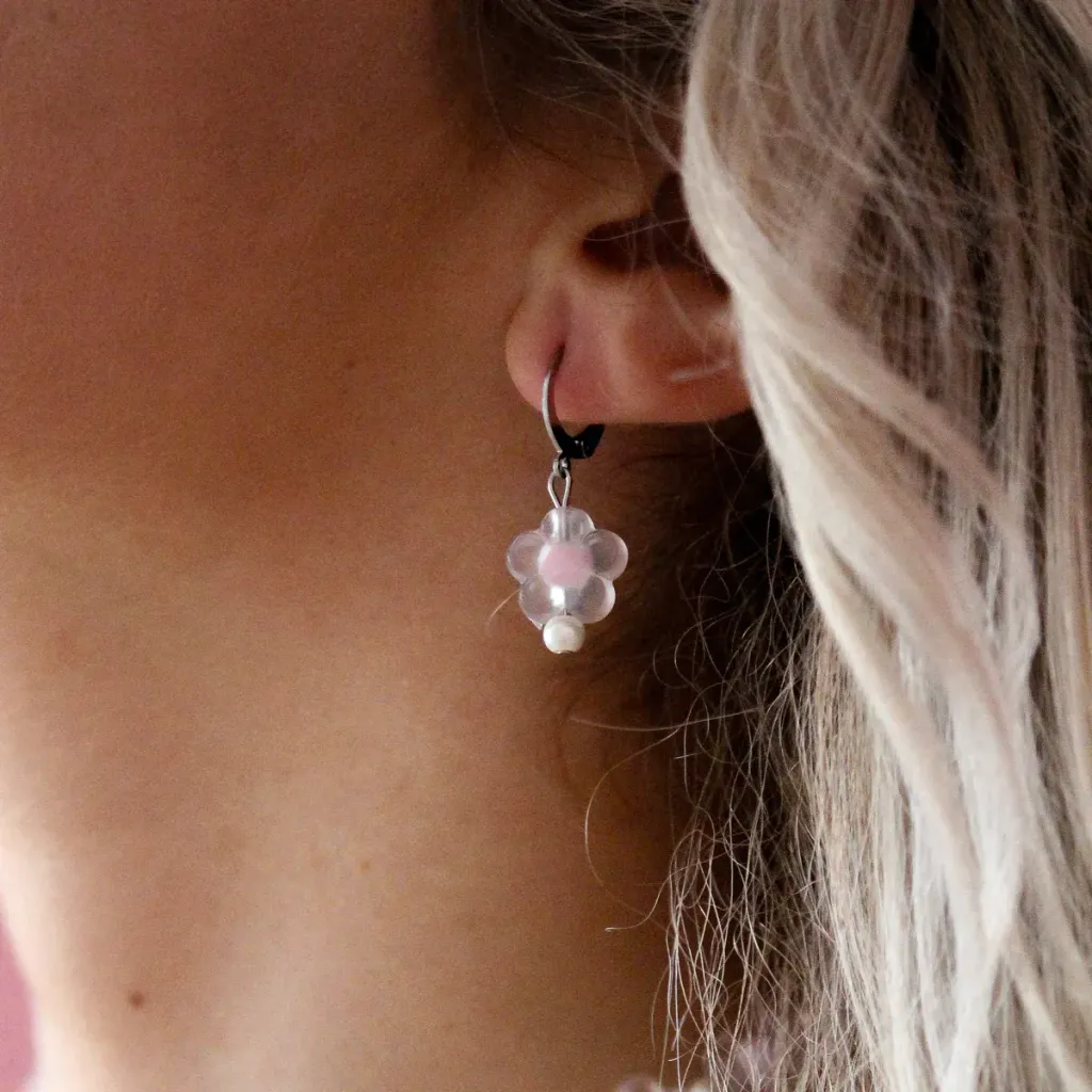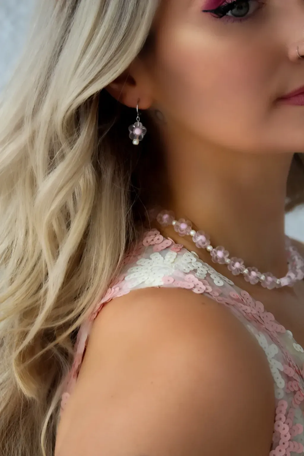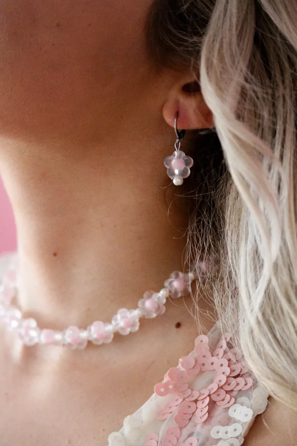Introducing our BLOOMING FANTASY earrings from our Barbie-inspired collection. Adorned with exquisite flower beads and featuring a dreamy subtle glass pearl, these earrings embody a delicate and light jewelry piece that gracefully enhances your style.