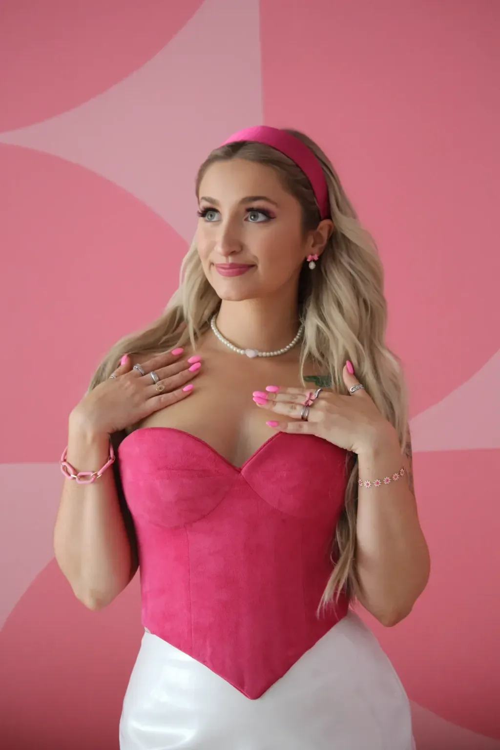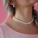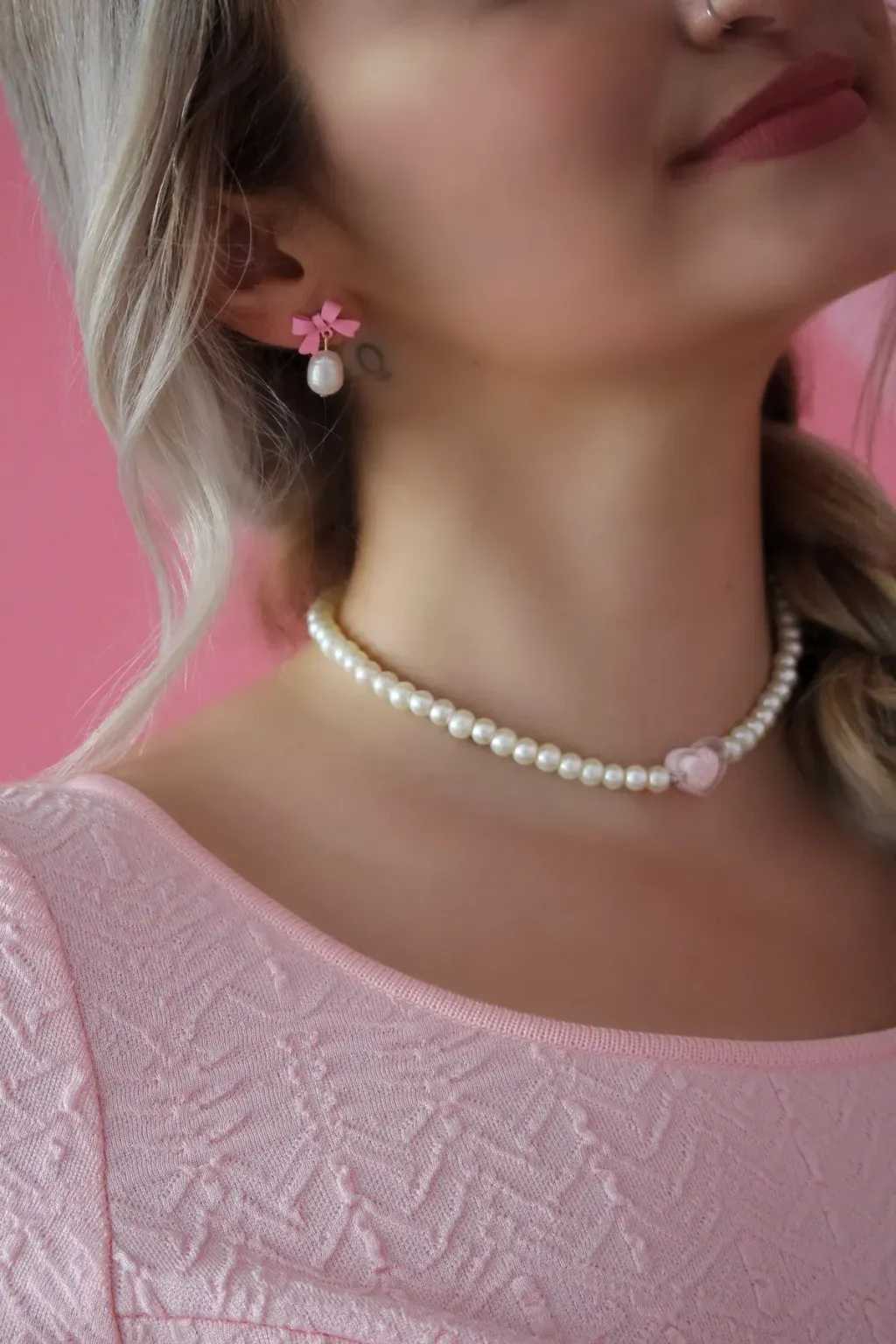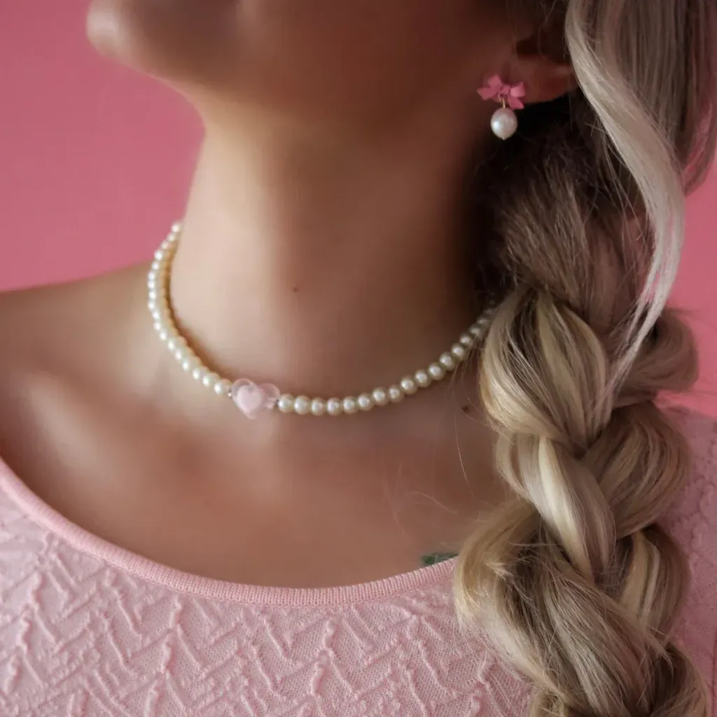 Introducing DREAM DOLL from our Barbie-inspired collection. This timeless pearl necklace captures the essence of Barbie's world, blending elegance with a touch of irresistible cuteness. Its delicate glass pearls and a darling heart-shaped centerpiece is the perfect playful touch to effortlessly elevate every outfit.