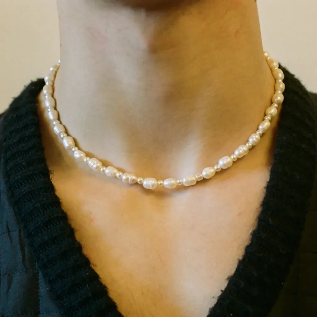 Pearl necklace made with a variation of natural freshwater pearls and smaller glass pearls.