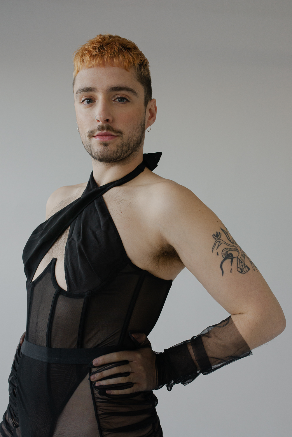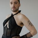 This model is made of mesh for the fitted body with stays and veil for the chest. It attaches in the neck by looping the veil and in the back with a lace. The bodysuit ends with press studs at the crotch.