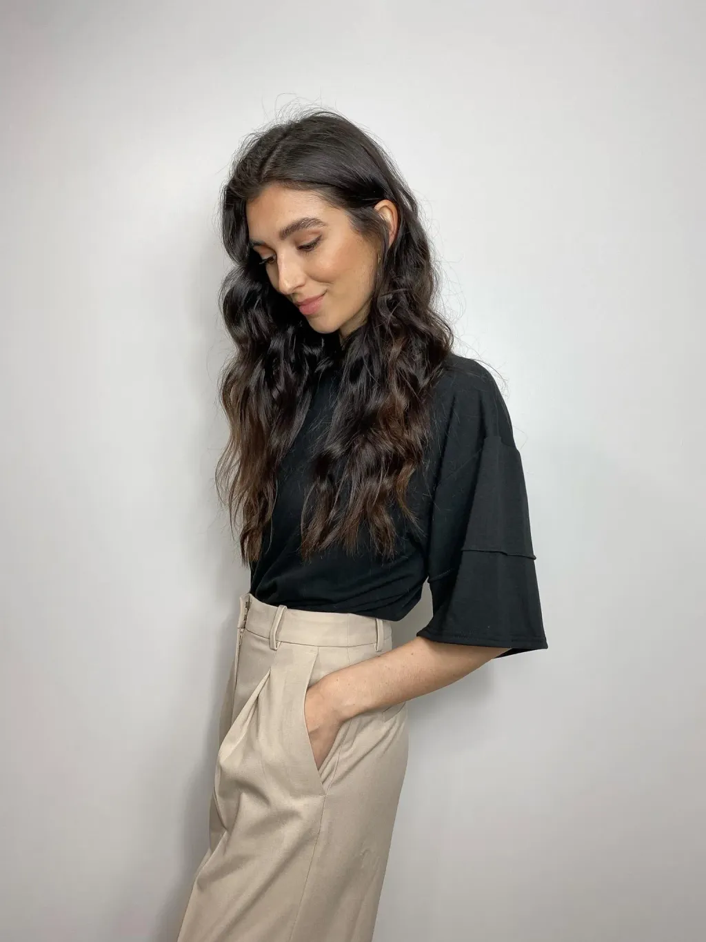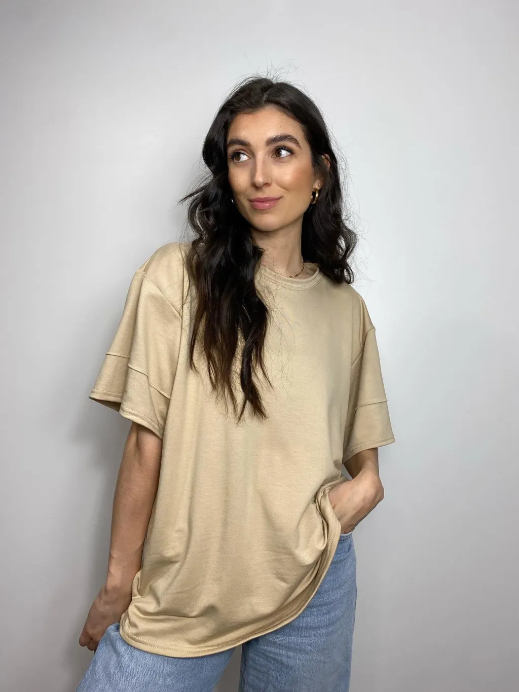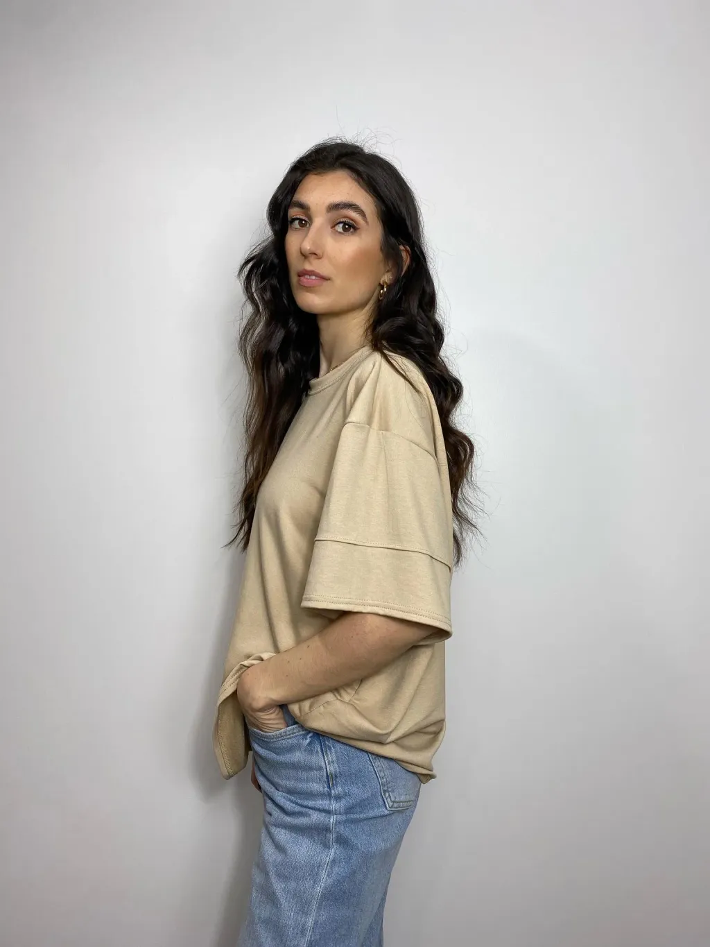 The ALYCE loose-fitting t-shirt is an elegant choice for all occasions. With its boxy cut and ribbed sleeve, it offers classic, timeless style. Its round neckline adds a comfortable touch. Perfect for simple, high-quality outfits.