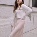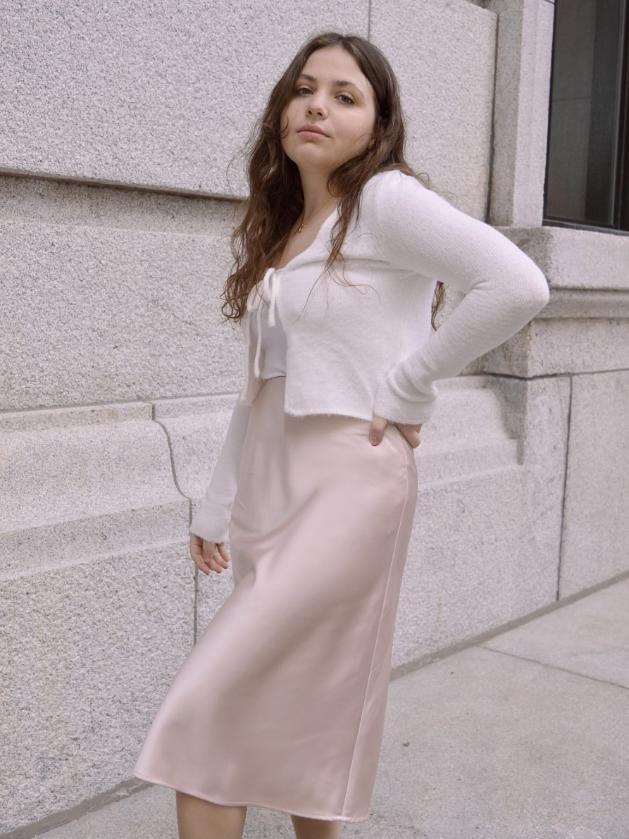 This midi skirt is perfect for a chic evening. Its pink color, which tends towards beige, is sublime and will definitely turn heads. In a shiny satin, it falls perfectly in the middle of the calf.