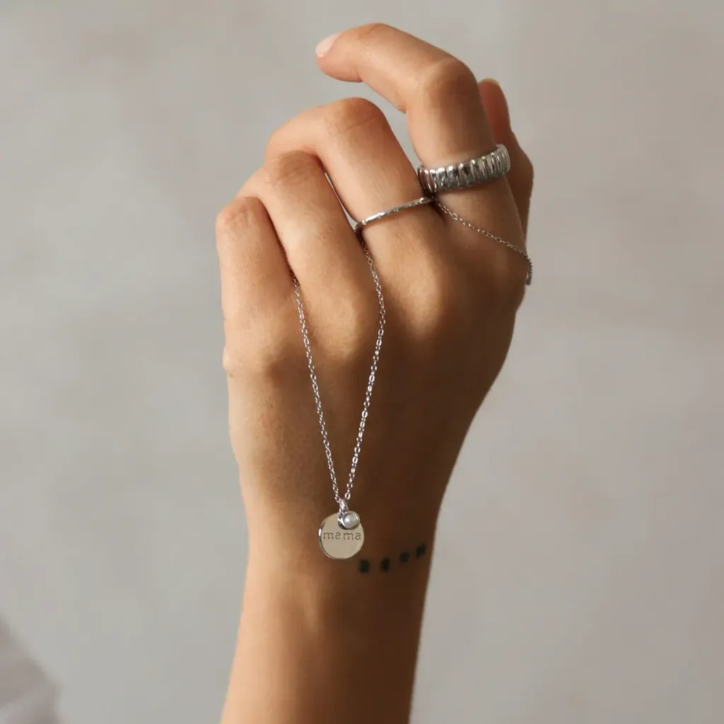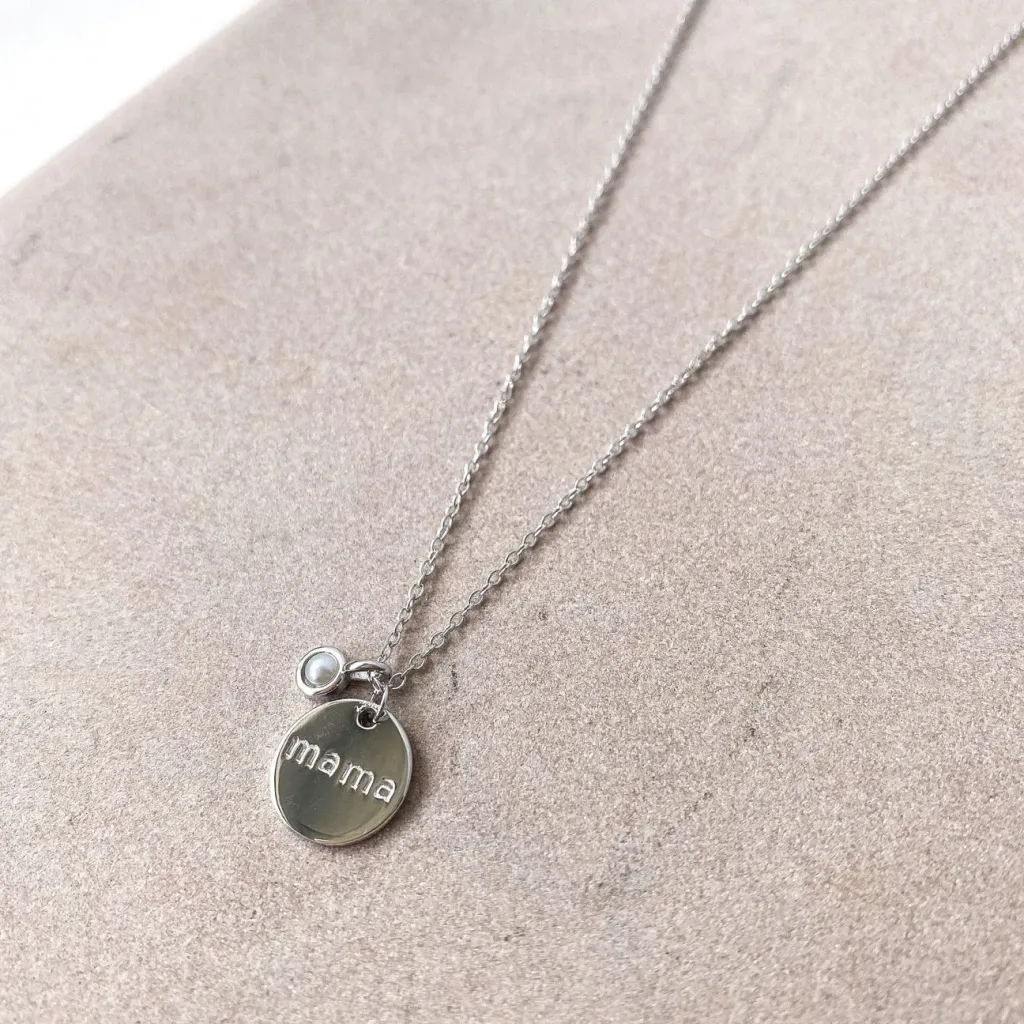 Our MAMA necklace featuring an engraved medallion and a small freshwater pearl.