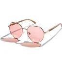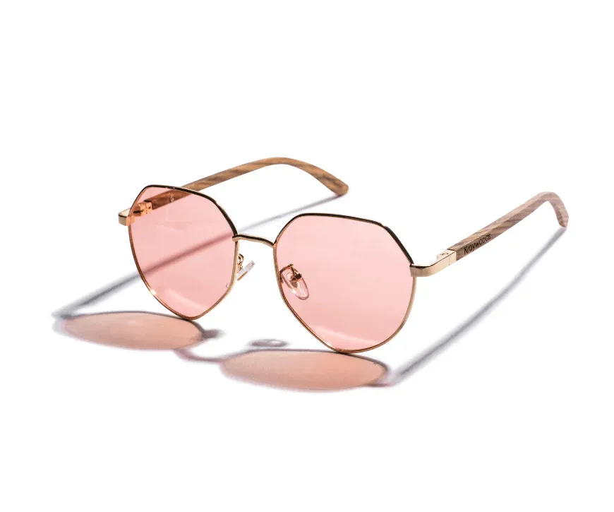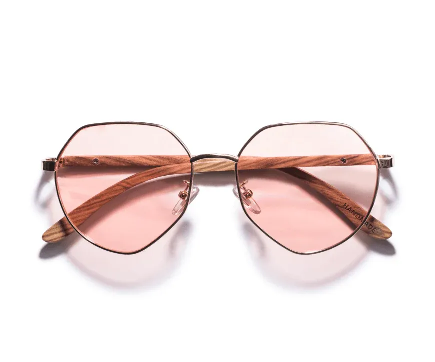 Add a touch of glamour to your look with these hexagon sunglasses. The slim gold metal frame and raised bridge are accented by alluring rosewood arms, making these shades a fashionable choice. The pink polarized lenses not only add a pop of color, but also provide superior protection for your eyes by reducing glare and blocking harmful UV rays.