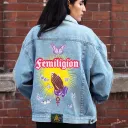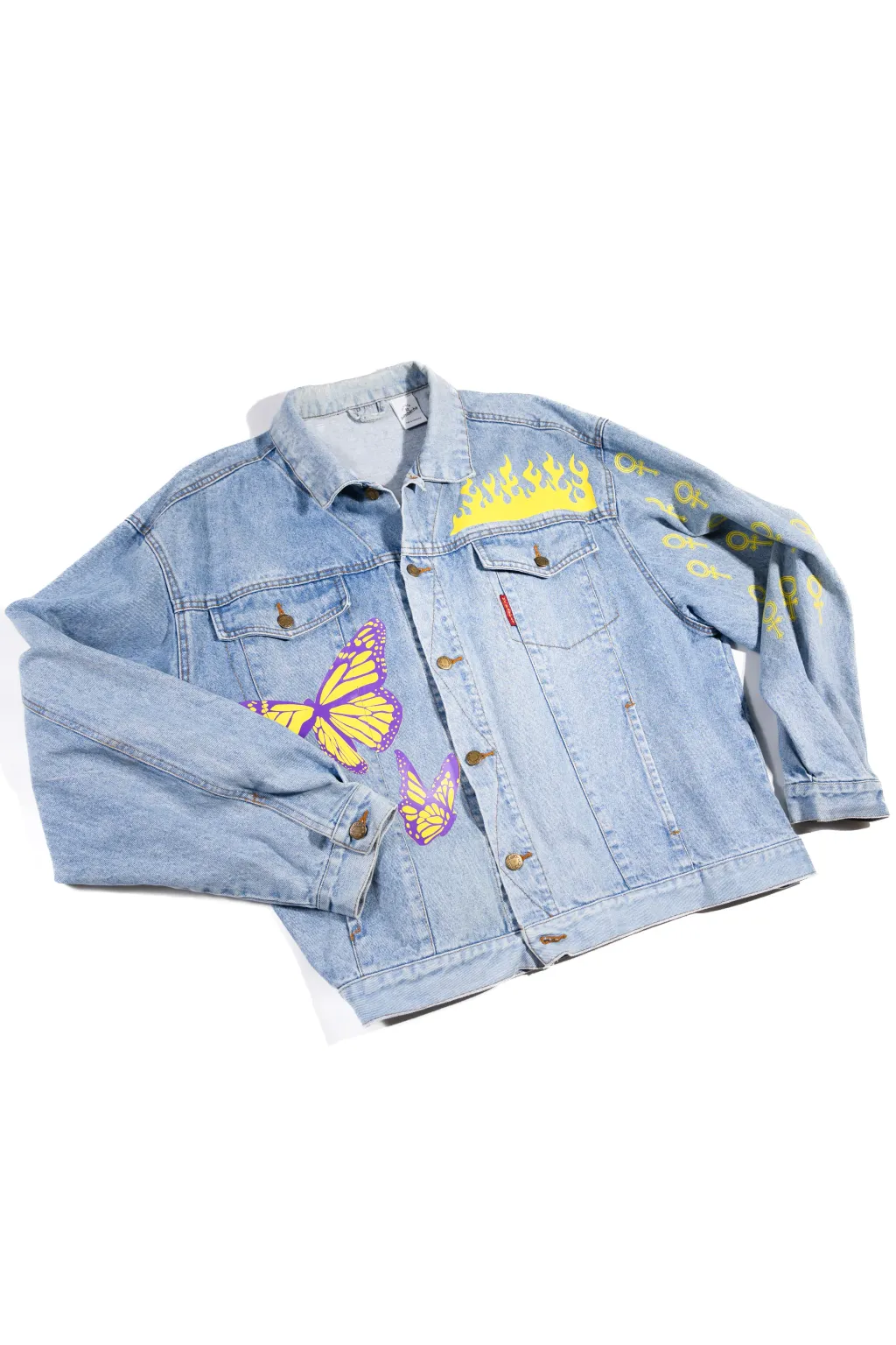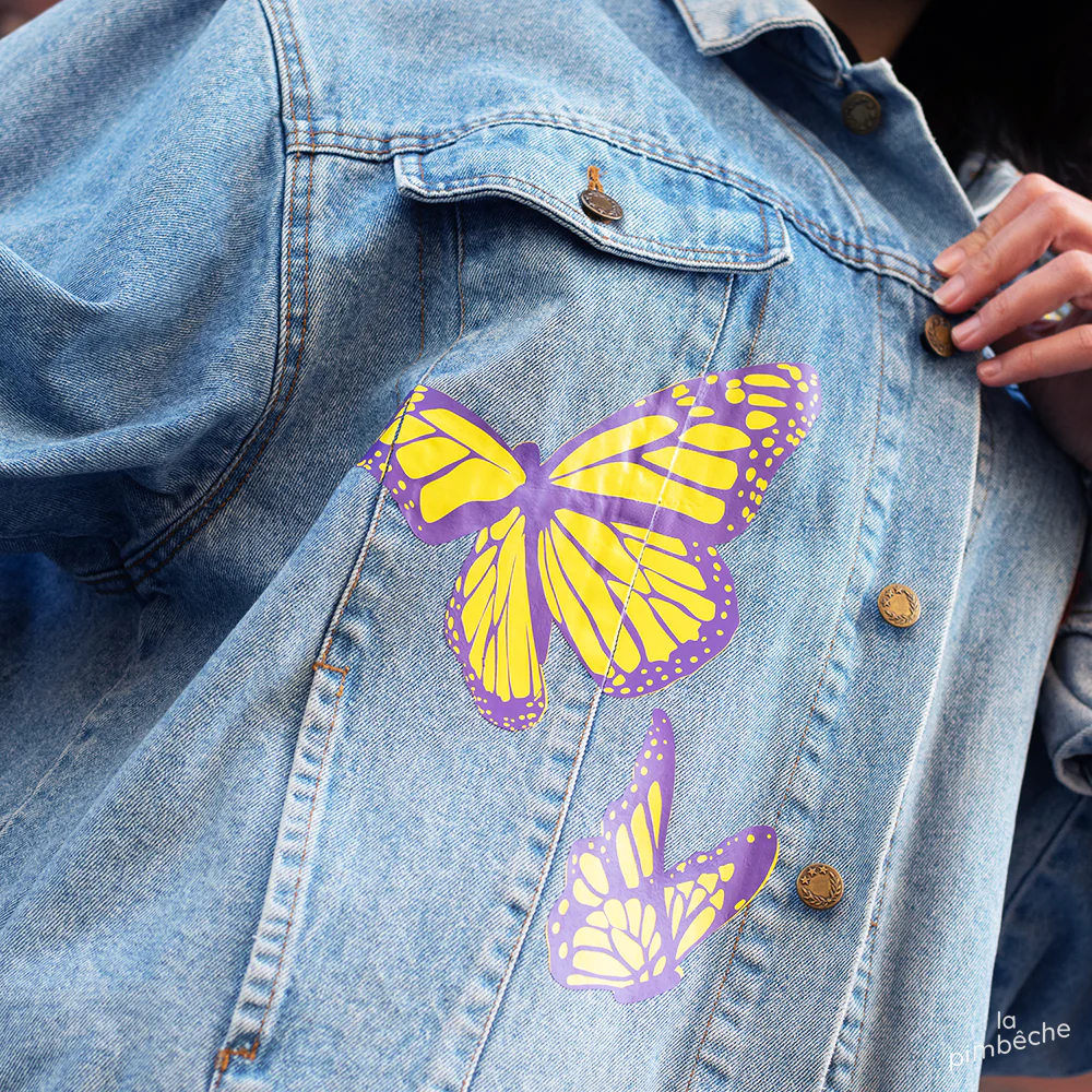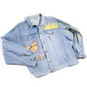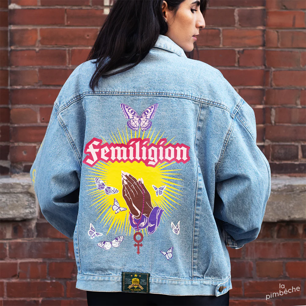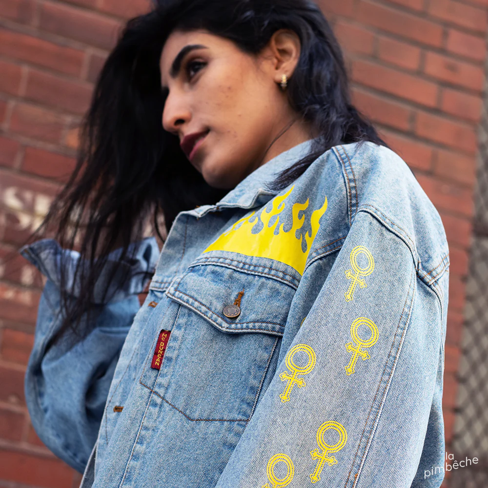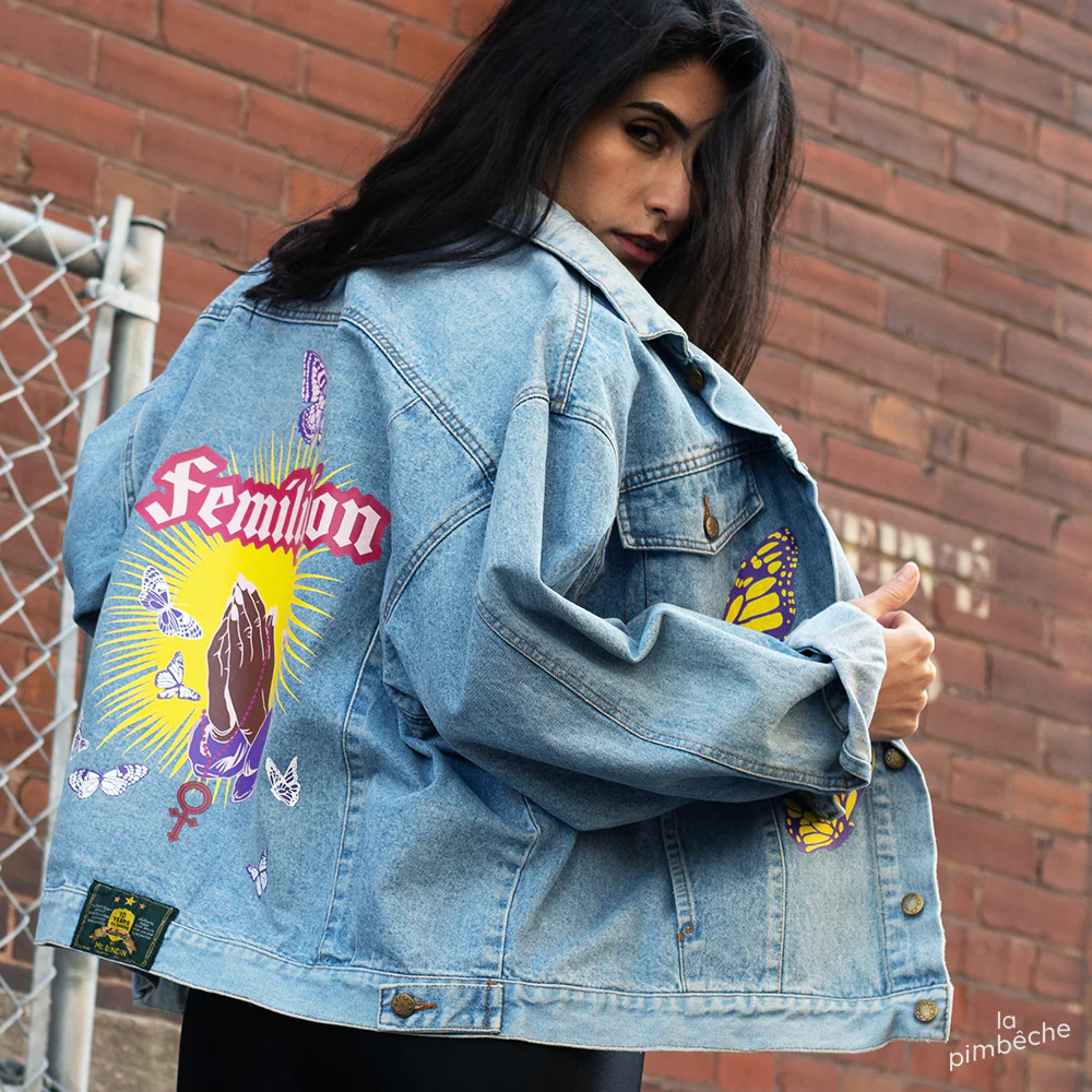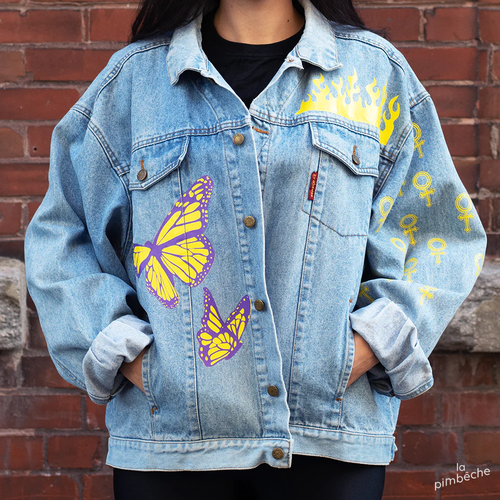 Made piece of art from a series of upcycled jean jacket made with love by La Pimbêche. Each unique artwork piece is made of layers and layers of heat-transfer vinyls. The jacket becomes the canvas and your body allows the art to travel.