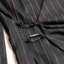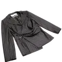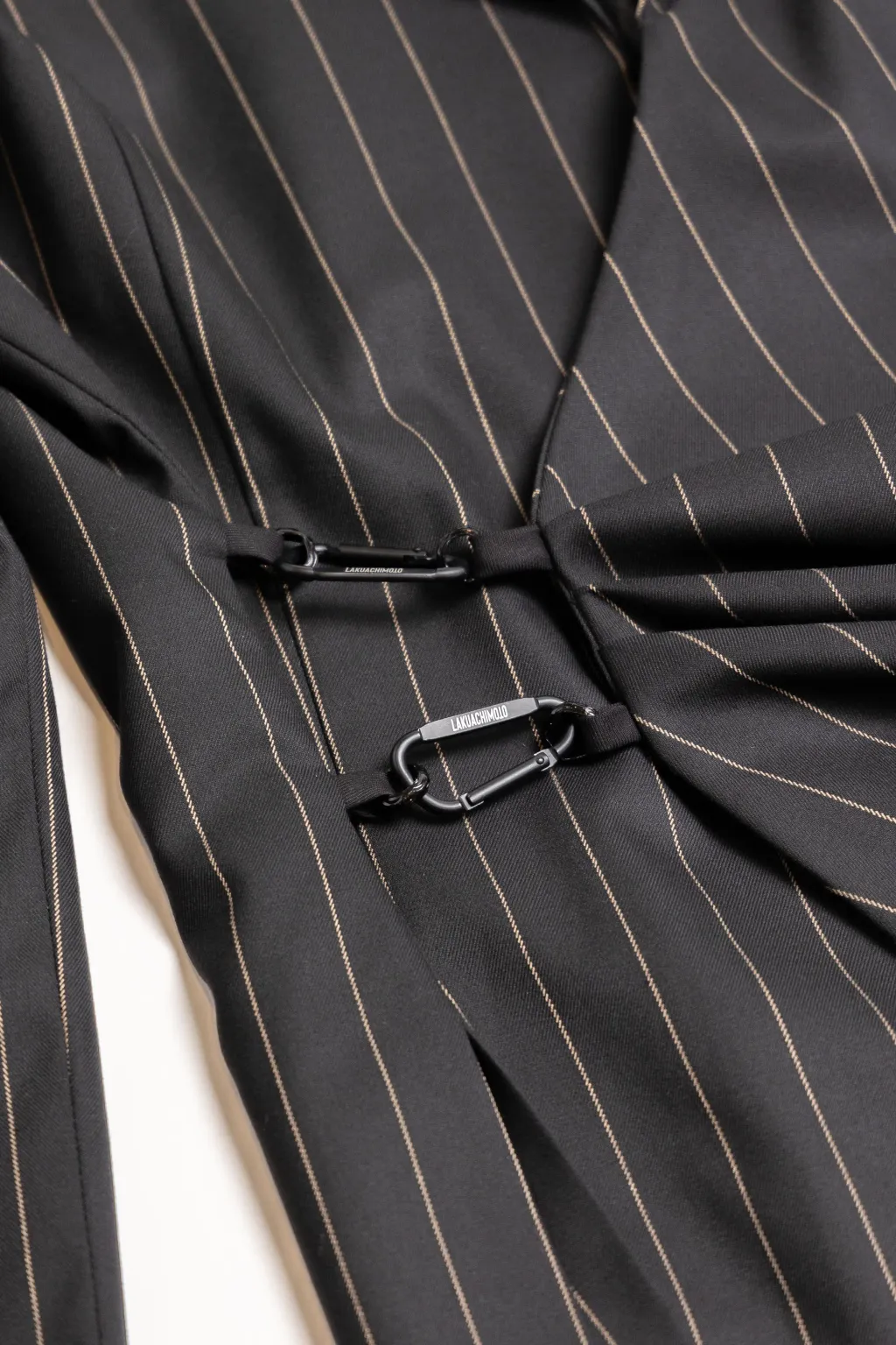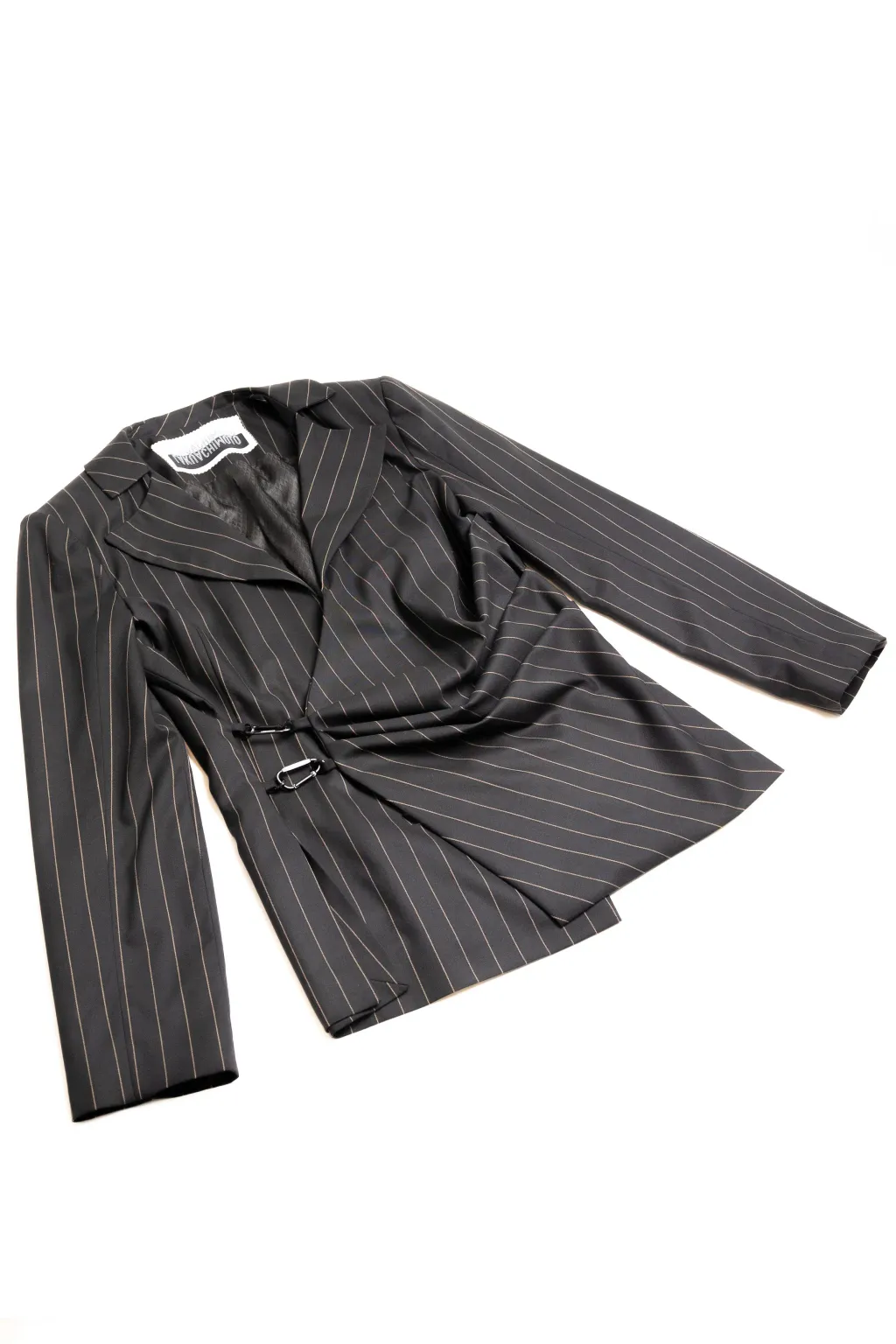Asymmetrical draped blazer with collar and lapel, featuring shoulder pads and logo-adorned clasps on both the inside and outside. Interior welt pocket. Side slits. Rayon lining throughout.