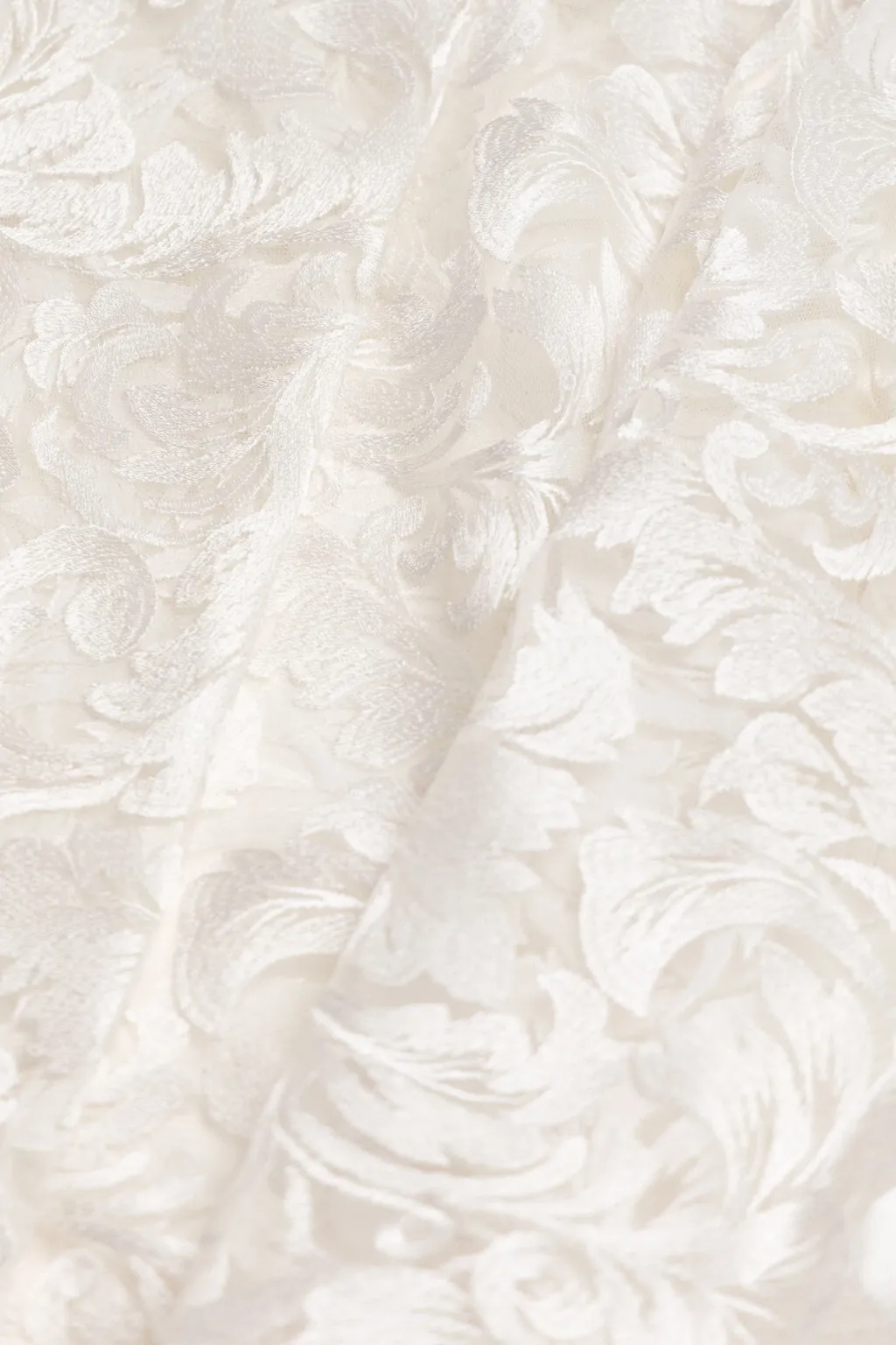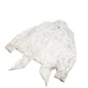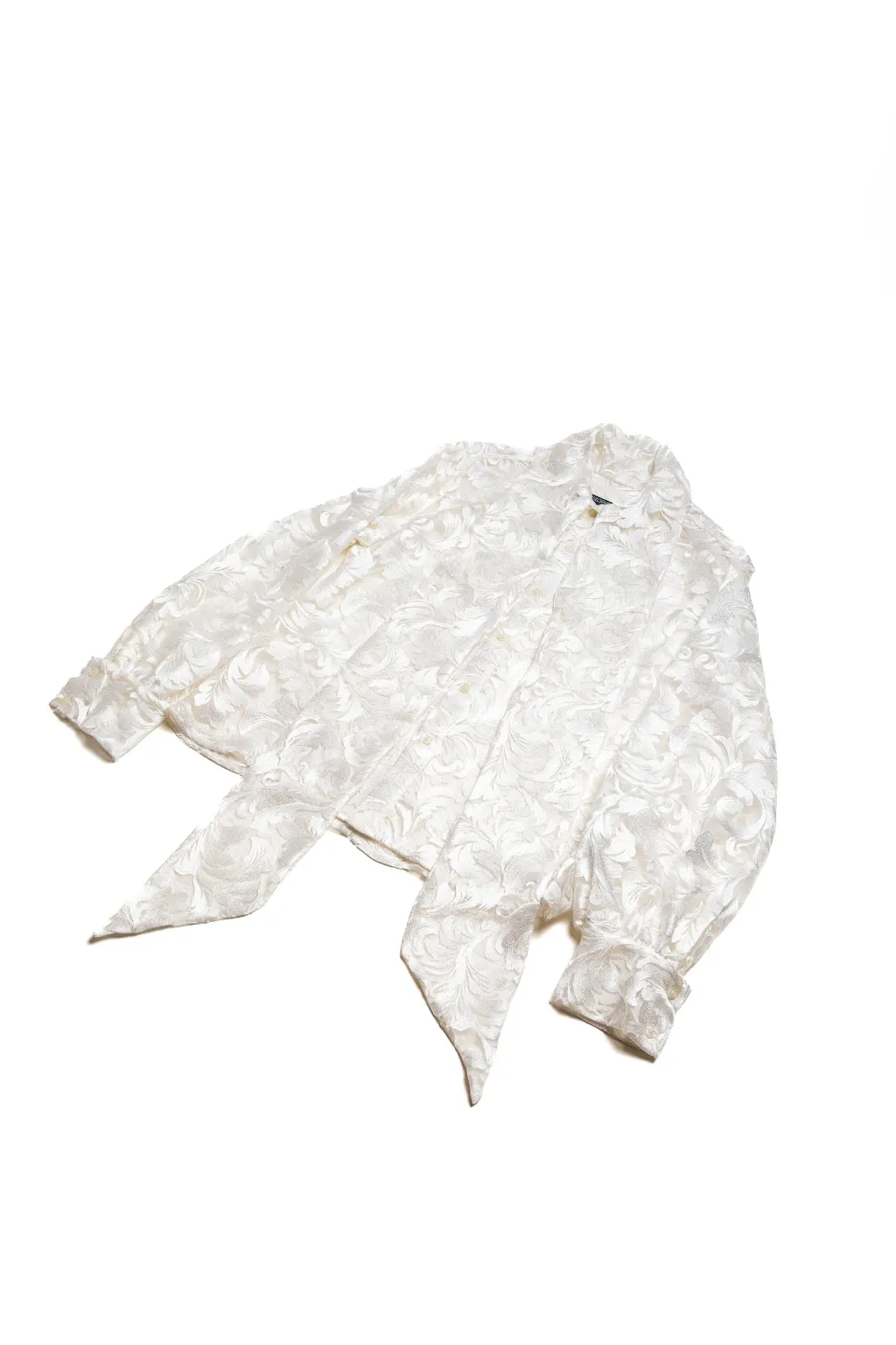 White lace shirt with scarf collar and two-button square cuffs, puffed sleeves gathered at cuffs and button closure.