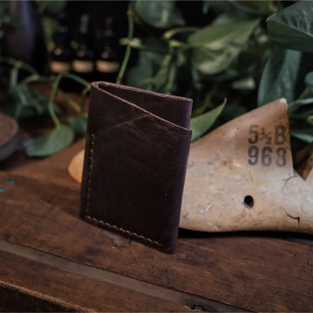 My minimalist cardholder is just what it sounds like: an easy, practical way to carry around your essentials. Handmade with care from a single piece of leather that wraps around itself to create three sleek little pockets. Elegant, but modest enough not to brag about it. Holds up to six cards.