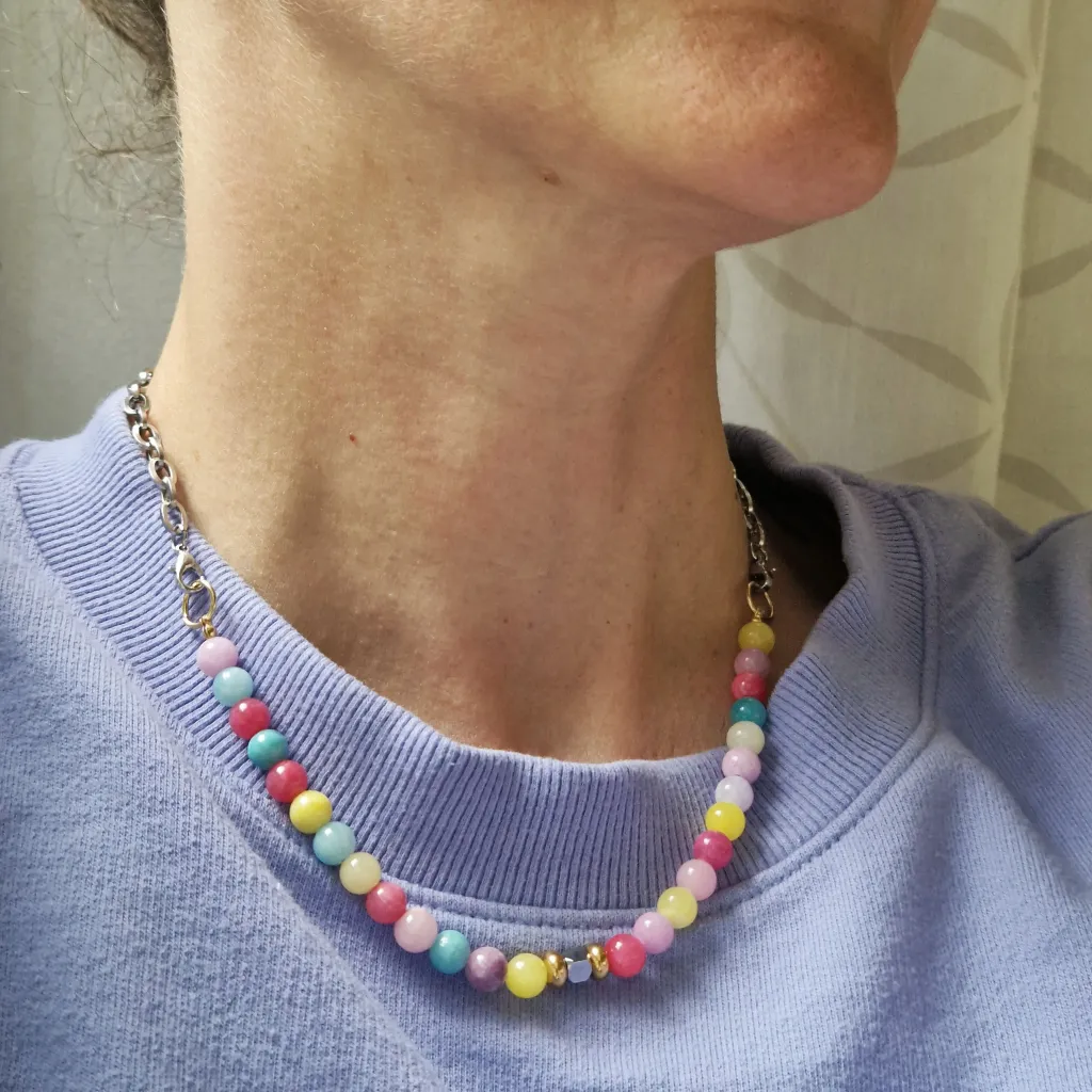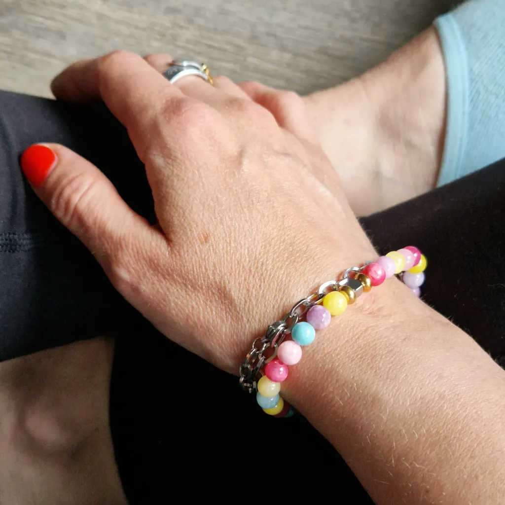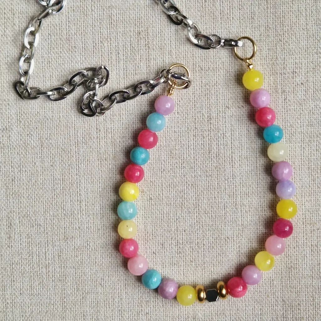 Poly features a stainless steel chain adorned with Caiyun jade beads, a gemstone of rare beauty meaning "Colorful Cloud" in Chinese!