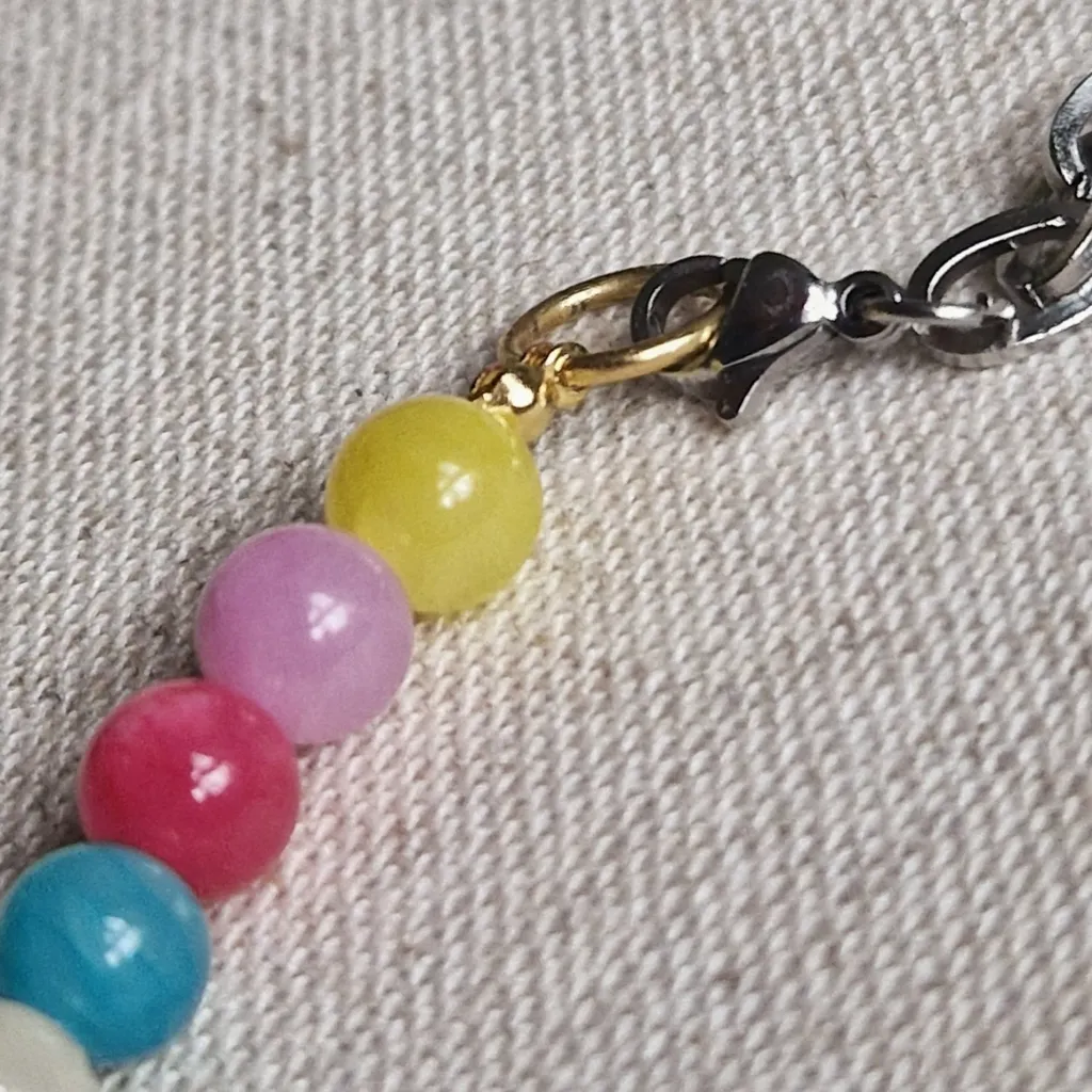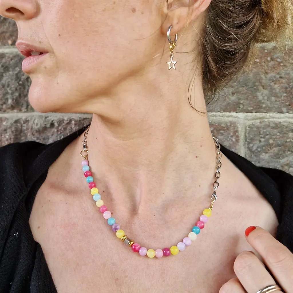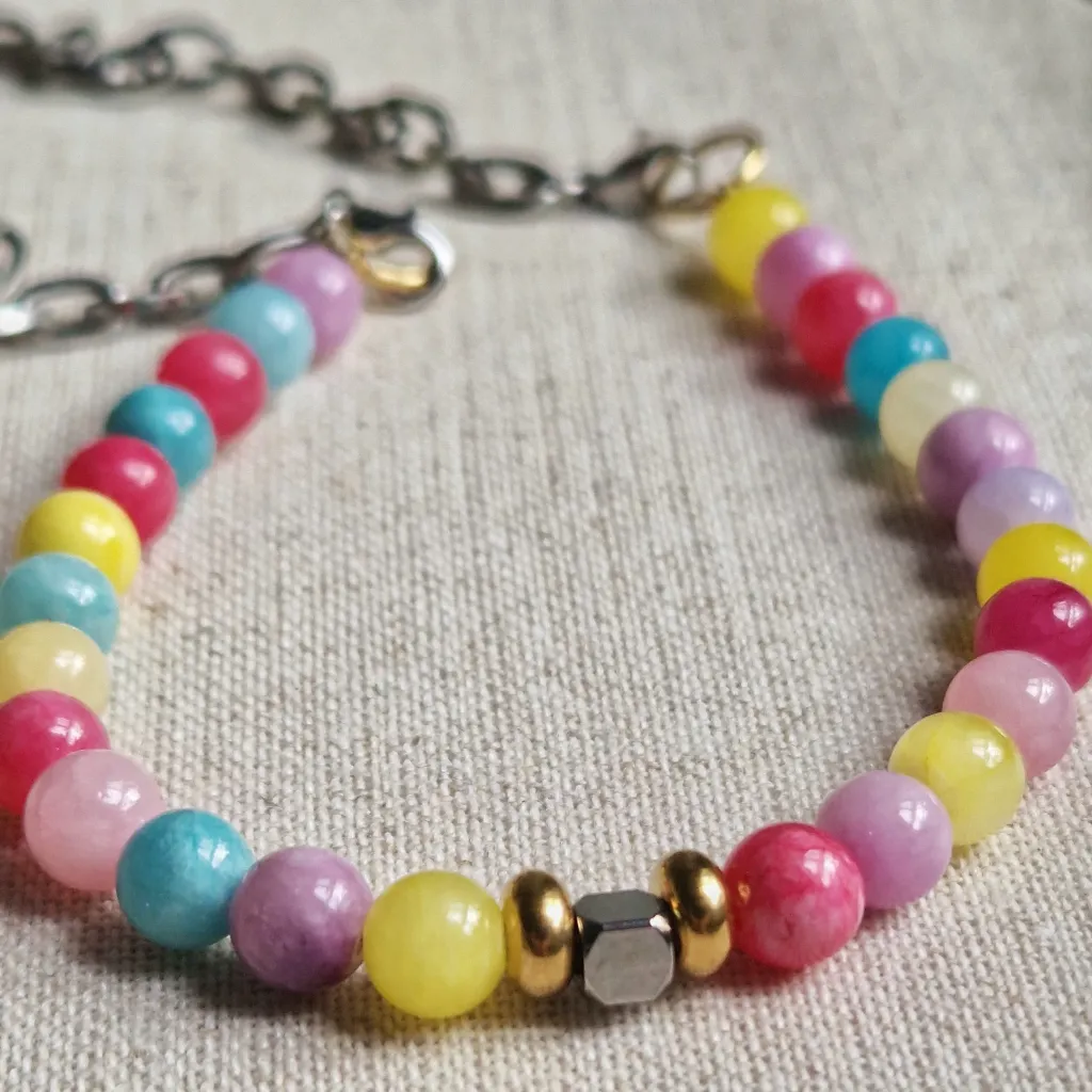 Poly features a stainless steel chain adorned with Caiyun jade beads, a gemstone of rare beauty meaning "Colorful Cloud" in Chinese!
