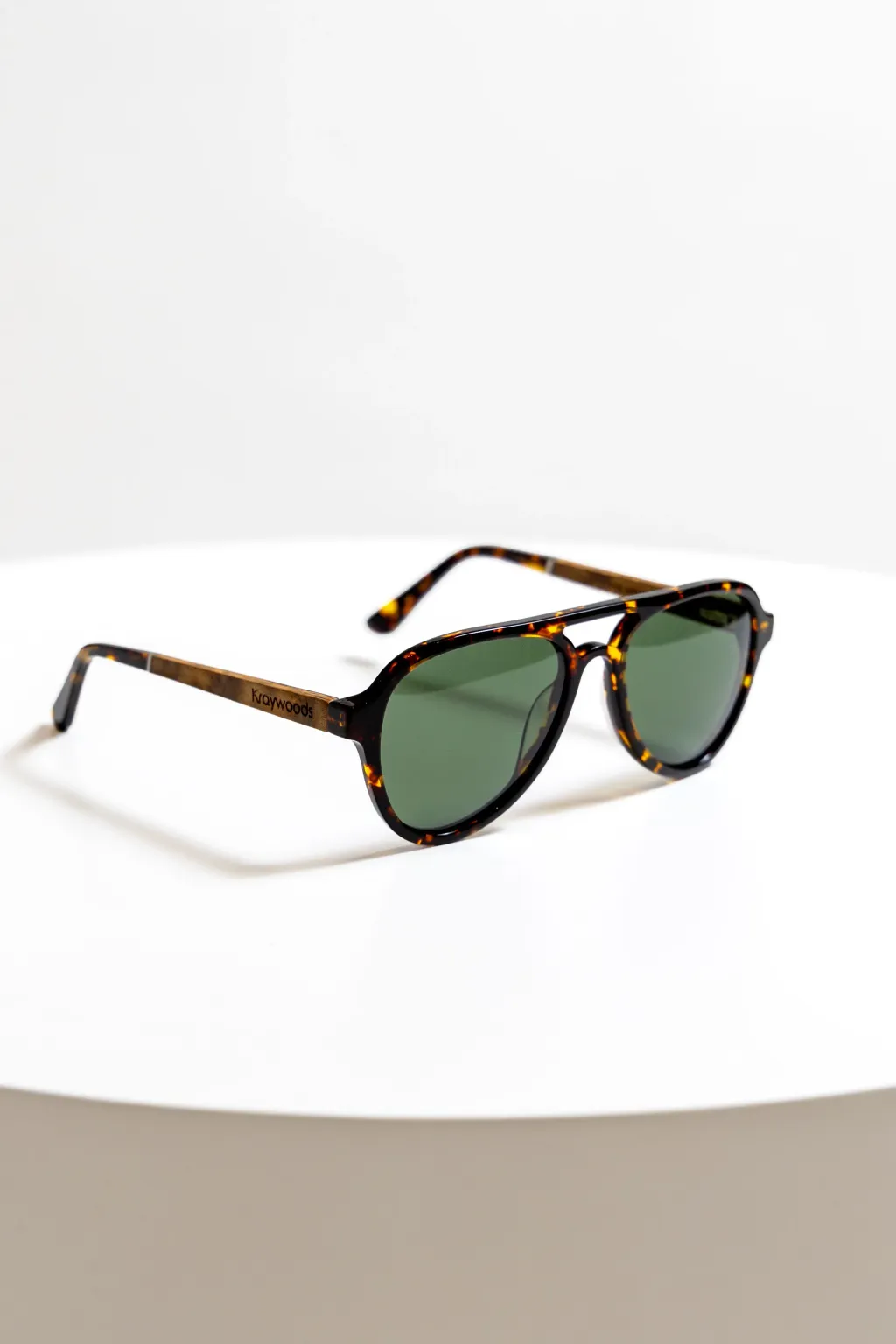 Elevate your style with these ultra-chic aviator sunglasses! Boasting a tortoise double-bridge frame and slim Burl Wood arms, these tortoise aviator sunglasses exude luxury and sophistication. The retro-inspired design is enhanced by the dark green polarized lenses, which not only add an alluring touch, but also offer full protection from the sun's harmful rays.