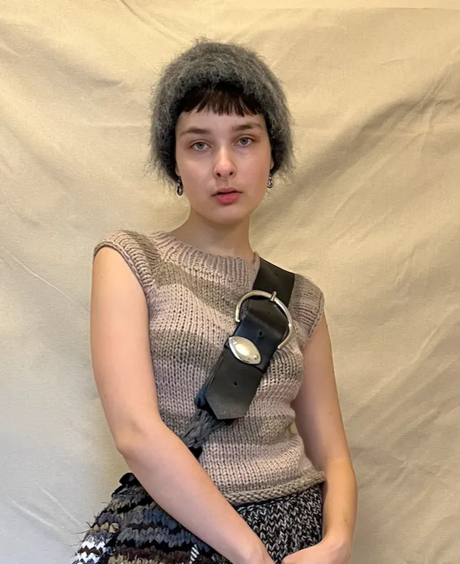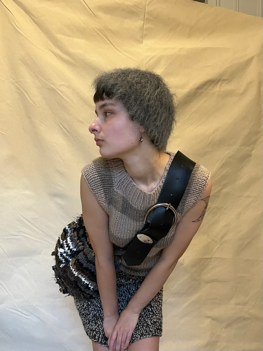 Hand knitted hat with a yarn composed of 30% mohair, 25% wool and 45% acrylic. The wool is then brushed to create this fuzzy, fibrous effect.