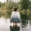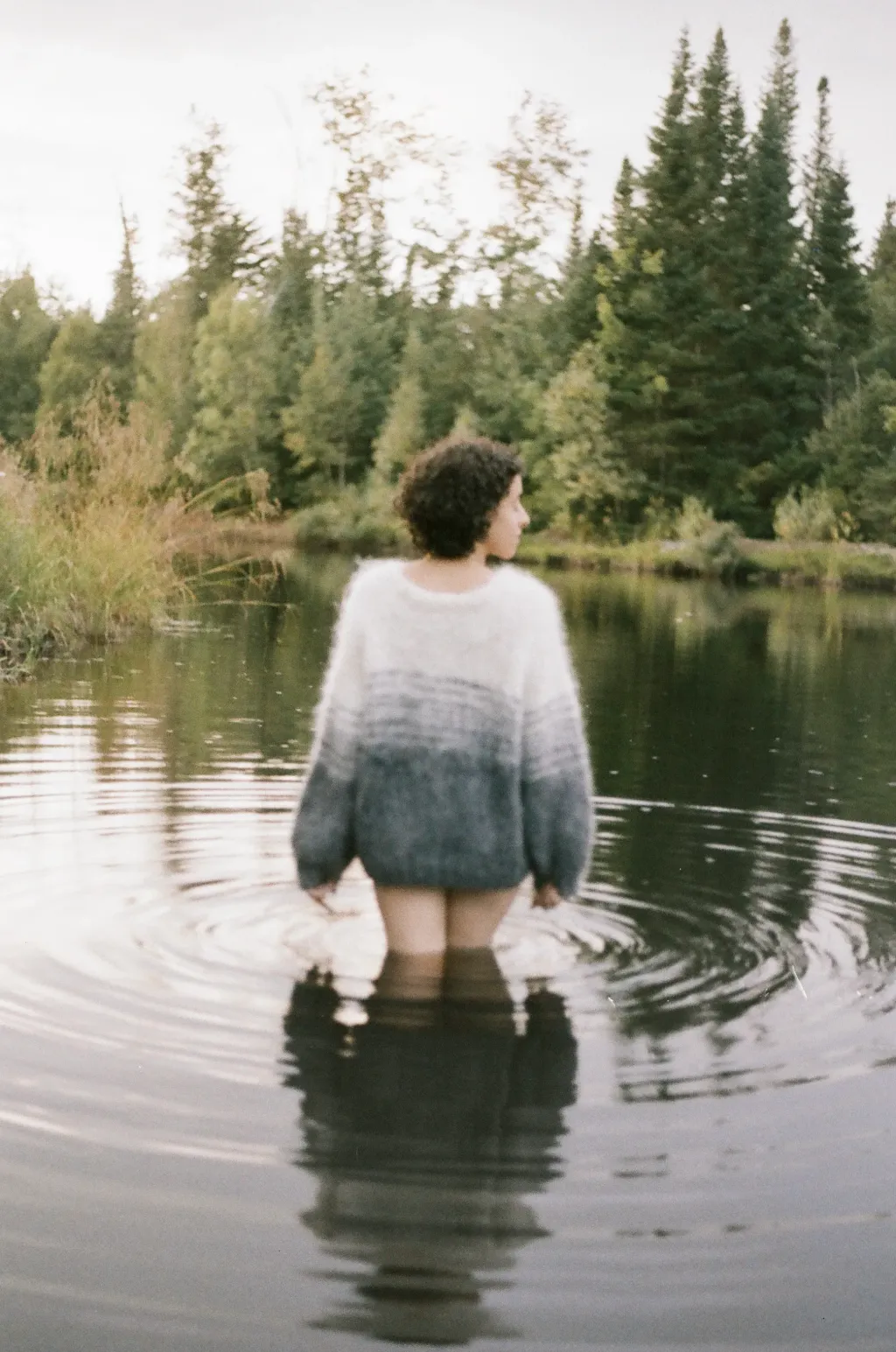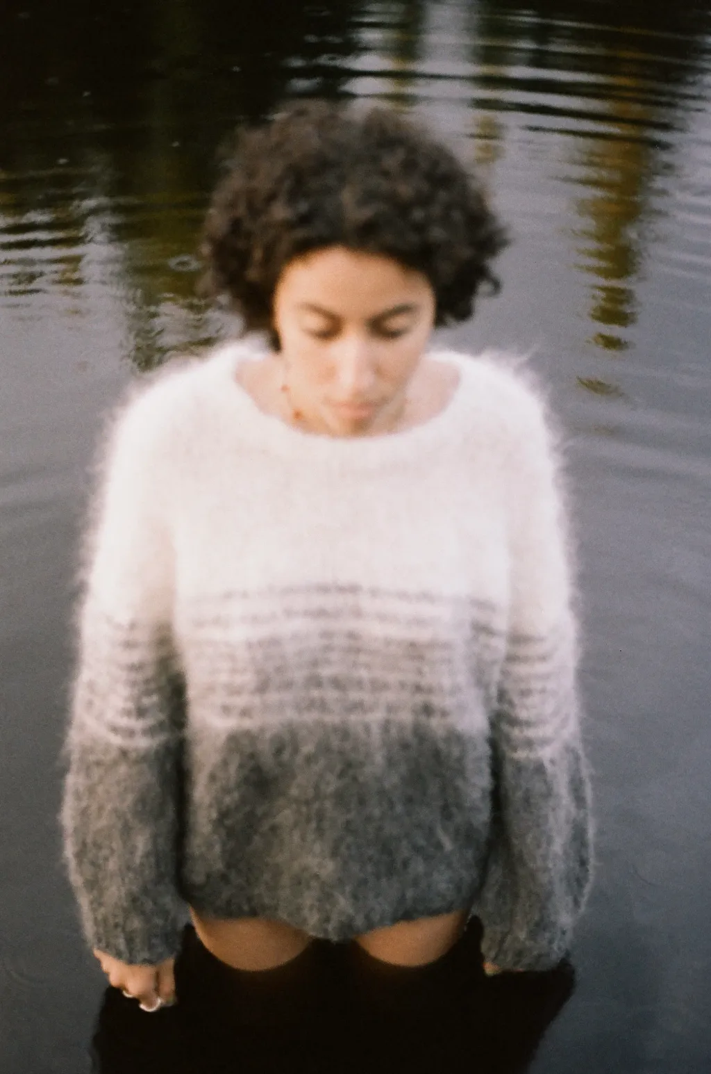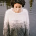 This sweater is hand knitted with hand dyed mohair/wool/nylon yarn. It was then brushed to create this fuzzy and fibrous effect.
