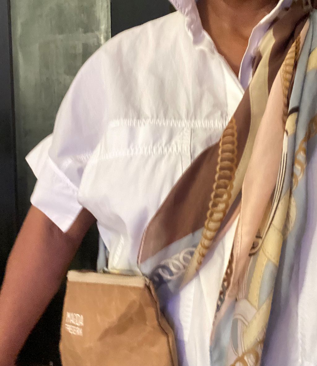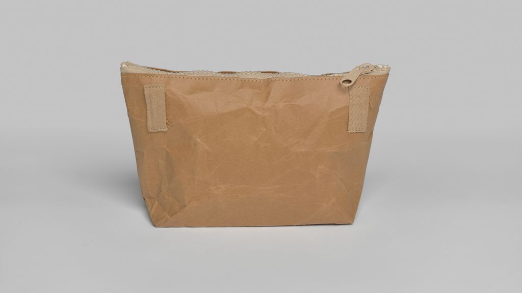 Made of washable paper, this versatile bag can be worn around the waist or as a shoulder bag with a scarf, allowing you to express your personal style.
