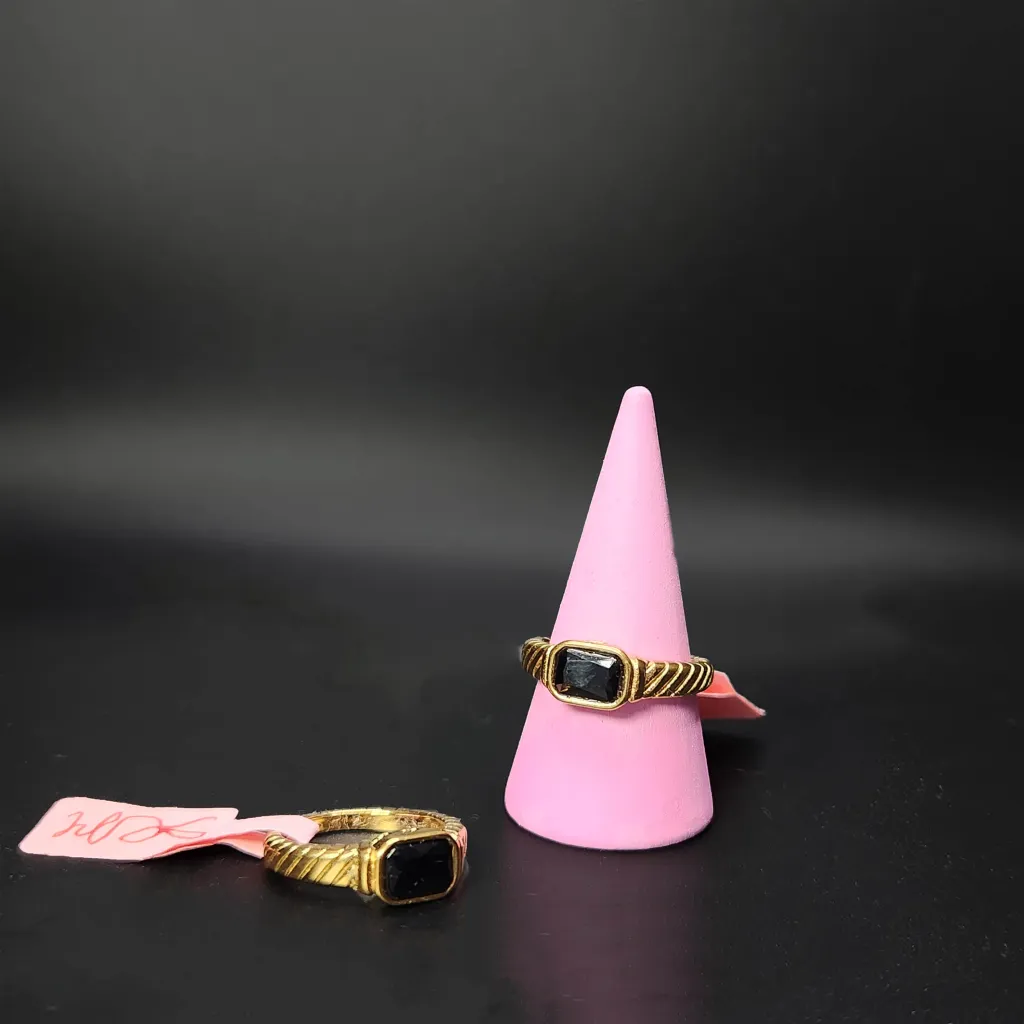 Gold-colored stainless steel ring, adorned with a central black stone and a detailed band.