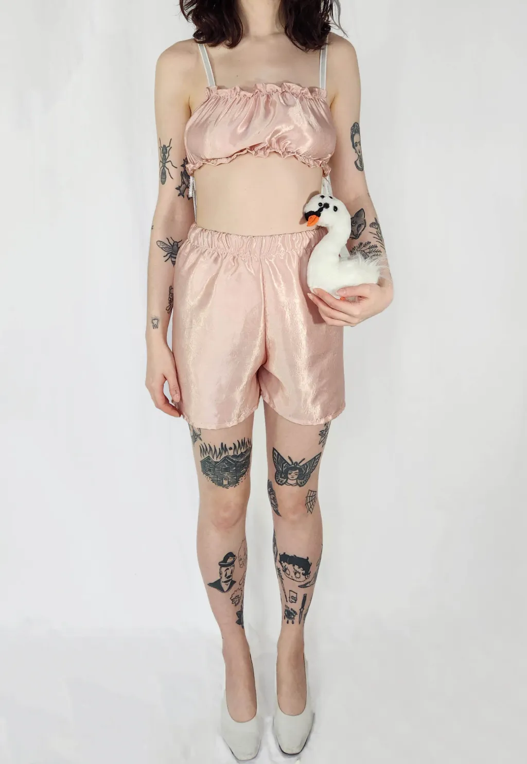 Discover our set of pink satin lingerie, an adorable and romantic choice for all occasions. Designed with elastic adjustments for optimal comfort, this set also features adjustable straps on the top to accommodate different bust sizes. Enjoy soft comfort and irresistible style with this feminine and trendy lingerie set.