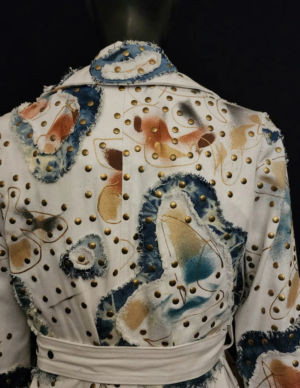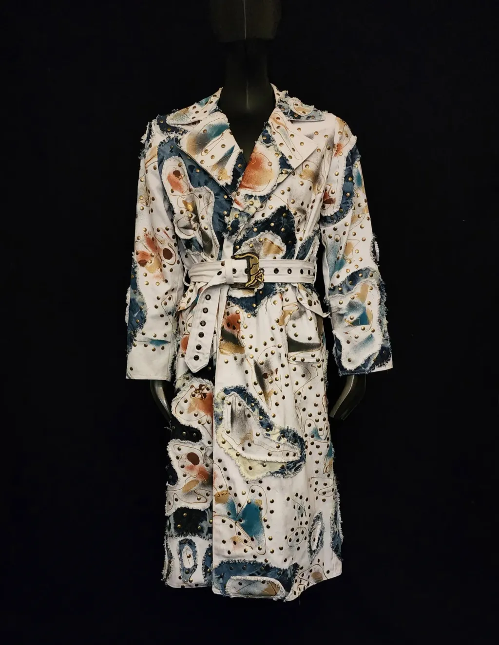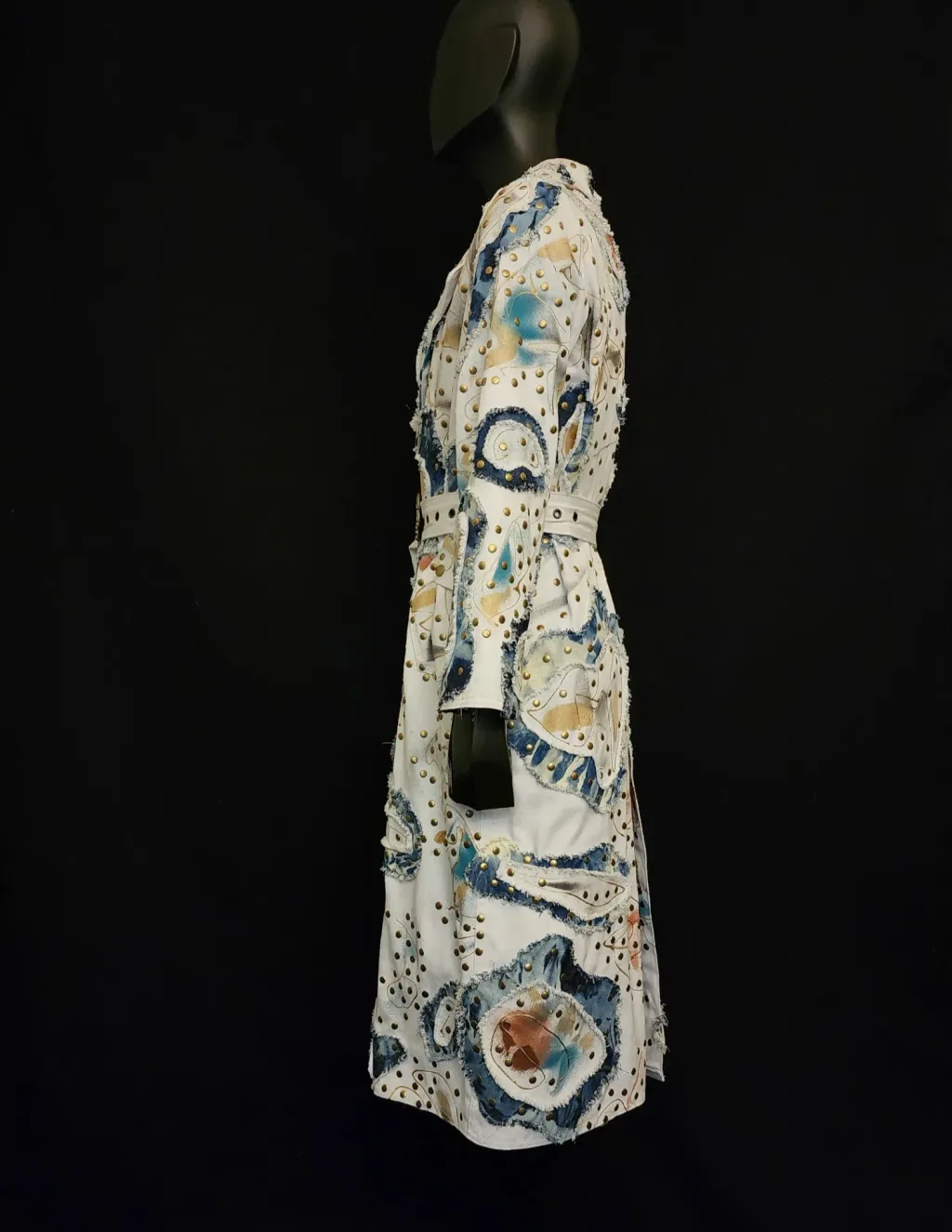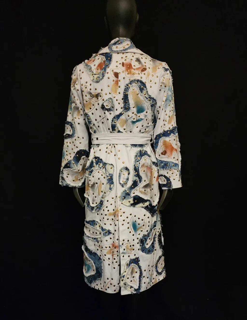 White denim trench coat hand painted by artist Dominique Préfontaine. The coat is embellished with multiple hand bleached denim patches and finished with over 1500 rivets.