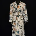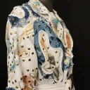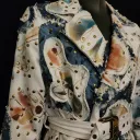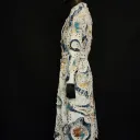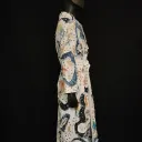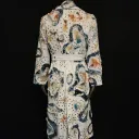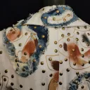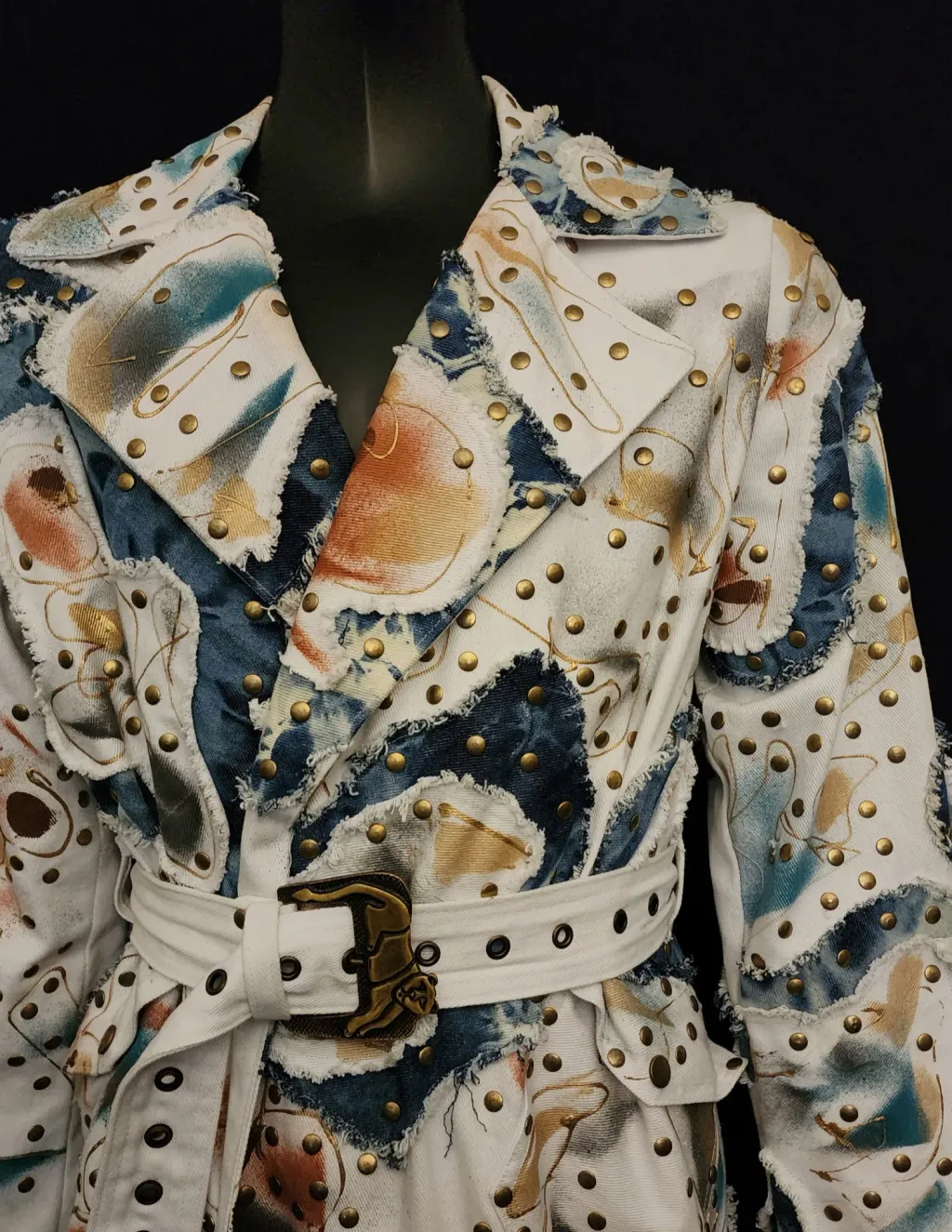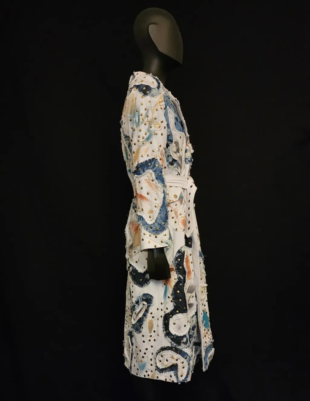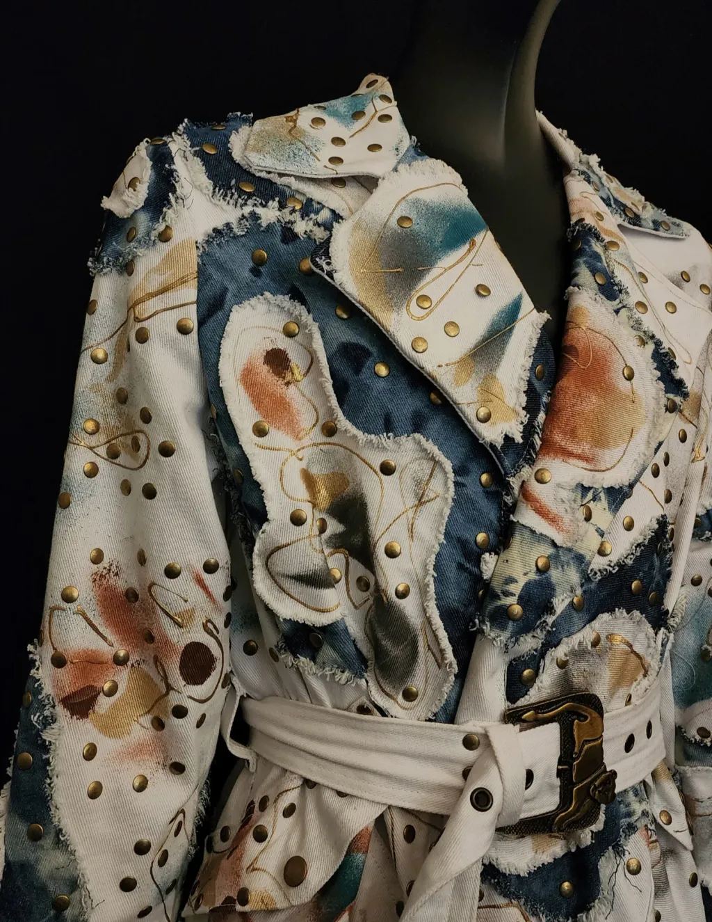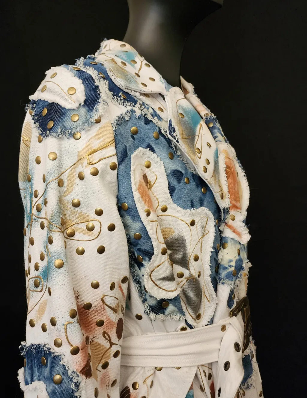 White denim trench coat hand painted by artist Dominique Préfontaine. The coat is embellished with multiple hand bleached denim patches and finished with over 1500 rivets.