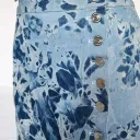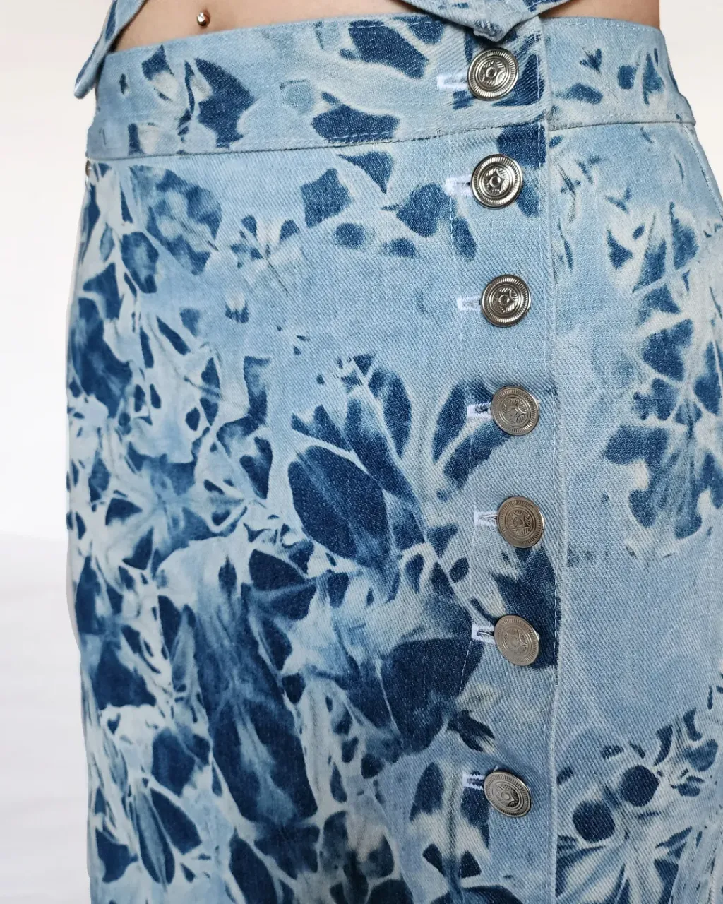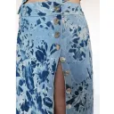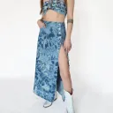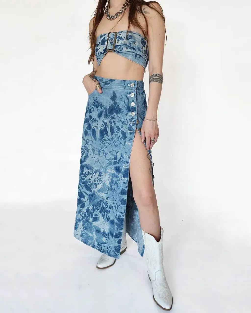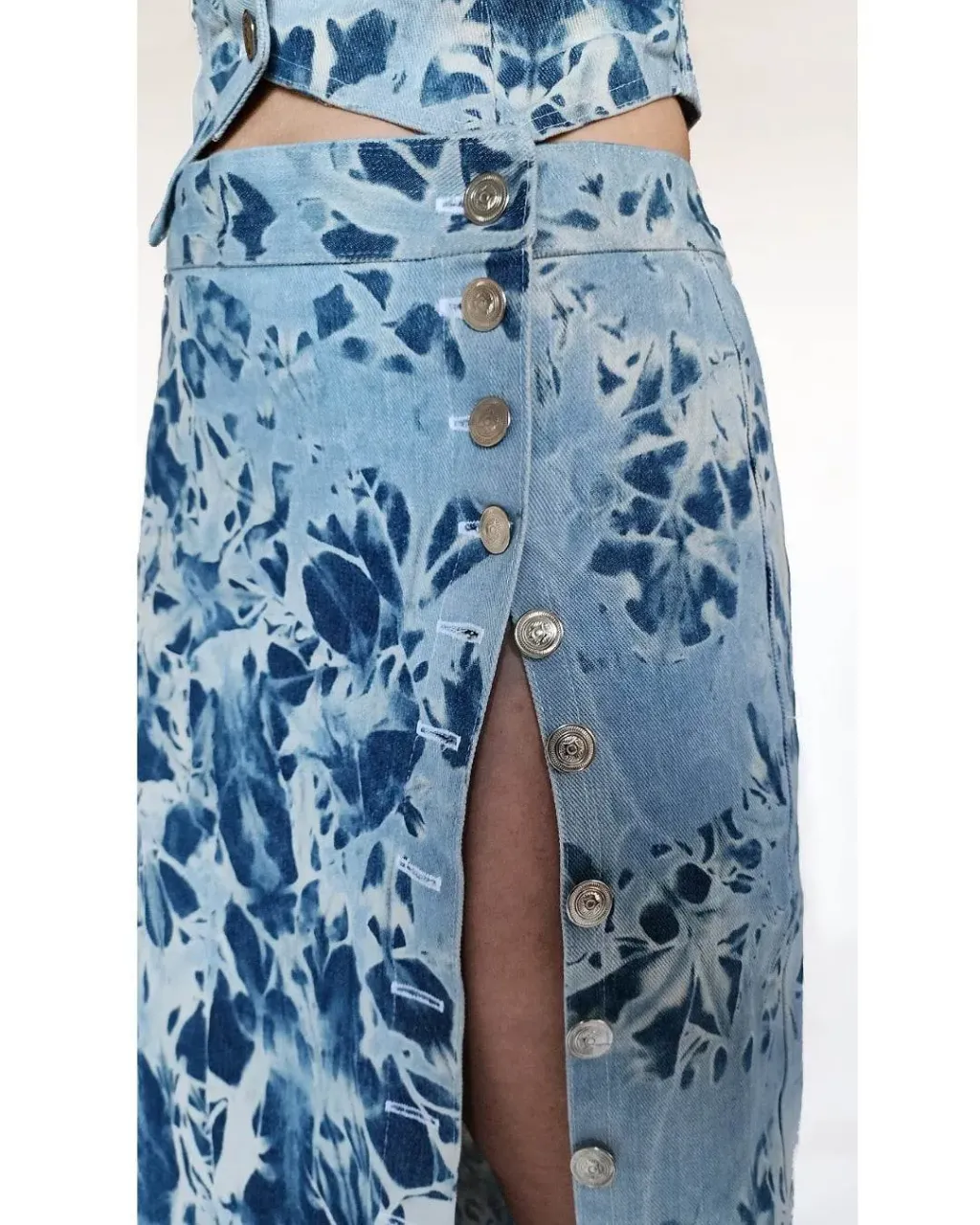 Maxi denim skirt with side pocket and adjustable slit with jean button closure.