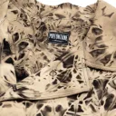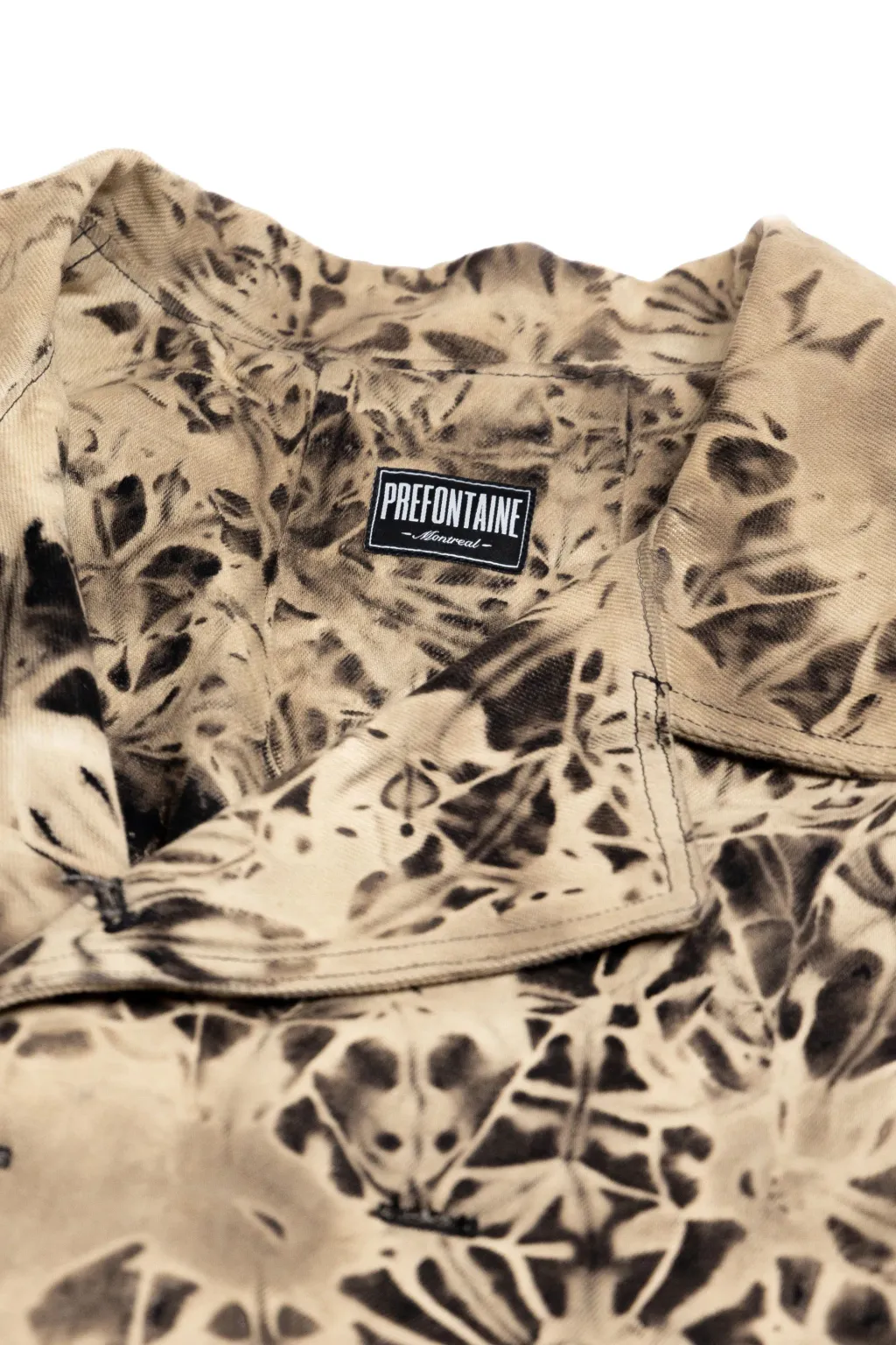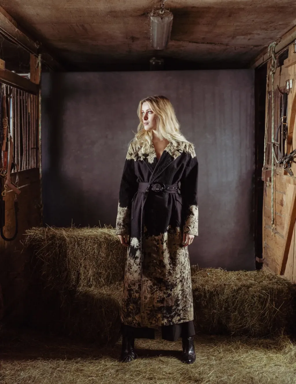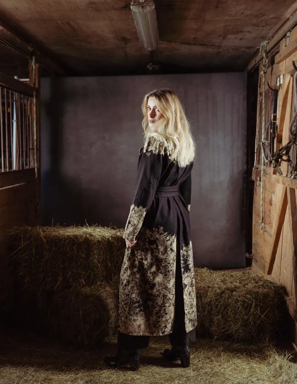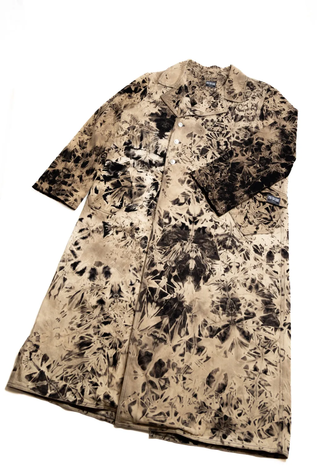 Classic cut trench coat in black denim, hand bleached to create unique patterns. Choose without a belt for a loose fit or with a belt for a cinched waist.