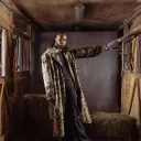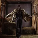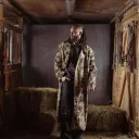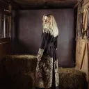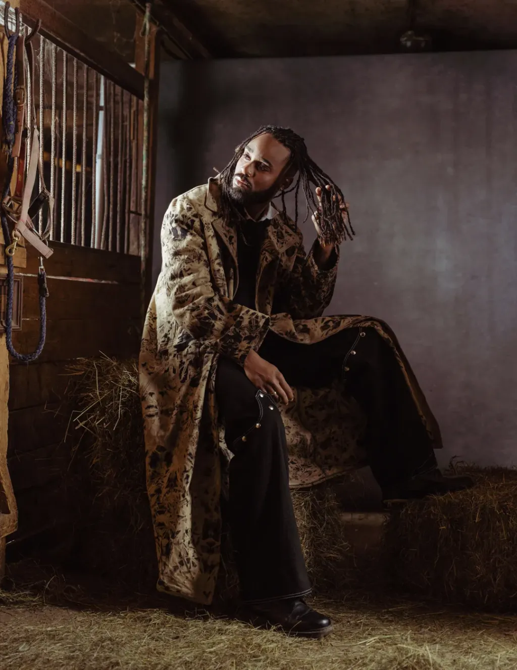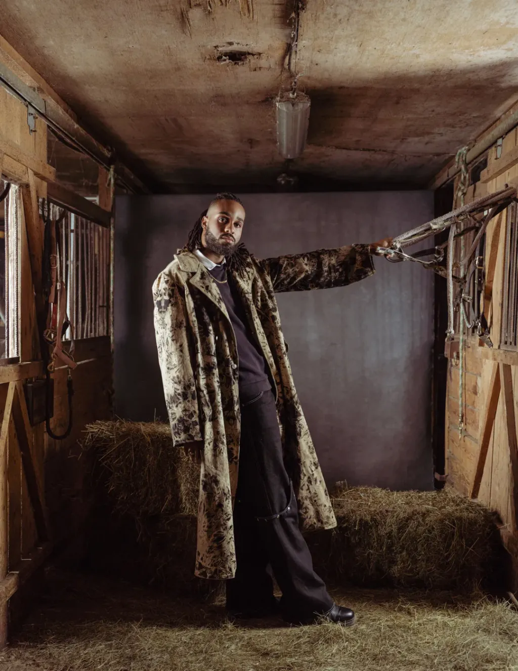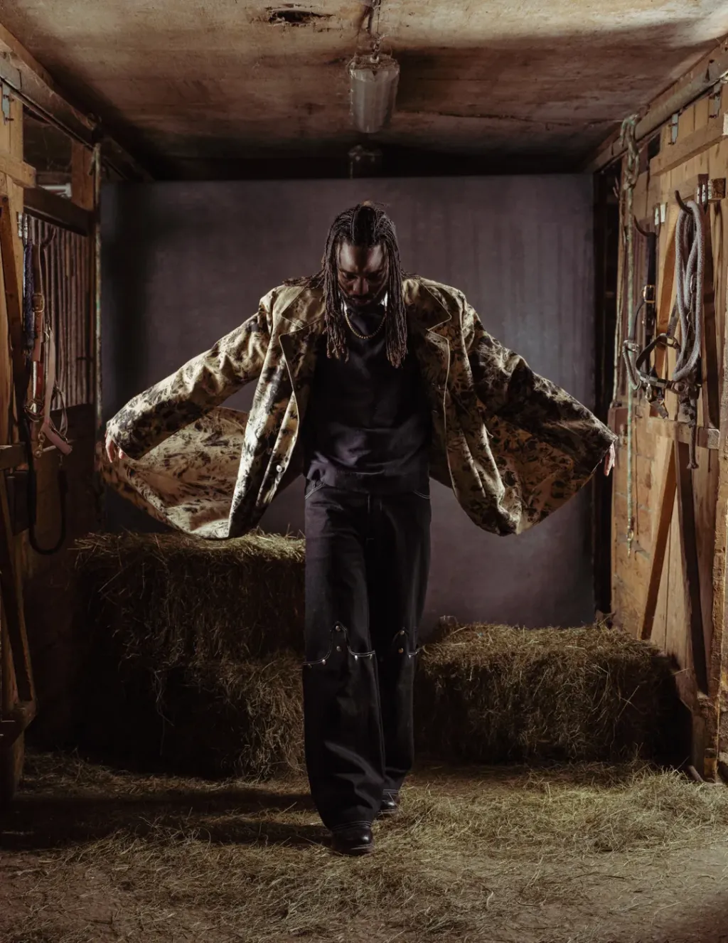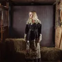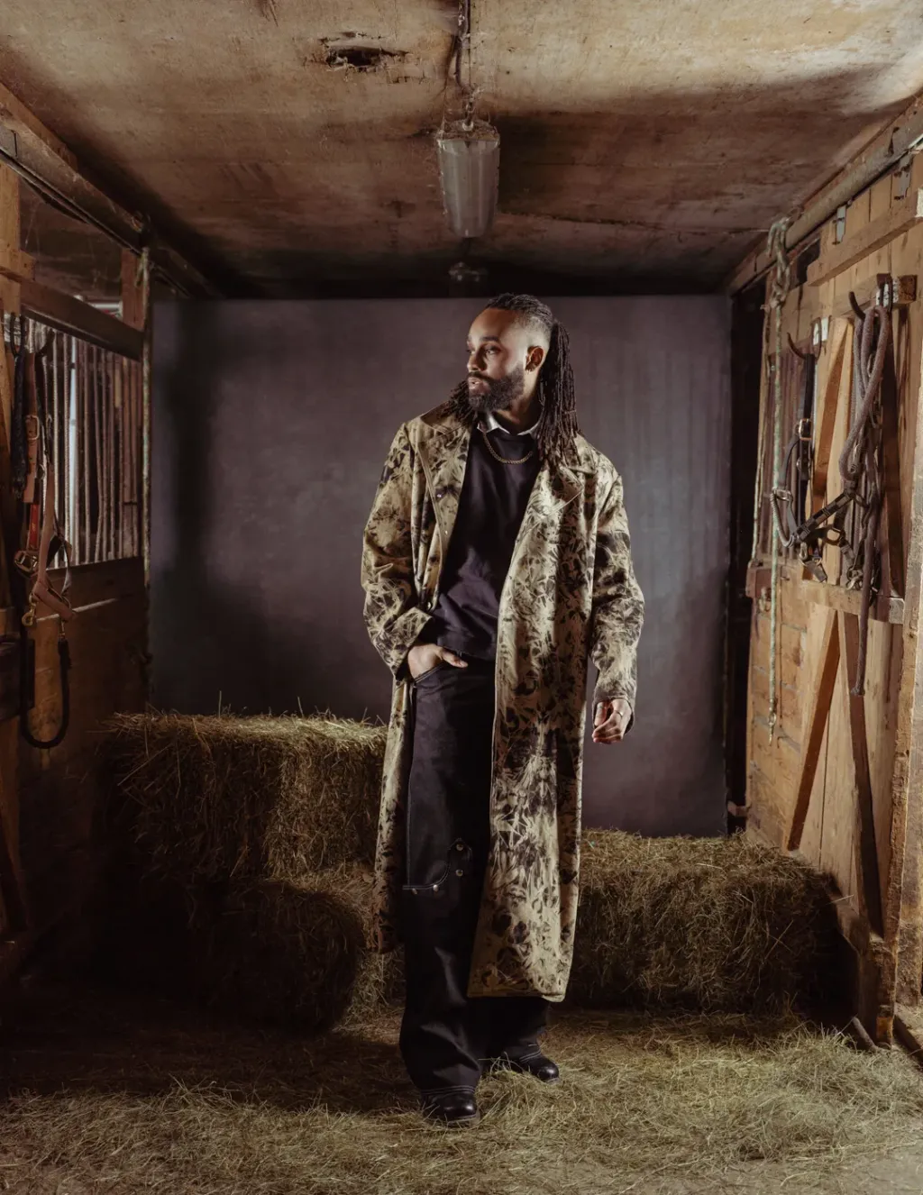 Classic cut trench coat in black denim, hand bleached to create unique patterns. Choose without a belt for a loose fit or with a belt for a cinched waist.