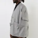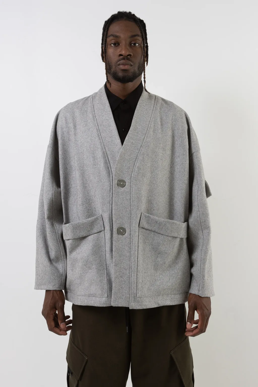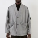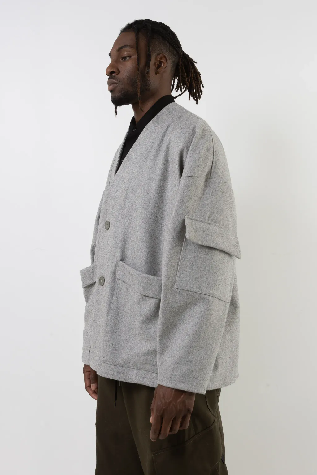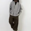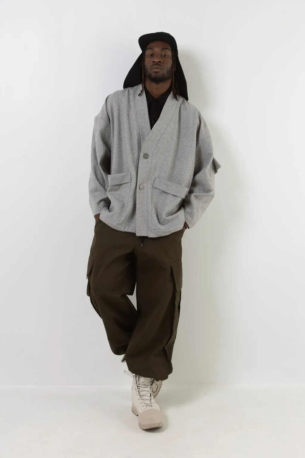 Merino wool cardigan with dual entry patch pockets and pocket on sleeve.