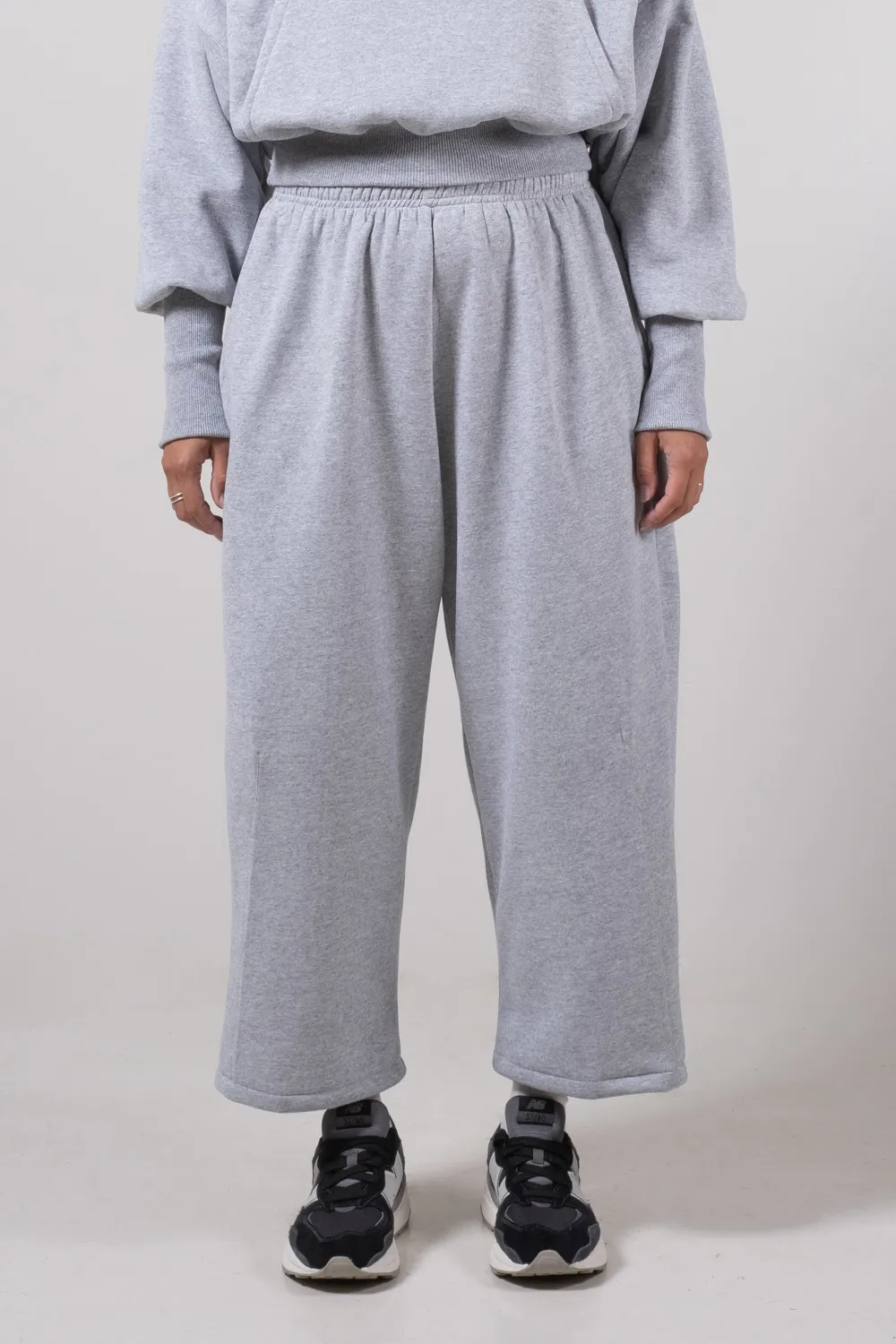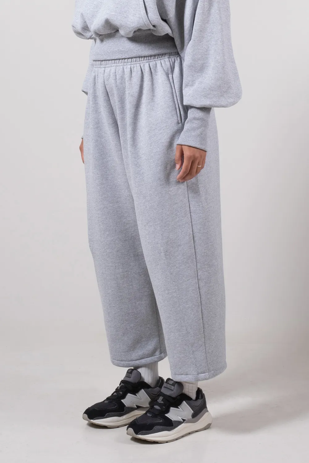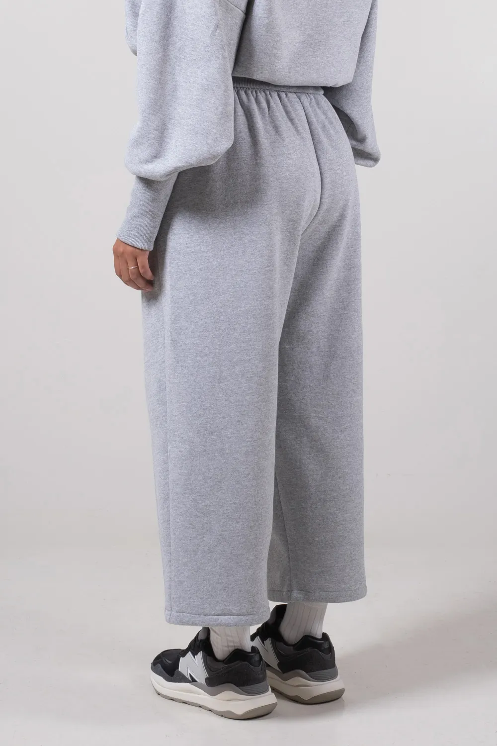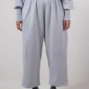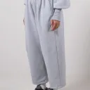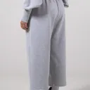 Wide leg cropped joggers with elastic waistband and drawcord. Side seam pockets and knee dart detail from bottom hem. This item is oversized, we recommend choosing one size down for a more fitted look.