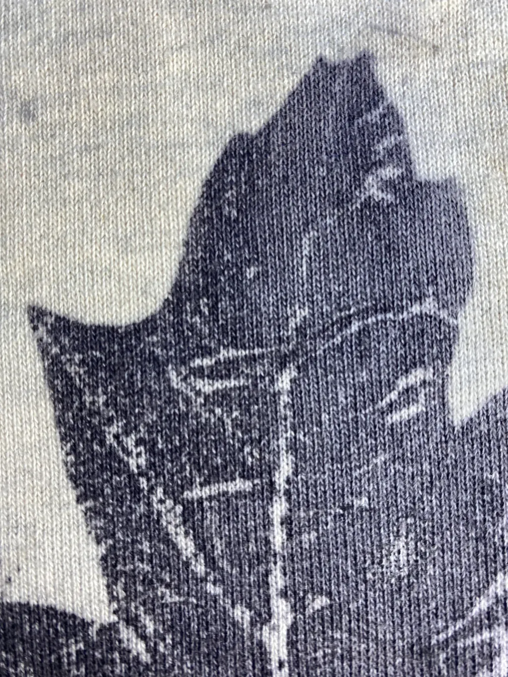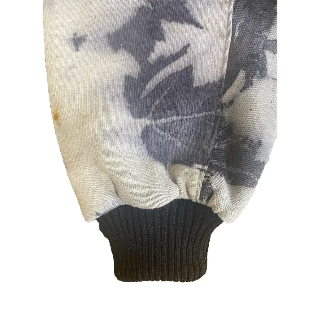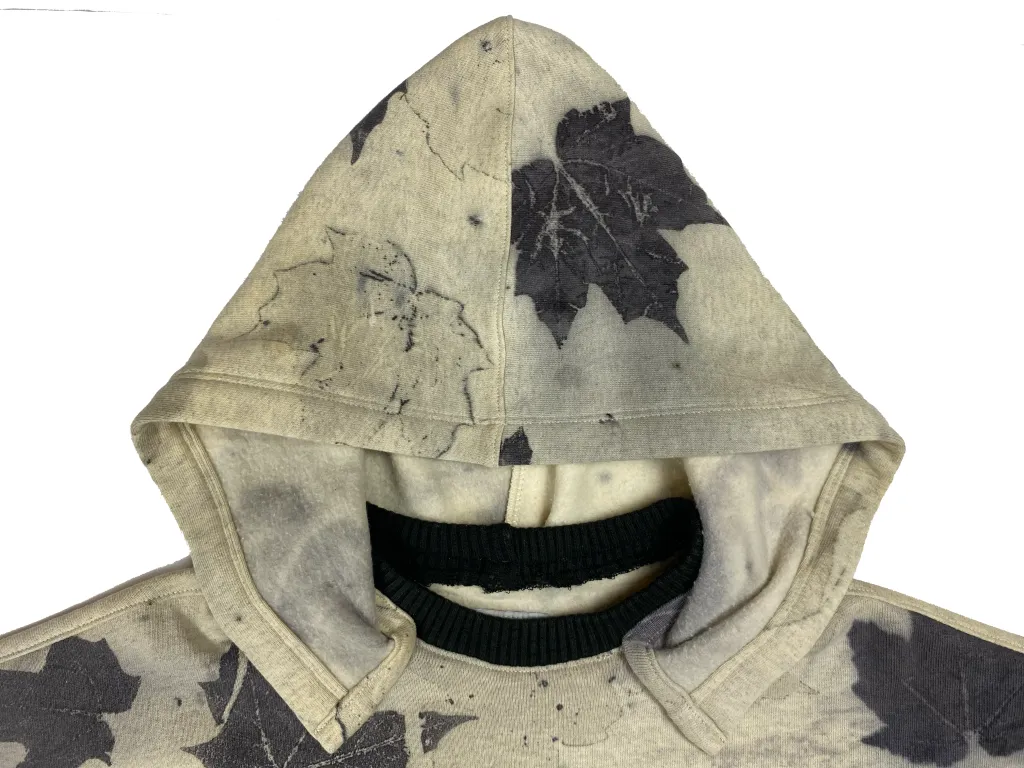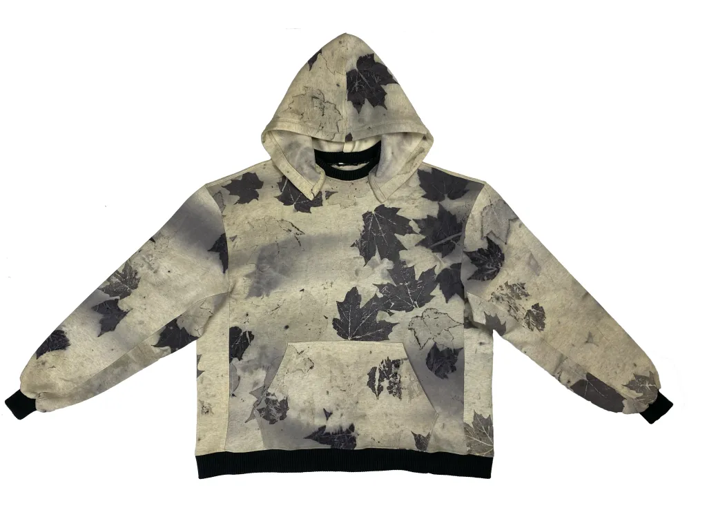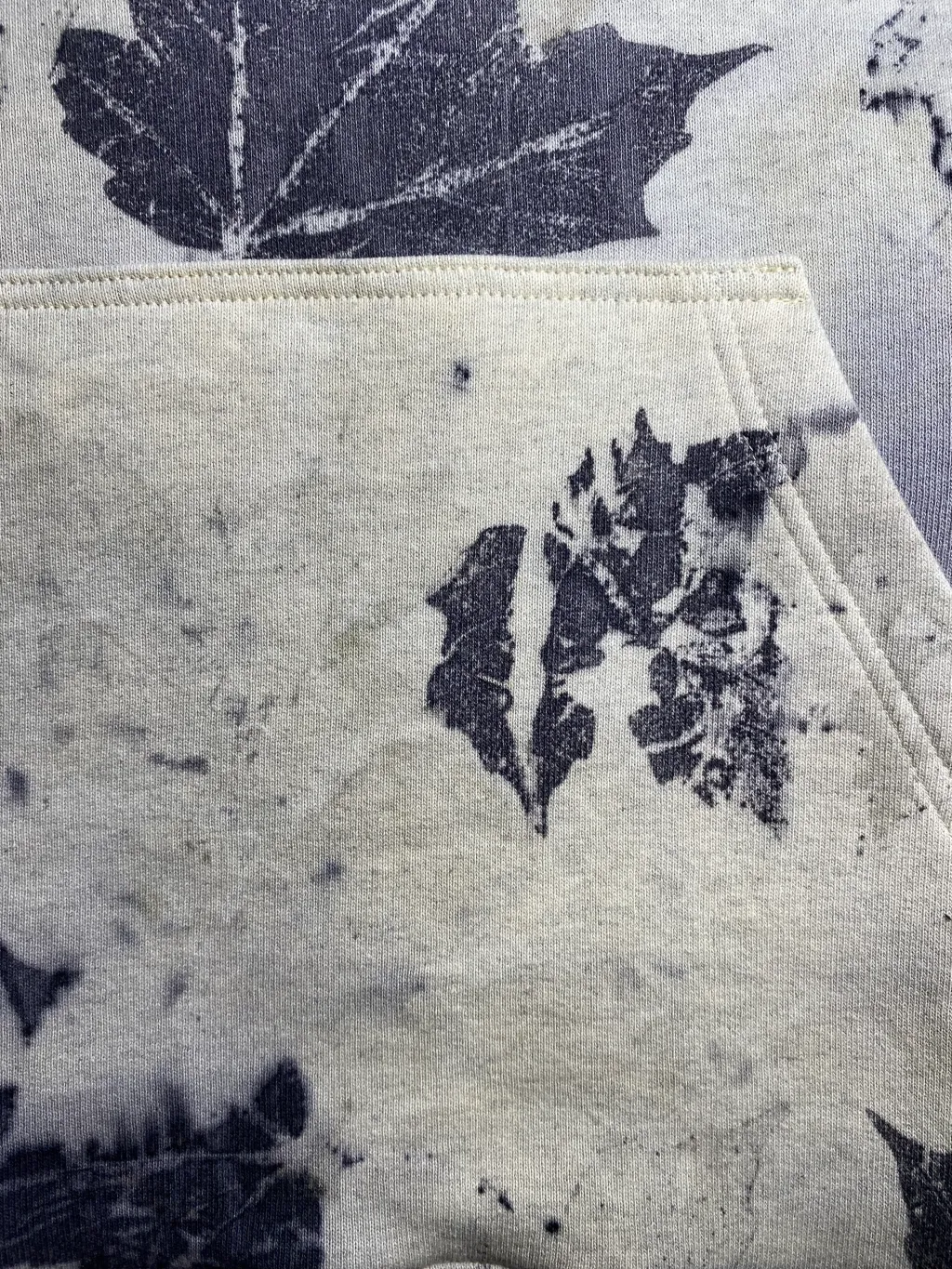 Made of cotton fleece (100% cotton) and printed using the Eco-print technique. This technique is a plant printing process by which leaves of trees (or other plants) are printed on the fabric. The result obtained is different from one time to the next and generates images that are both figurative and abstract, like a very unique camouflage.